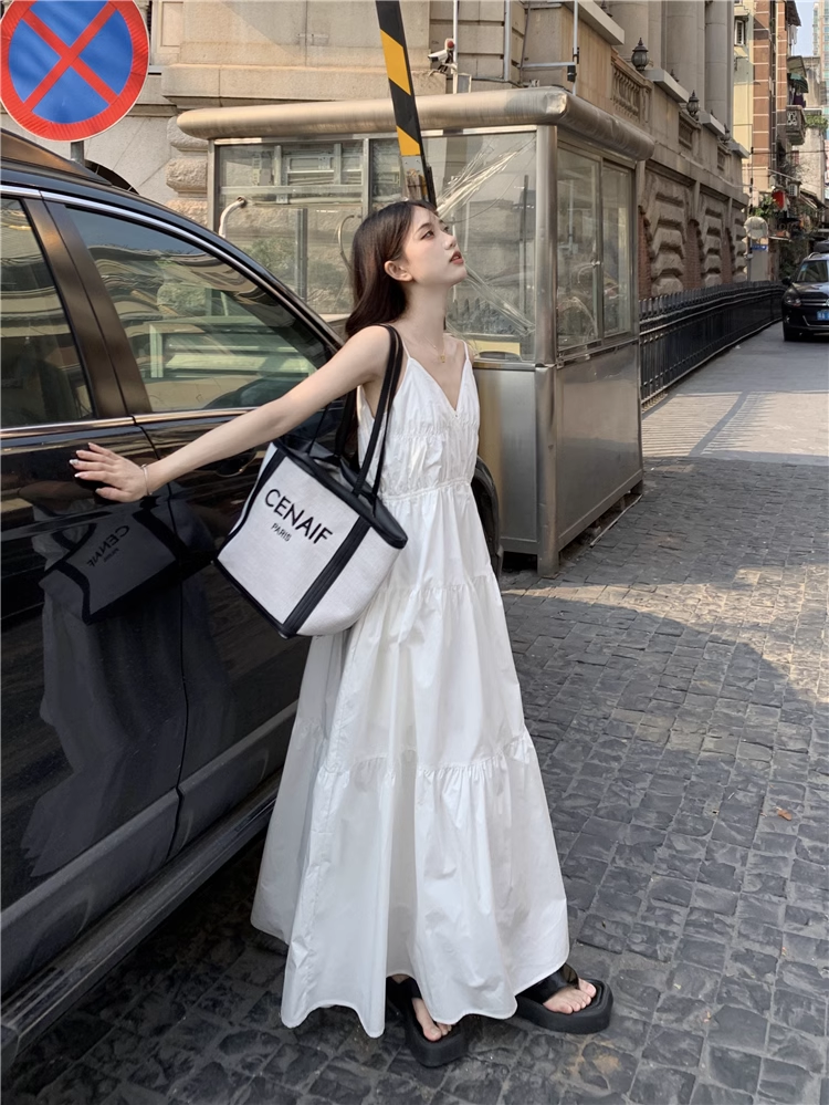 A-line V Neck White Dress