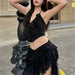BXOXO 2 Piece Set Women Summer Lace-Up Low-Neck Multi-Layered Lace Collarmini Tops+Tassel Skirt Multilayer Irregular Hem Suit