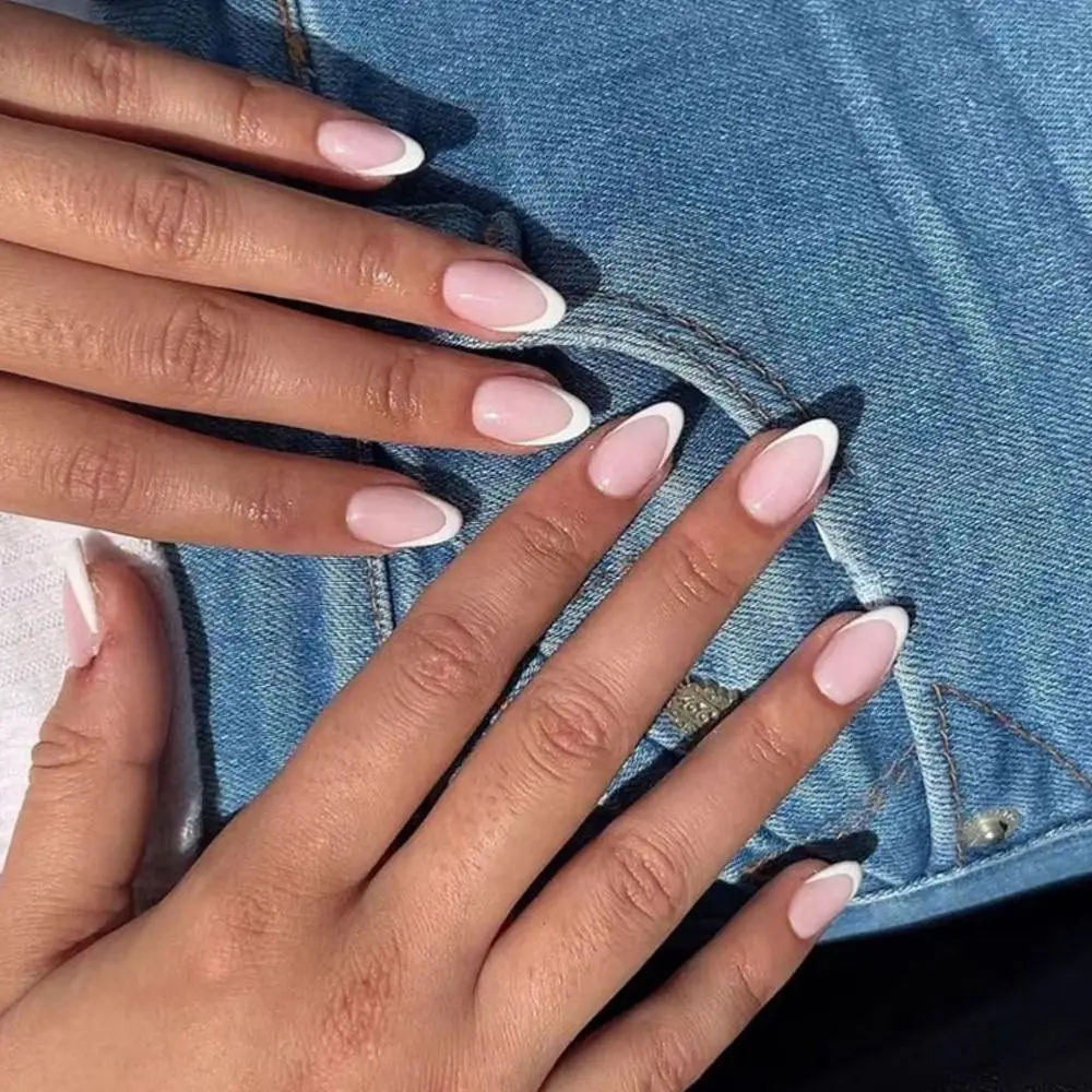 24P French Oval False Nails Girls White Edge Design Nude Color Wearable Press on Nail Full Cover Short Acrylic Almond Fake Nails