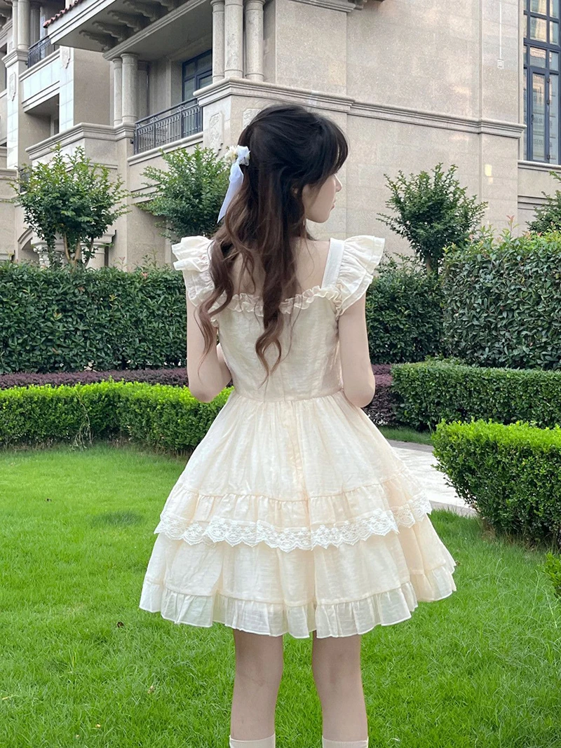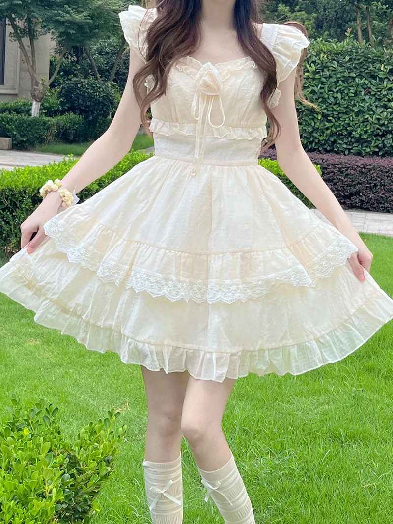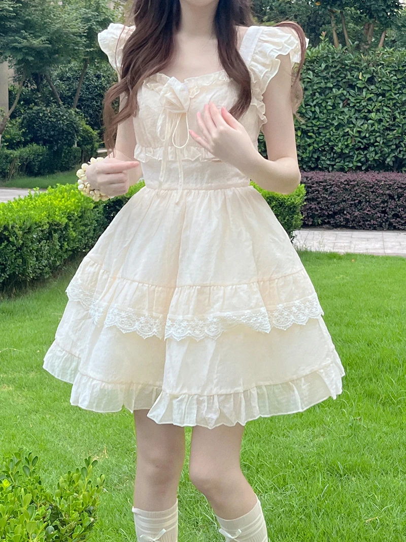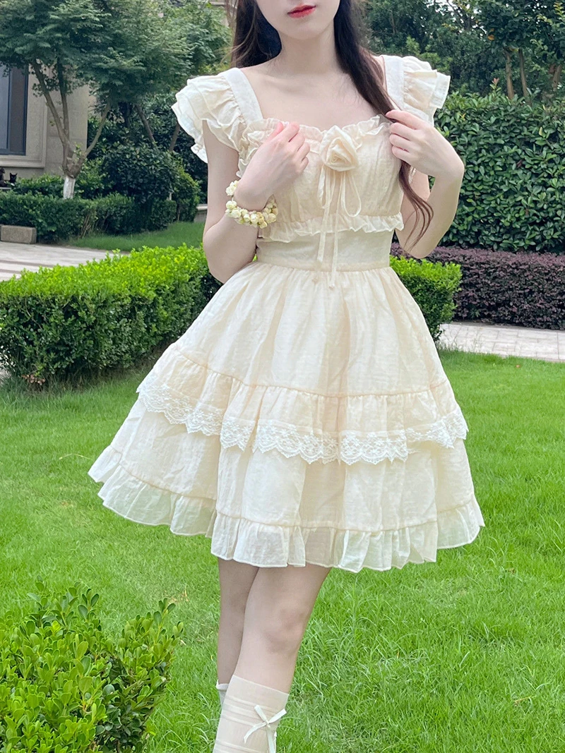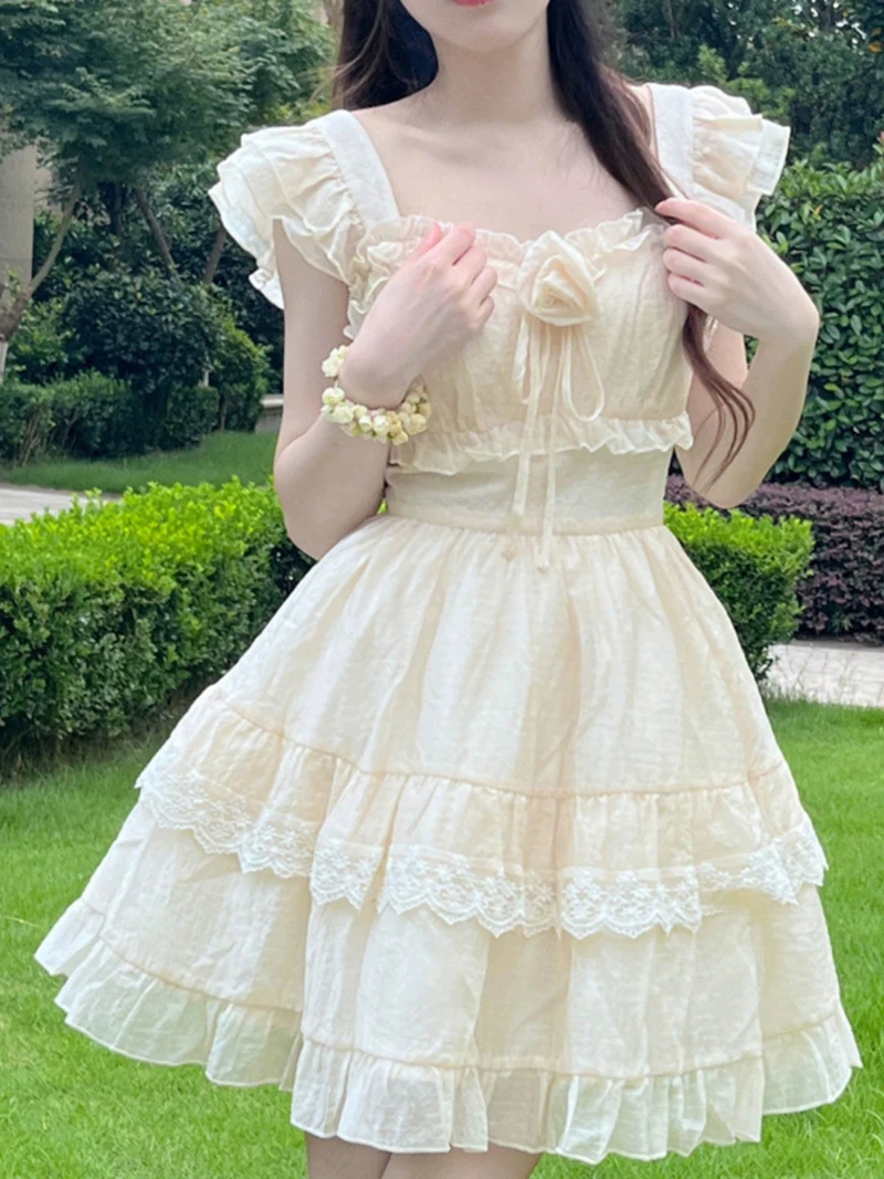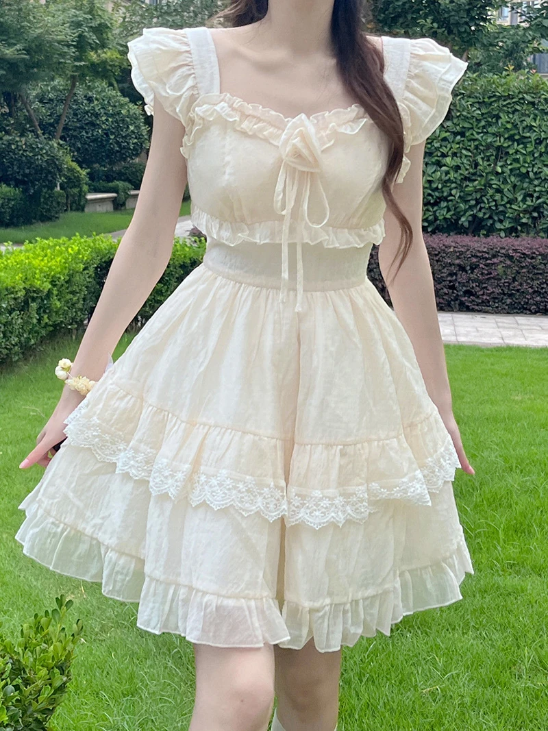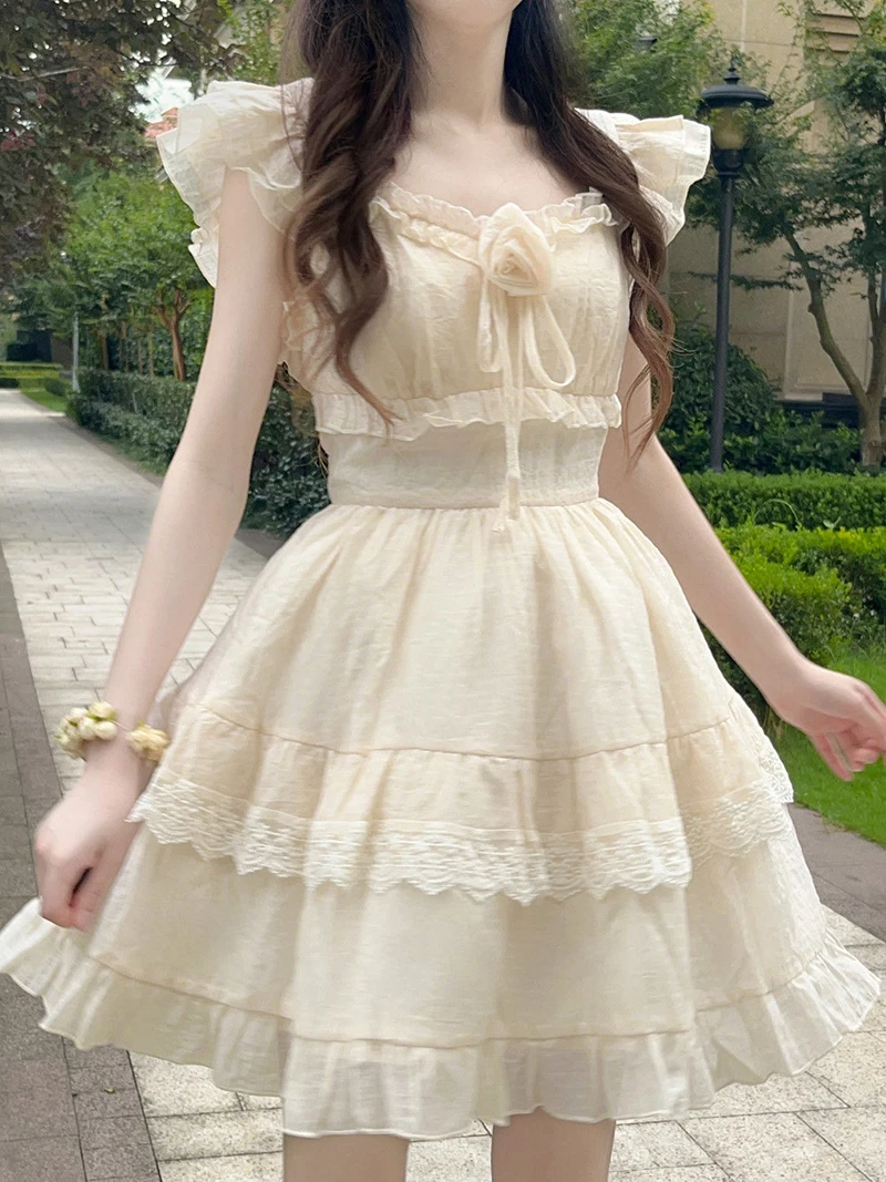 Bxoxo 3D Floral Sweet Mini Dress Women Casual Fashion Slim Flying Sleeve Cake Dress Preppy Style Lace Patchwork Cute Vestidos New