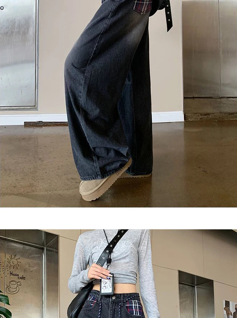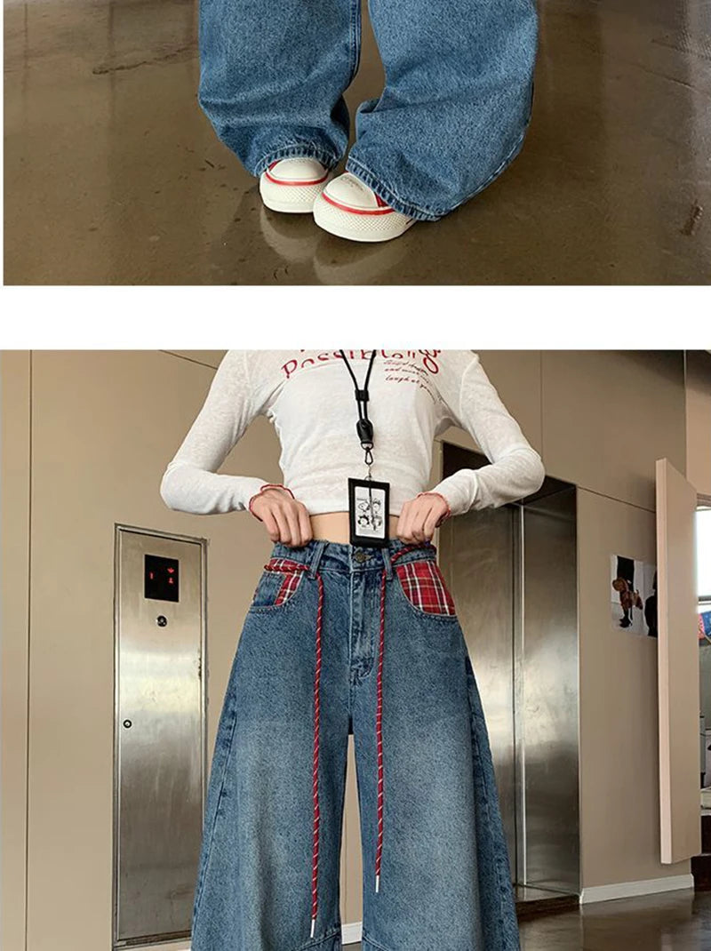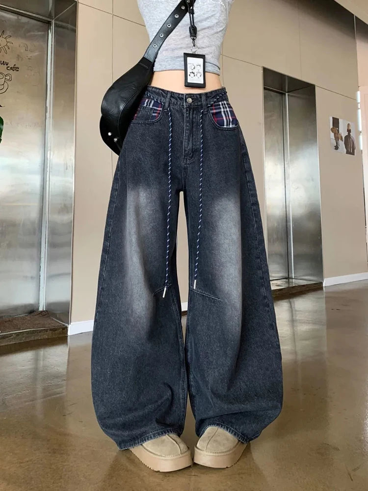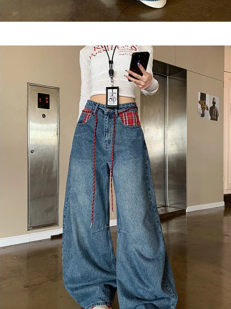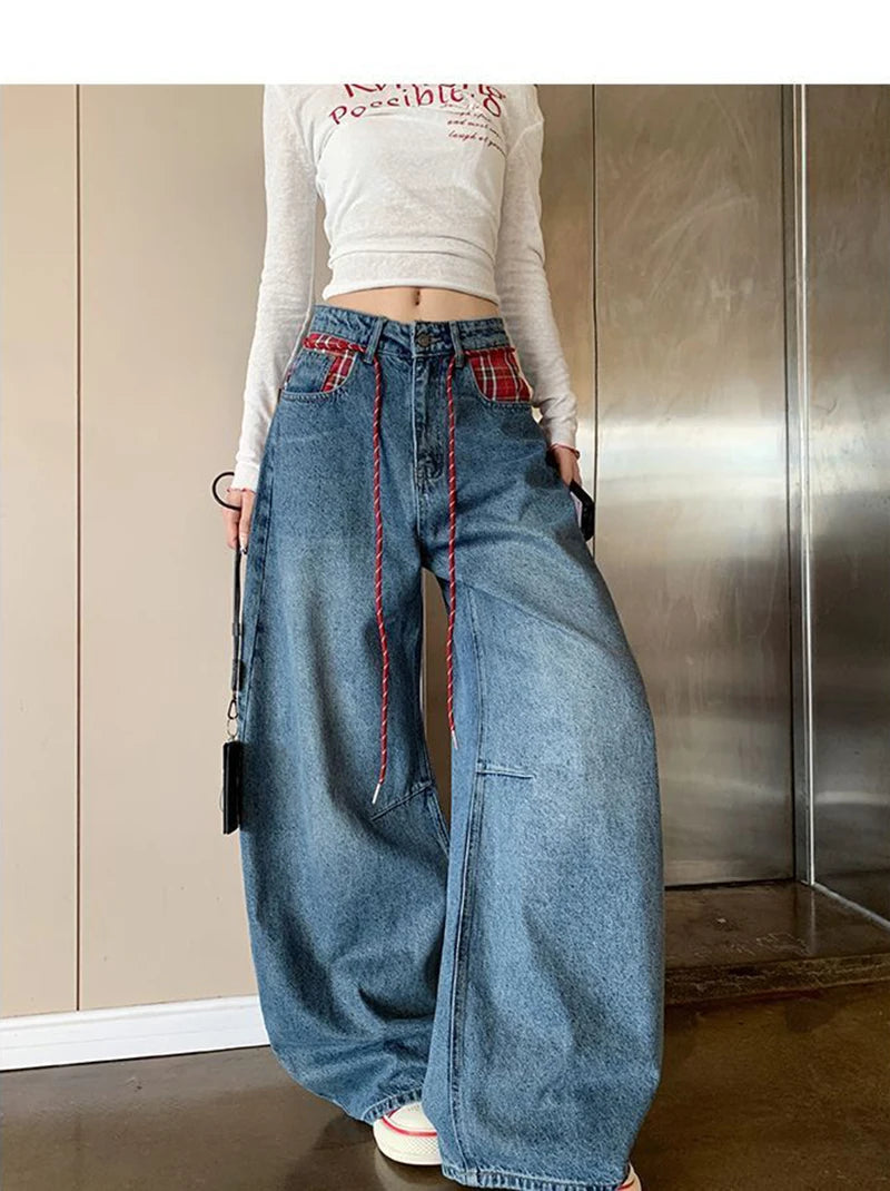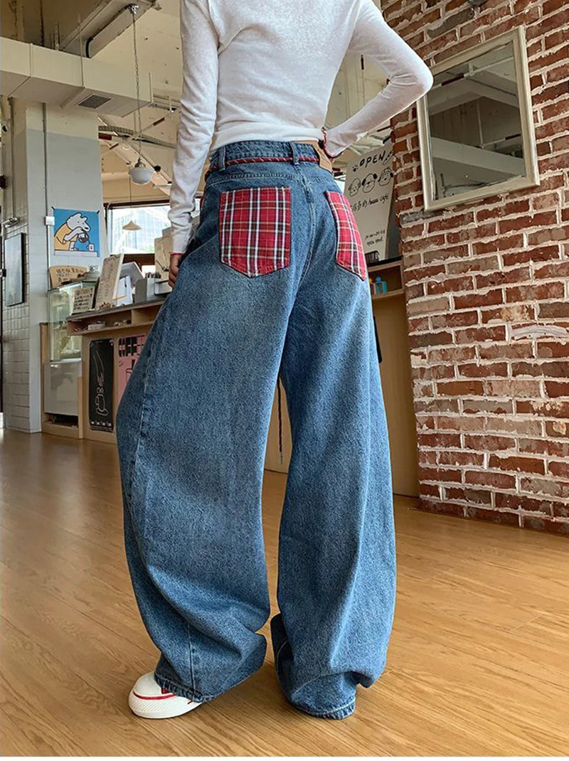 Bxoxo American Plaid Patchwork Women Wide Leg Jeans Autumn High Waist Streetwear Loose Scimitar Trousers Harajuku All Match Denim Pant