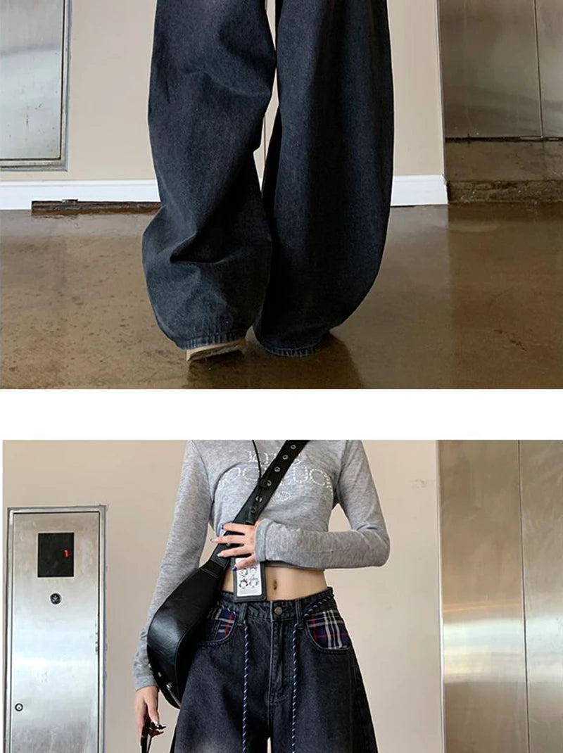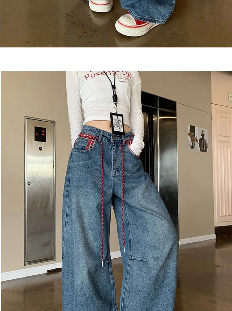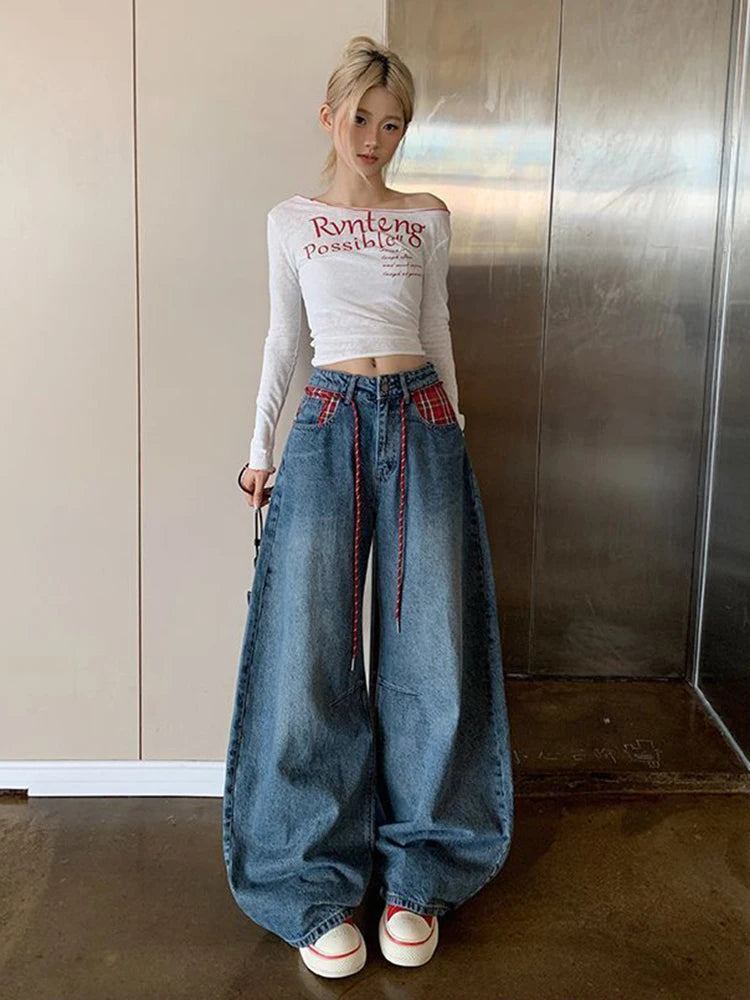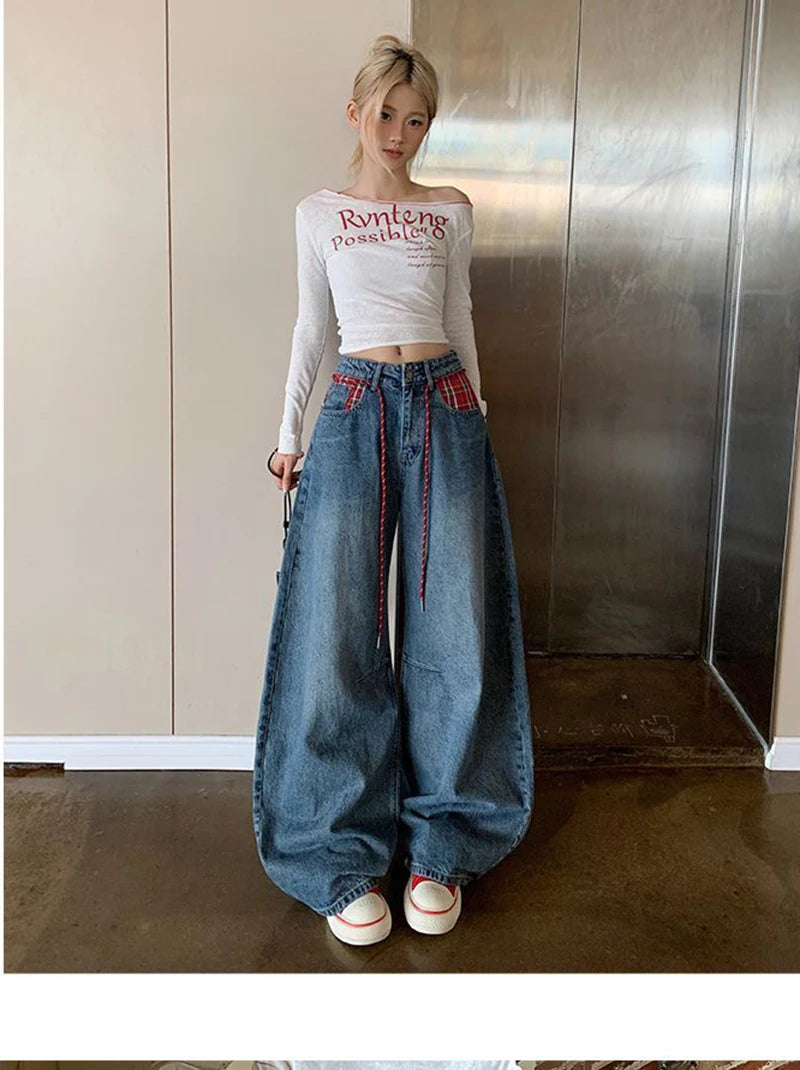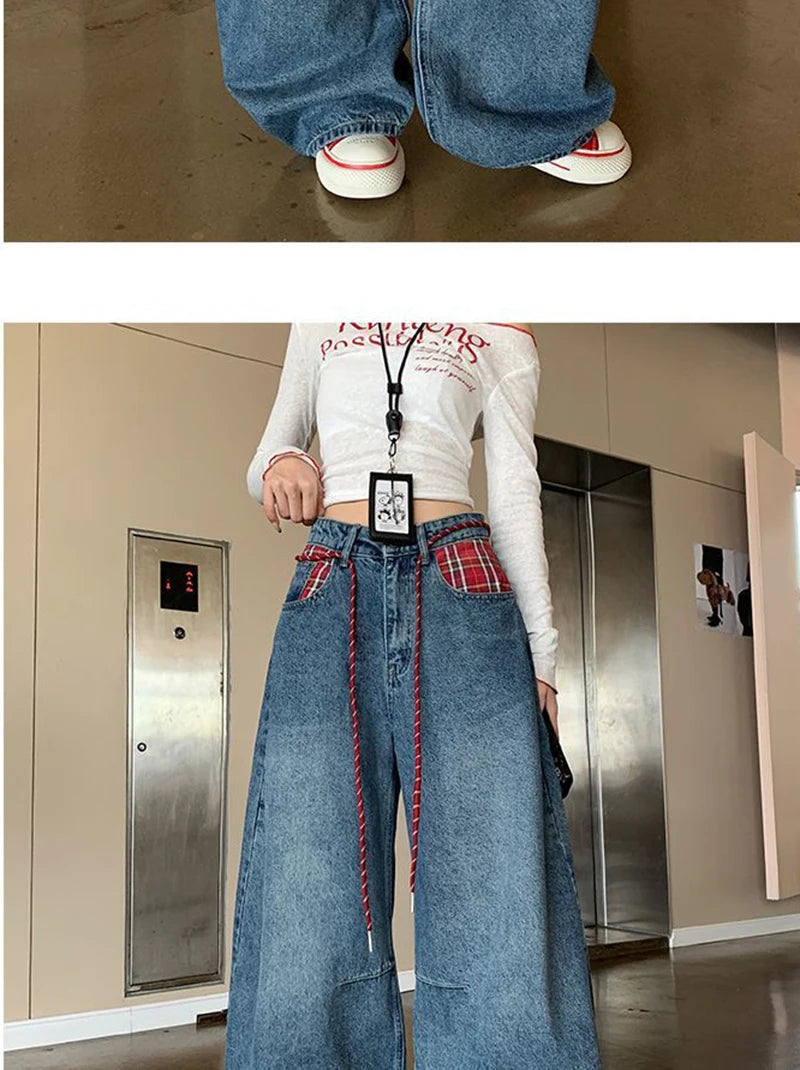 Bxoxo American Plaid Patchwork Women Wide Leg Jeans Autumn High Waist Streetwear Loose Scimitar Trousers Harajuku All Match Denim Pant