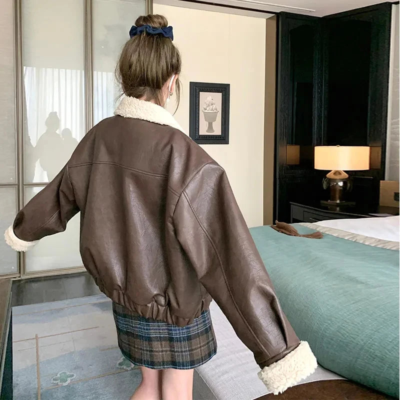 Bxoxo American Retro Pu Leather Jacket Women Y2K Streetwear Loose Lapel Motorcycle Coats Bf Winter Thick Lamb Warm Outwear New