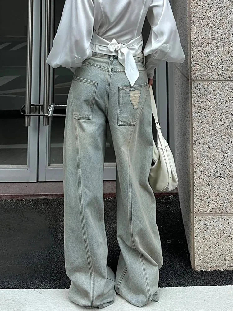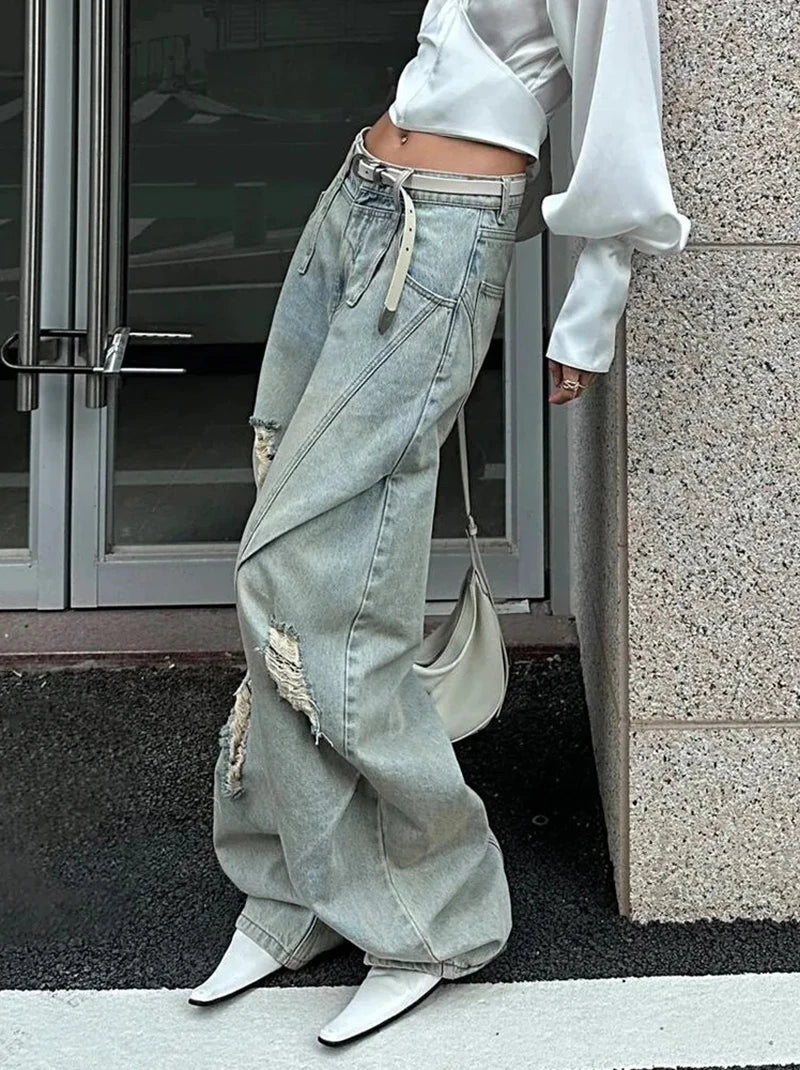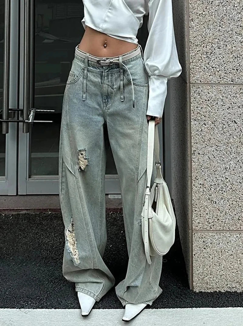 Bxoxo American Vintage Ripped Wide Leg Jeans Women Autumn High Waist Streetwear Loose Denim Pants Y2K Hip Hop Grunge Straight Trousers