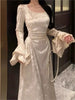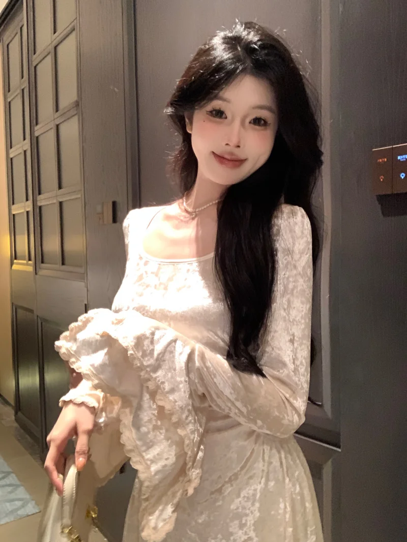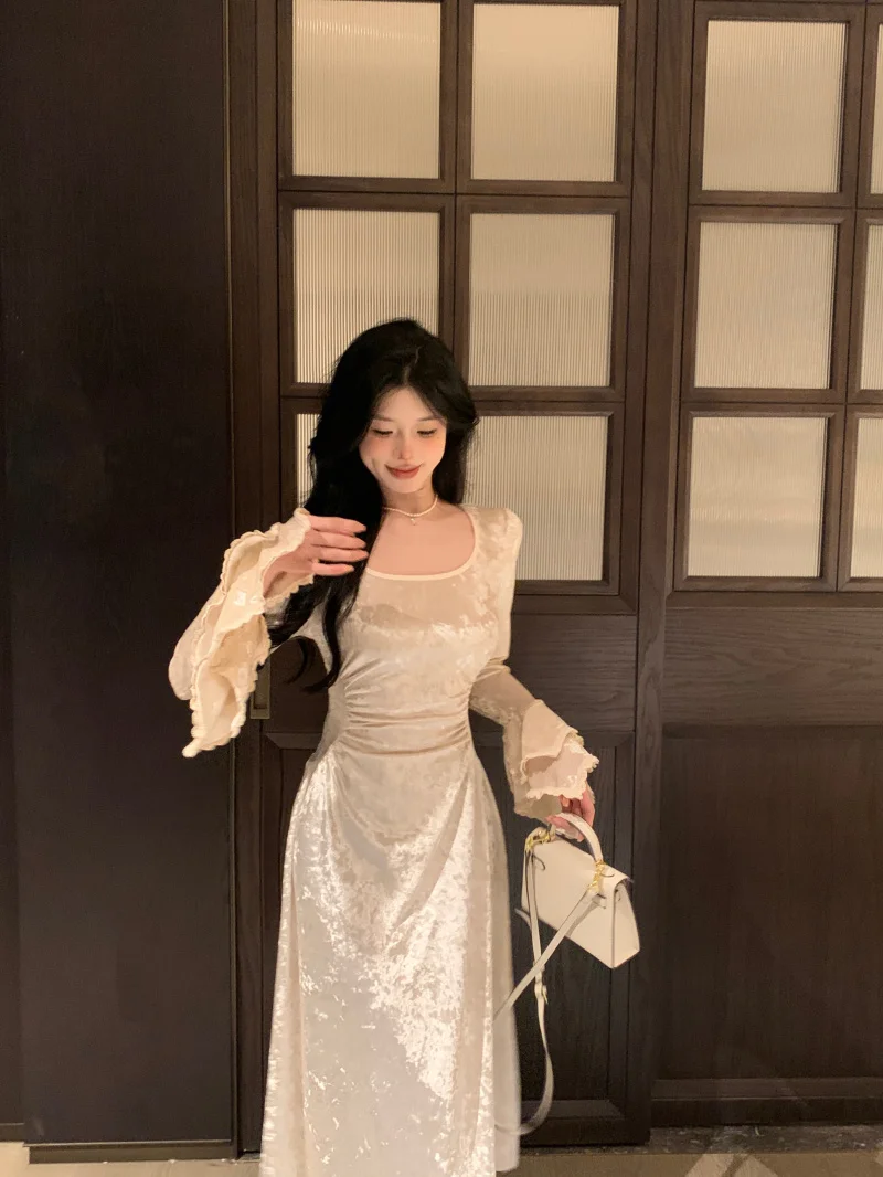 Bxoxo Autumn Elegant Velvet Midi Dresses For Women Lace Patchwork Flare Sleeve A-line Birthday Party Dress Vestidos Mujer New