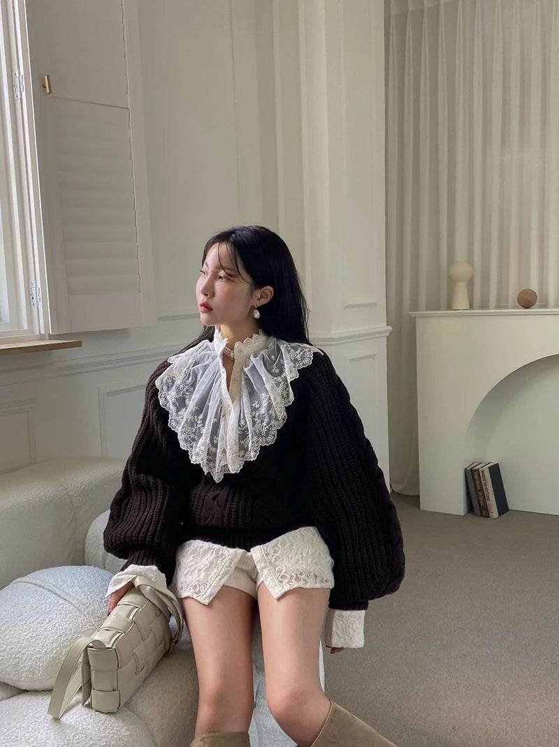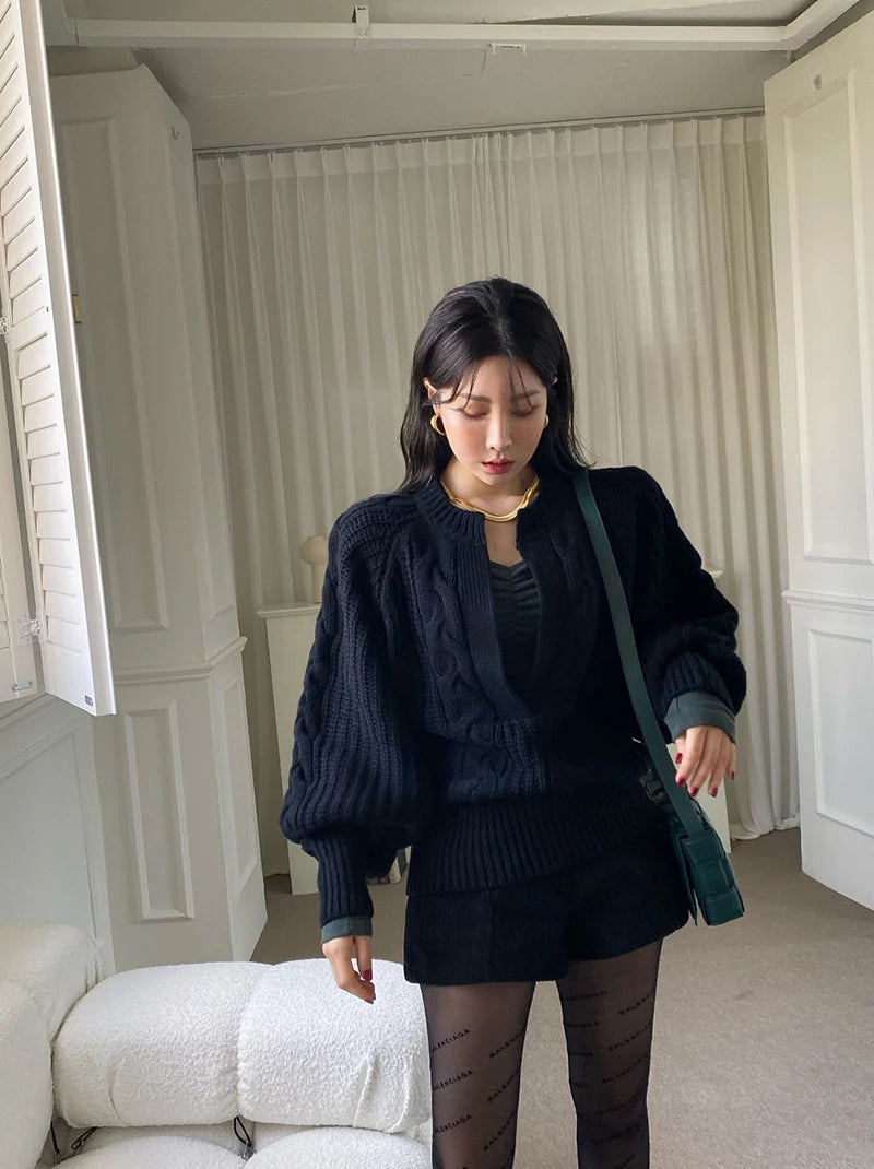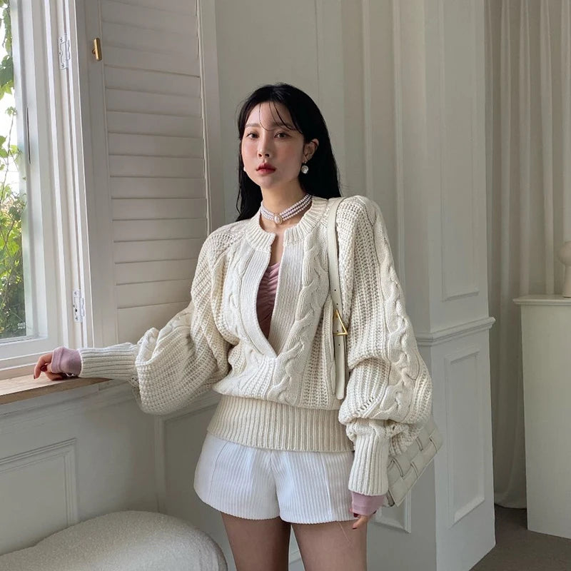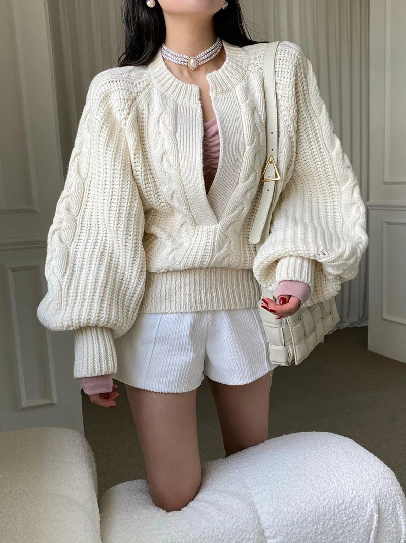 Bxoxo Autumn Lantern Sleeves Knit Sweater for Women Korean Chic V Neck Loose Thick Pullover Y2K Ladies Streetwear All Match Jumpers