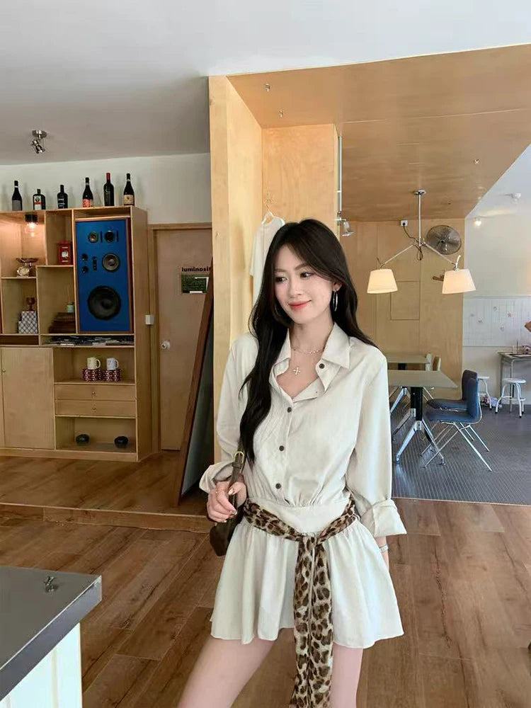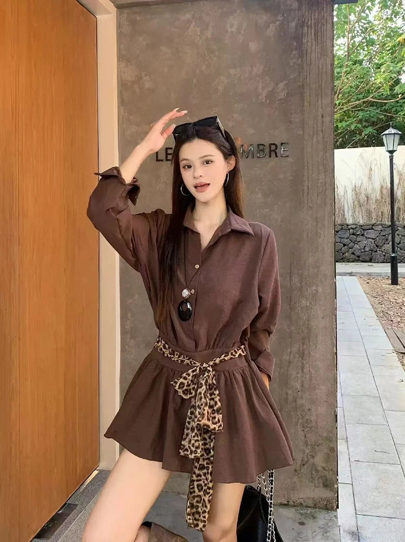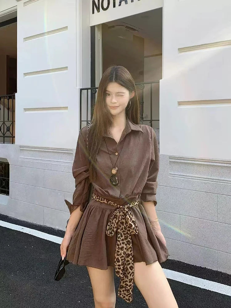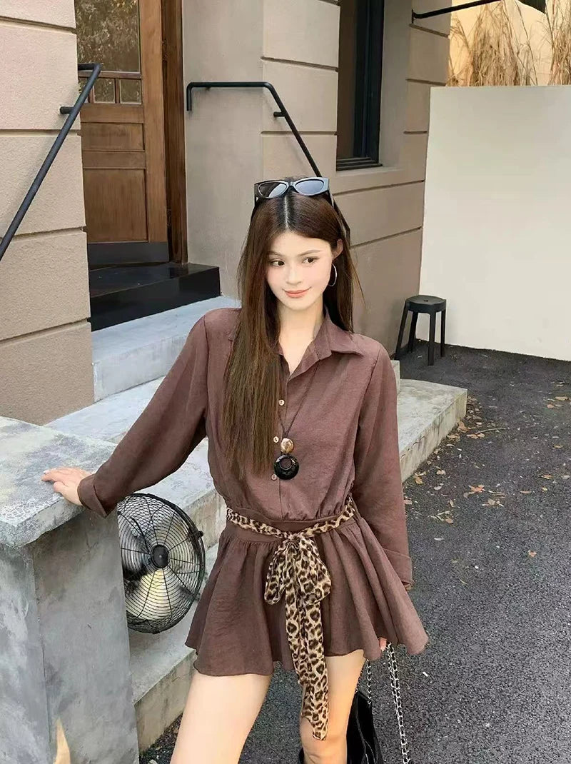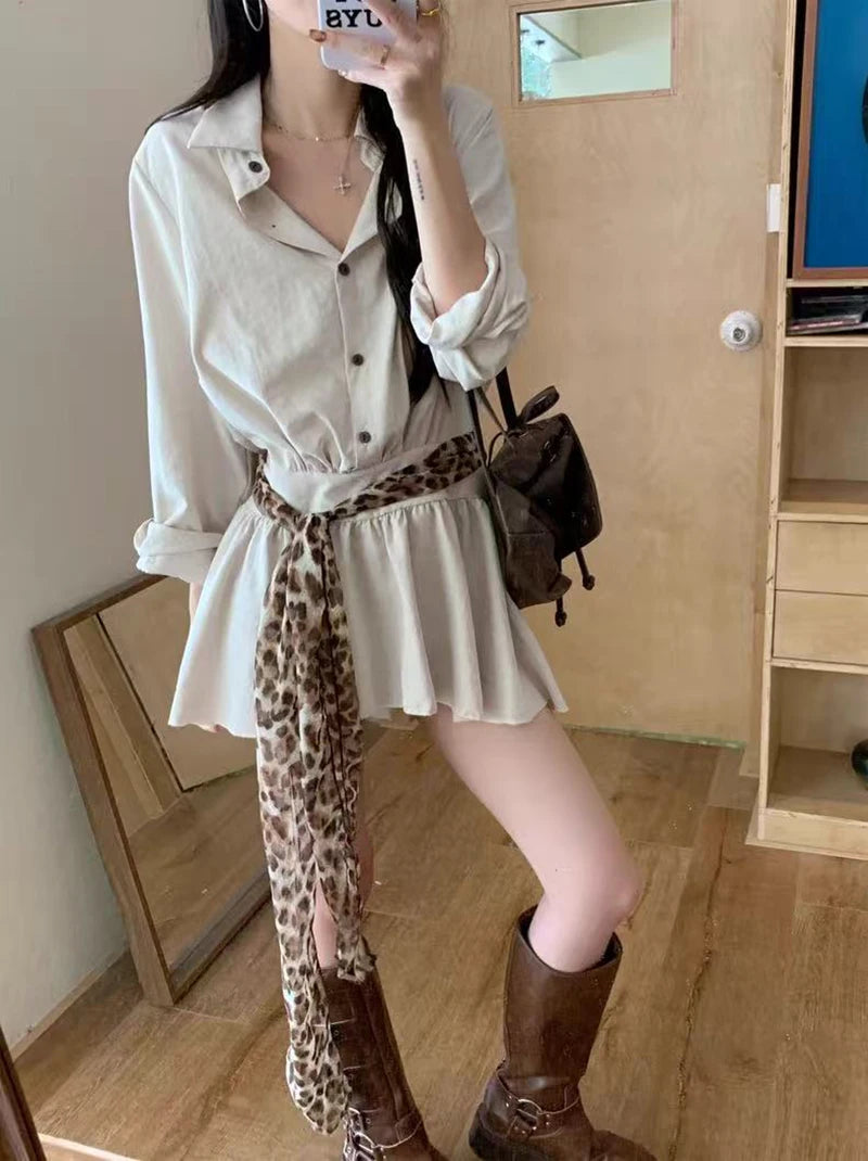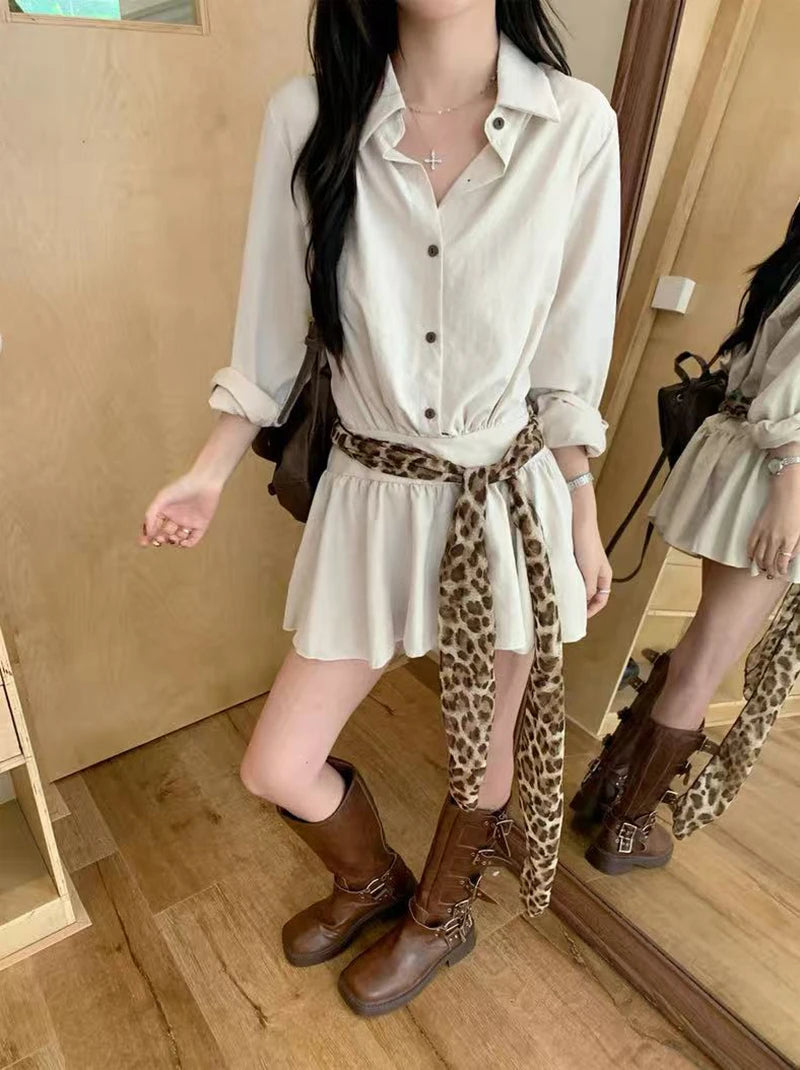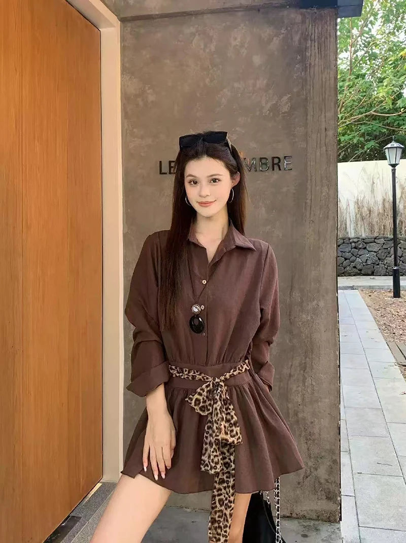 Bxoxo Autumn Lapel Shirt Mini Dress Women Fashion Streetwear Leopard Print Lace Up Dress Y2K Korean Elegant Long Sleeve Vestidos New