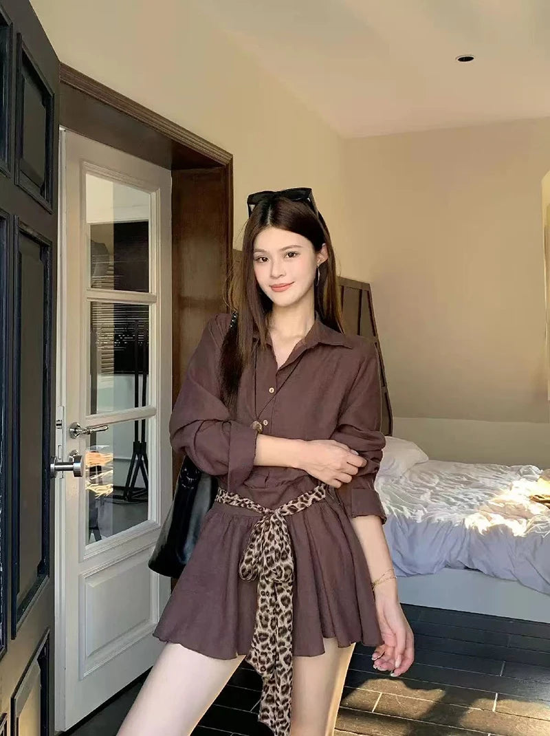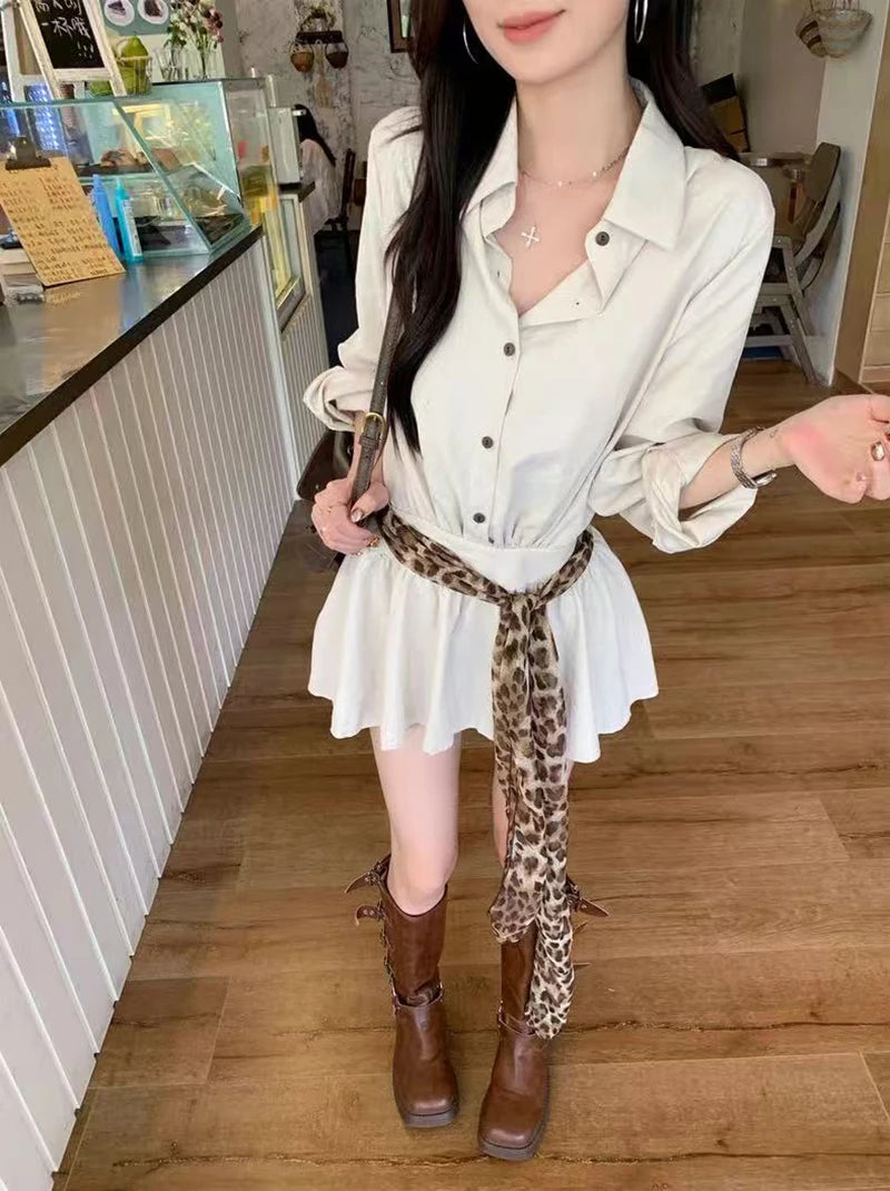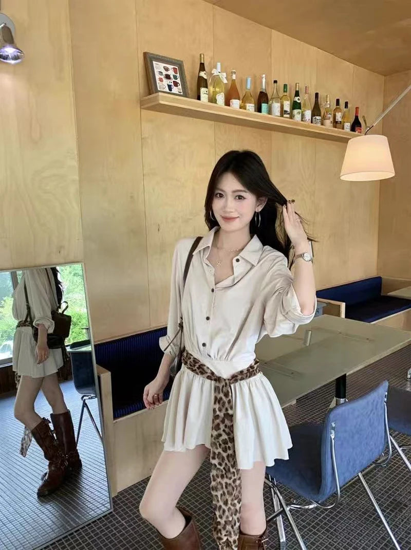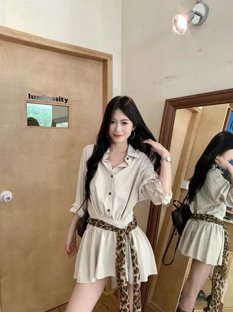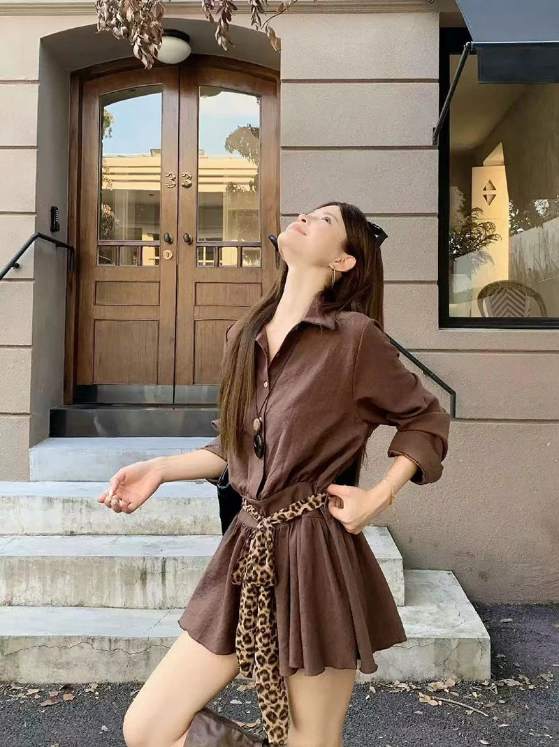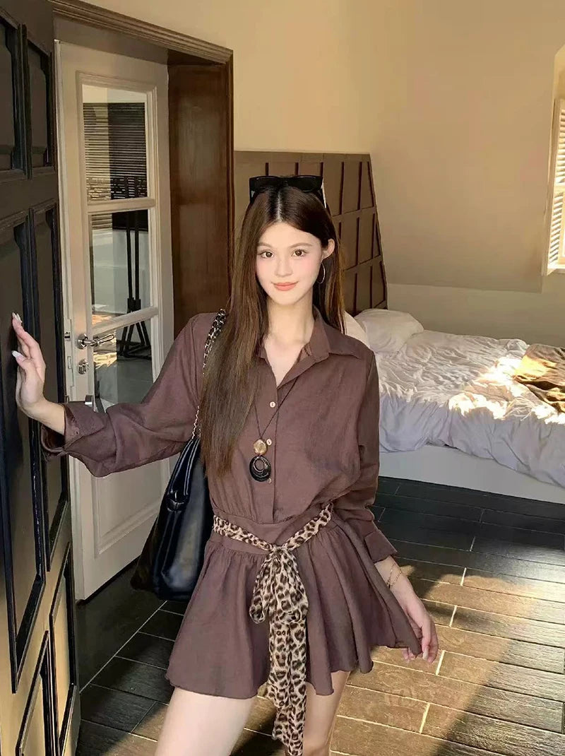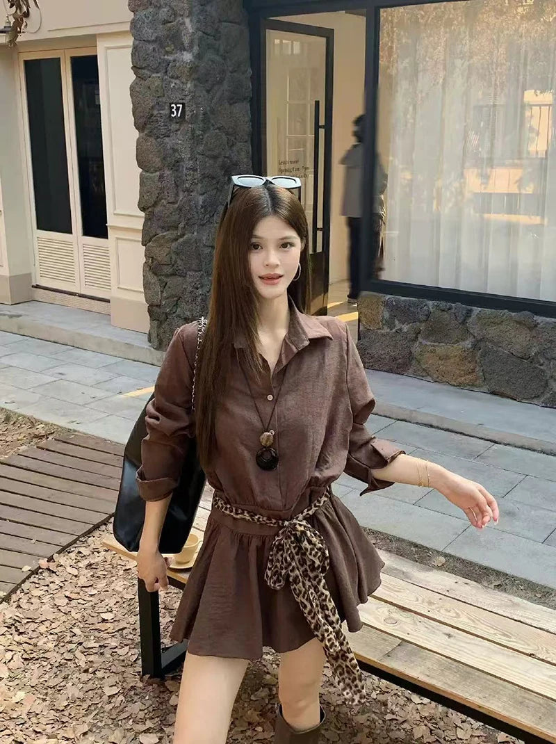 Bxoxo Autumn Lapel Shirt Mini Dress Women Fashion Streetwear Leopard Print Lace Up Dress Y2K Korean Elegant Long Sleeve Vestidos New