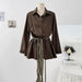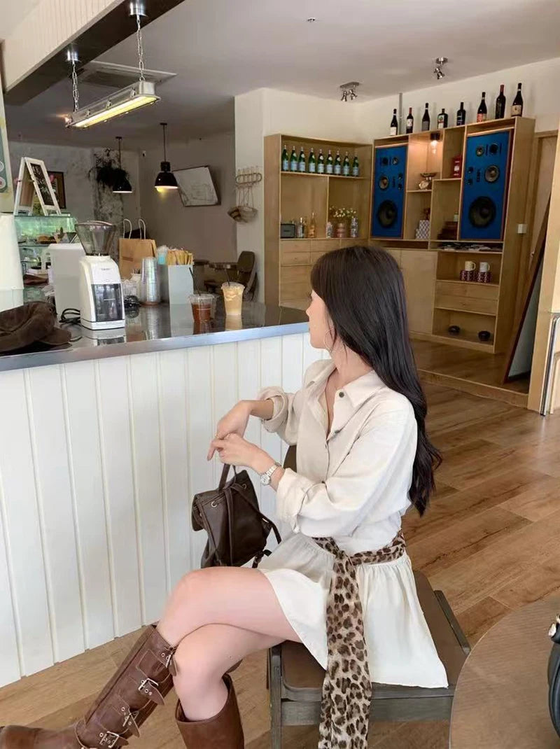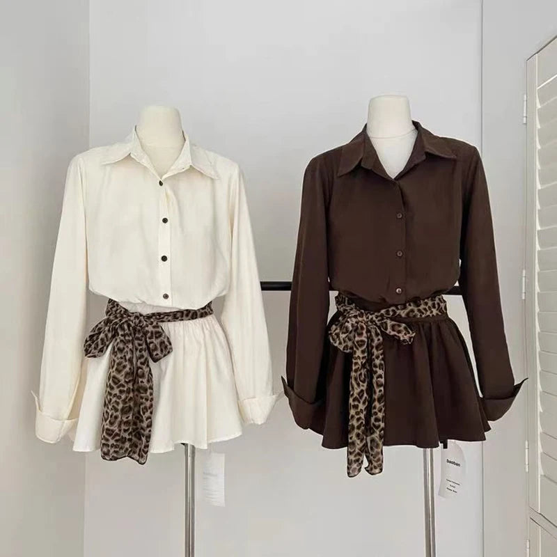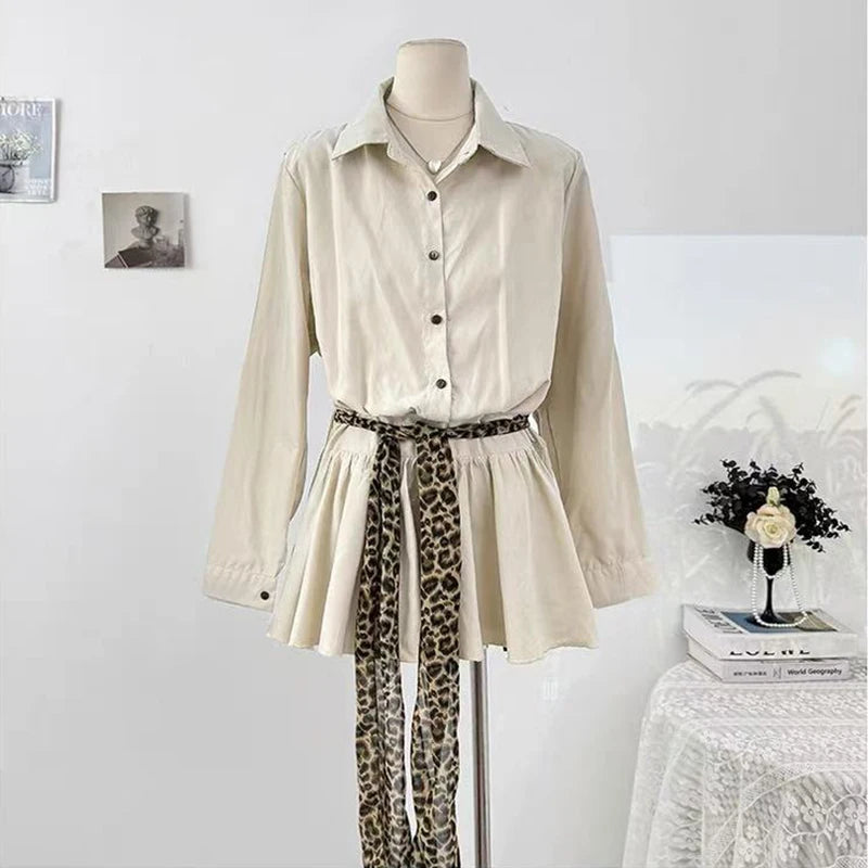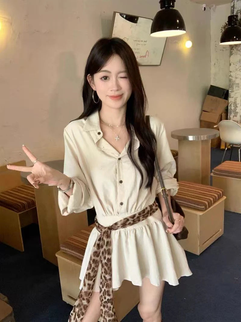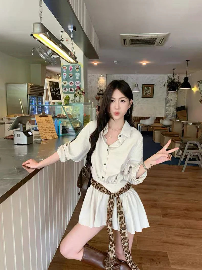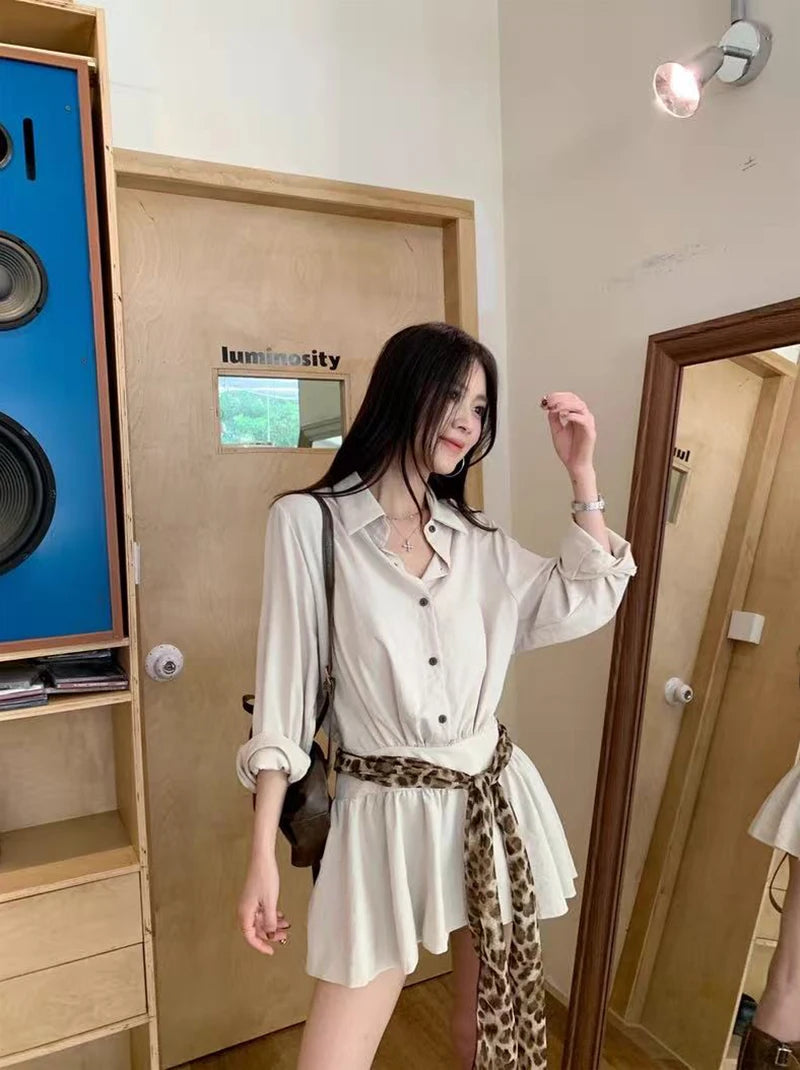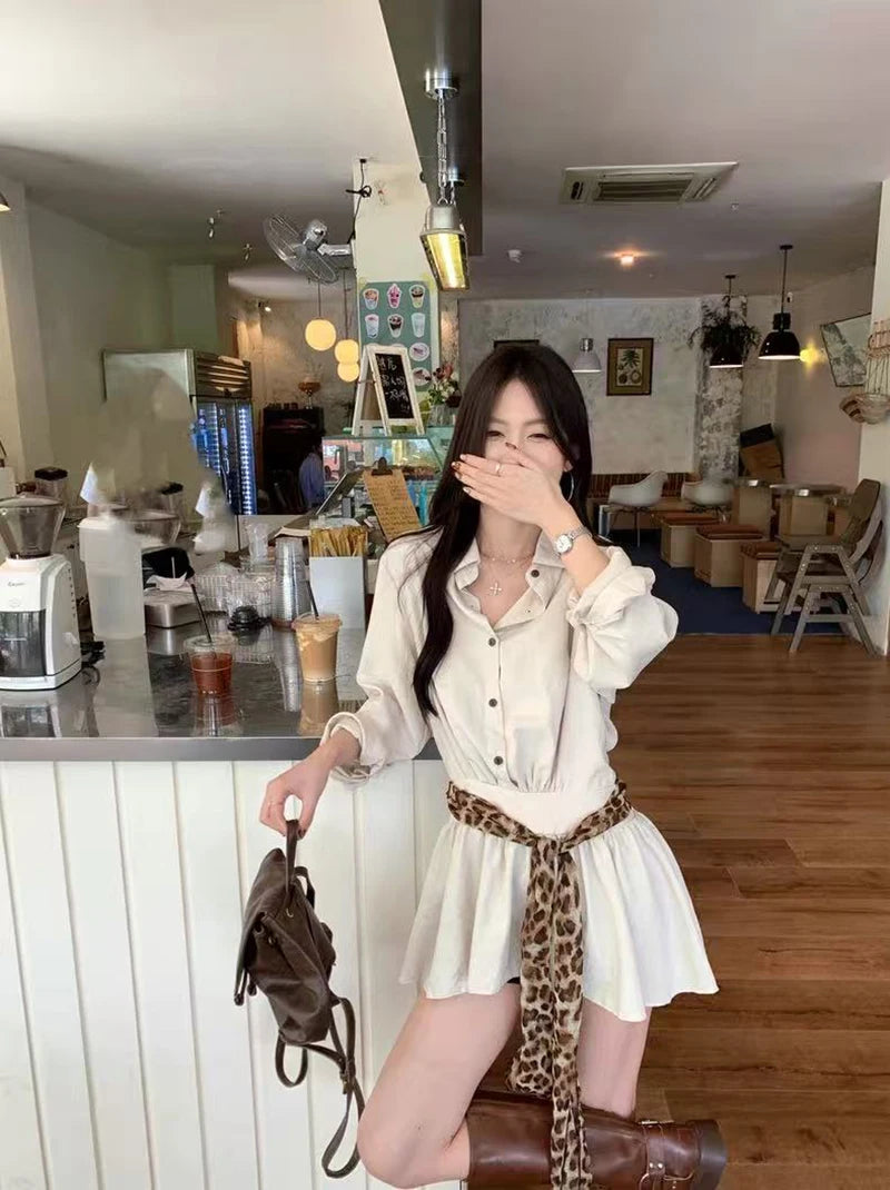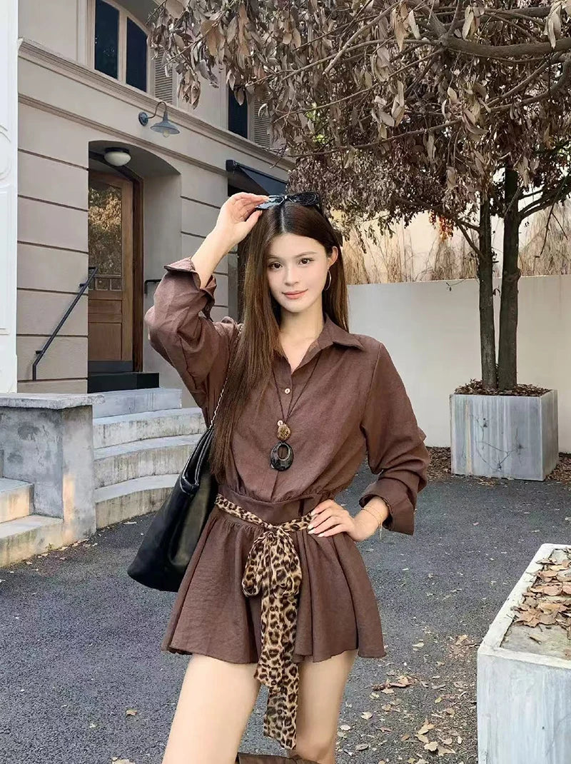 Bxoxo Autumn Lapel Shirt Mini Dress Women Fashion Streetwear Leopard Print Lace Up Dress Y2K Korean Elegant Long Sleeve Vestidos New