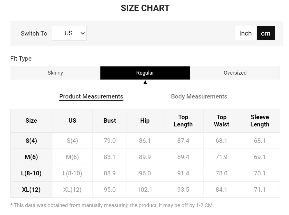 Note: There might be 2-3% difference according to manual measurement. Please check the measurement chart carefully before you buy the item. +Please note that slight color difference should be acceptable due to the light and screen.