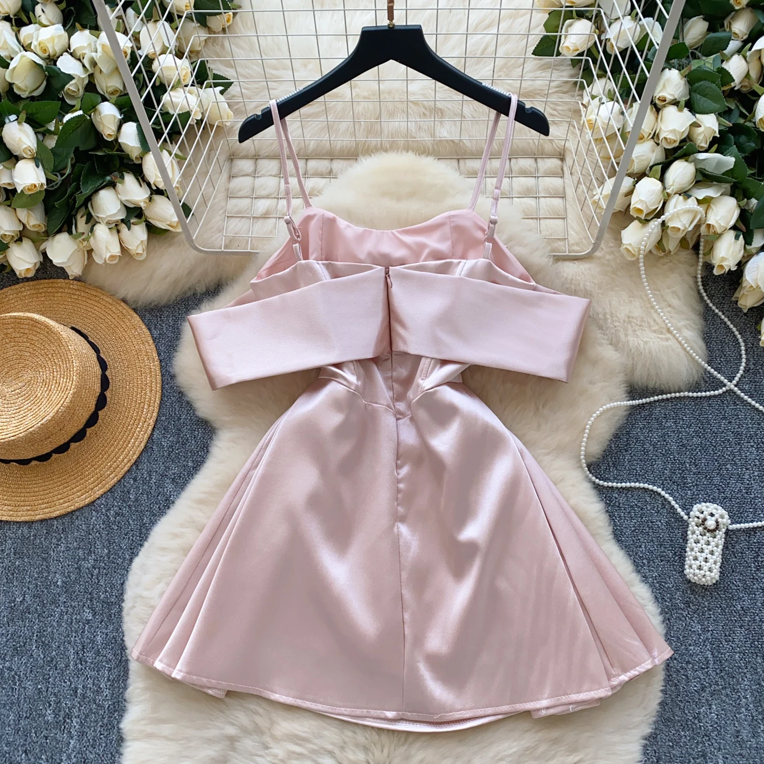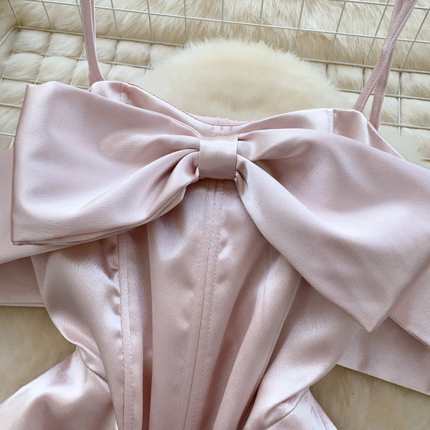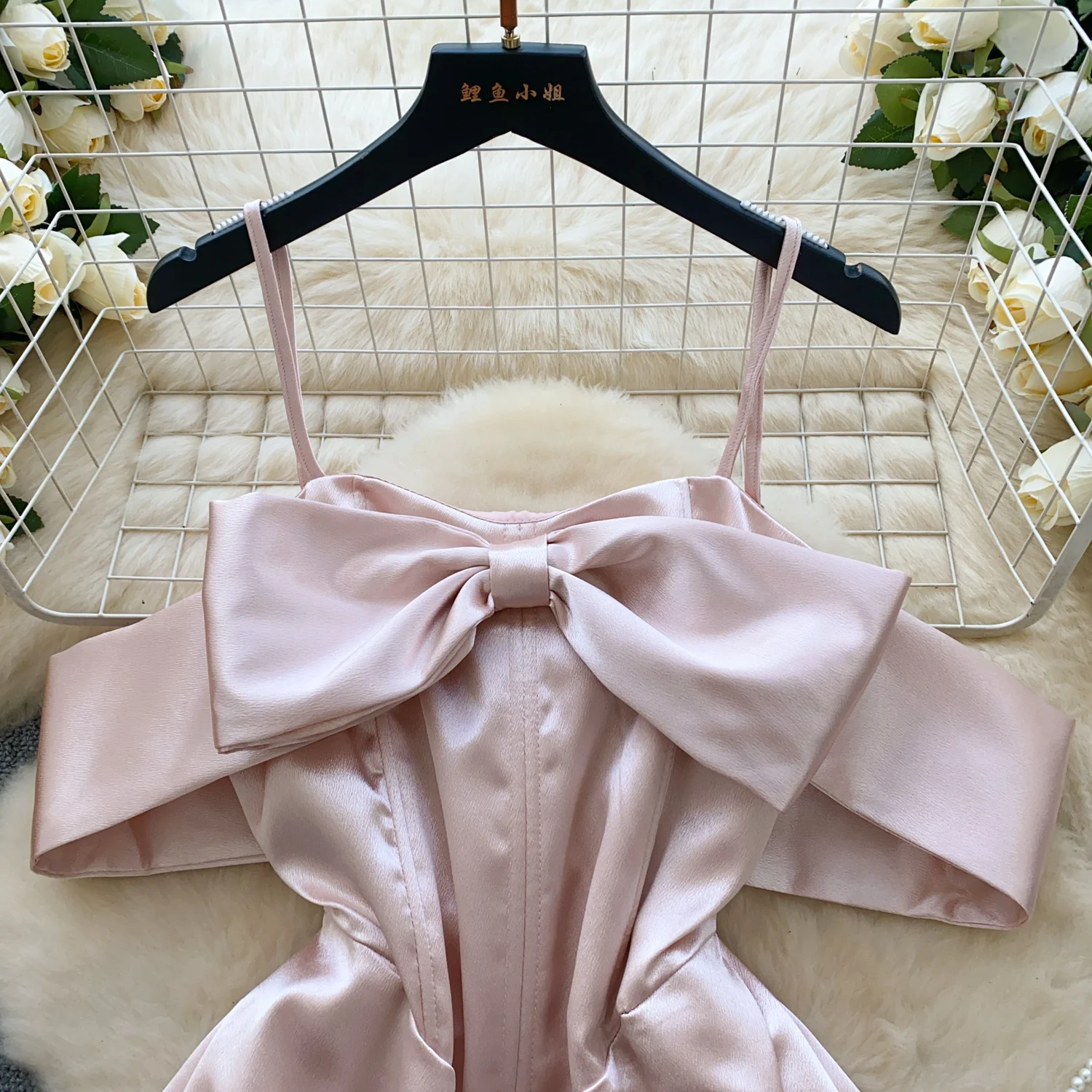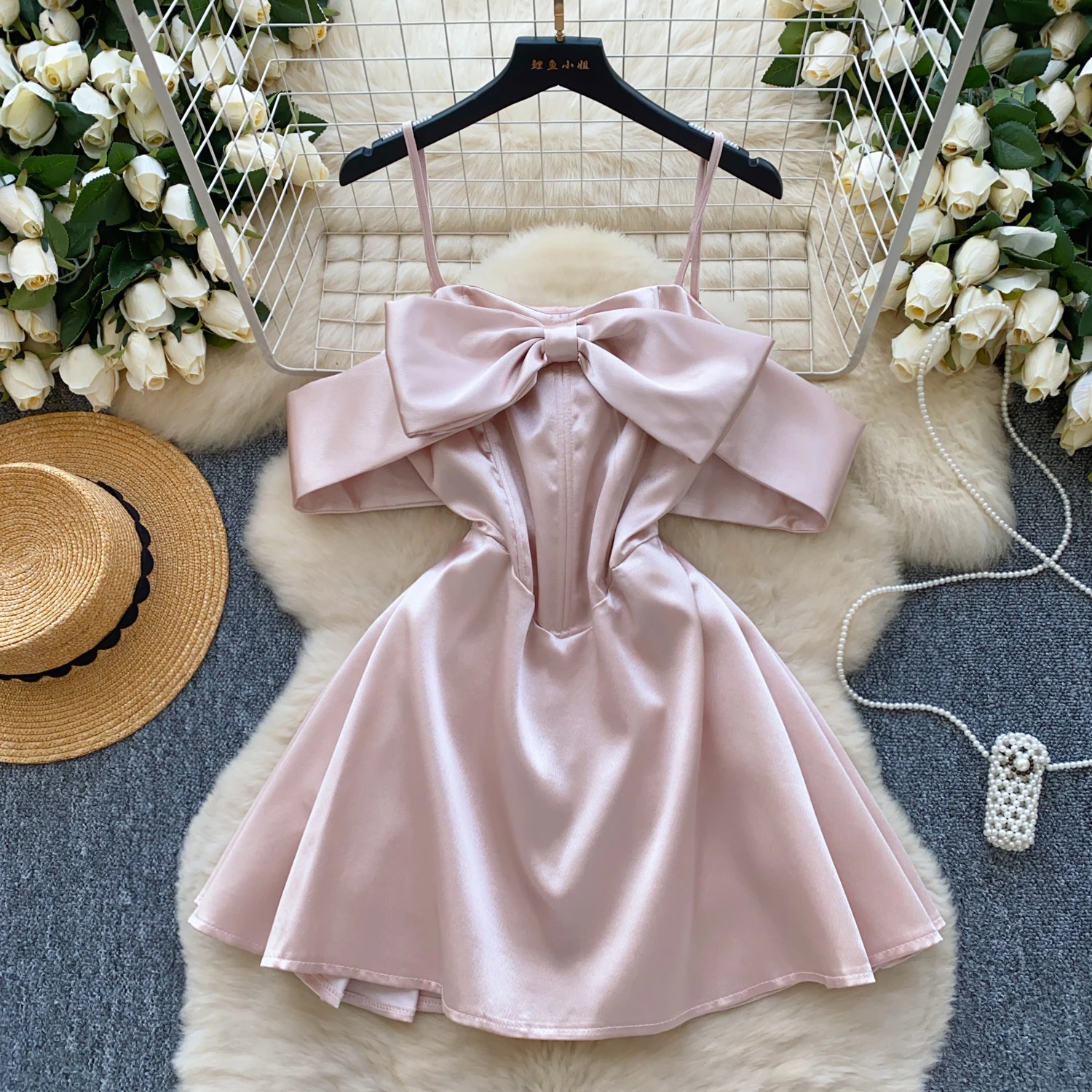 BXOXO Birthday Party Satin Dress Women Sleeveless Off Shoulder Zipper Design Bodycon Senior Sexy Fashion Bow Mini Dresses