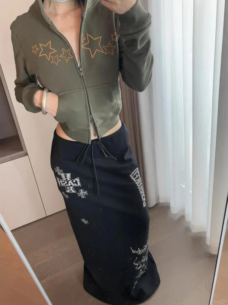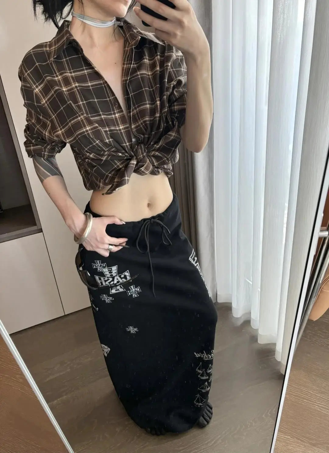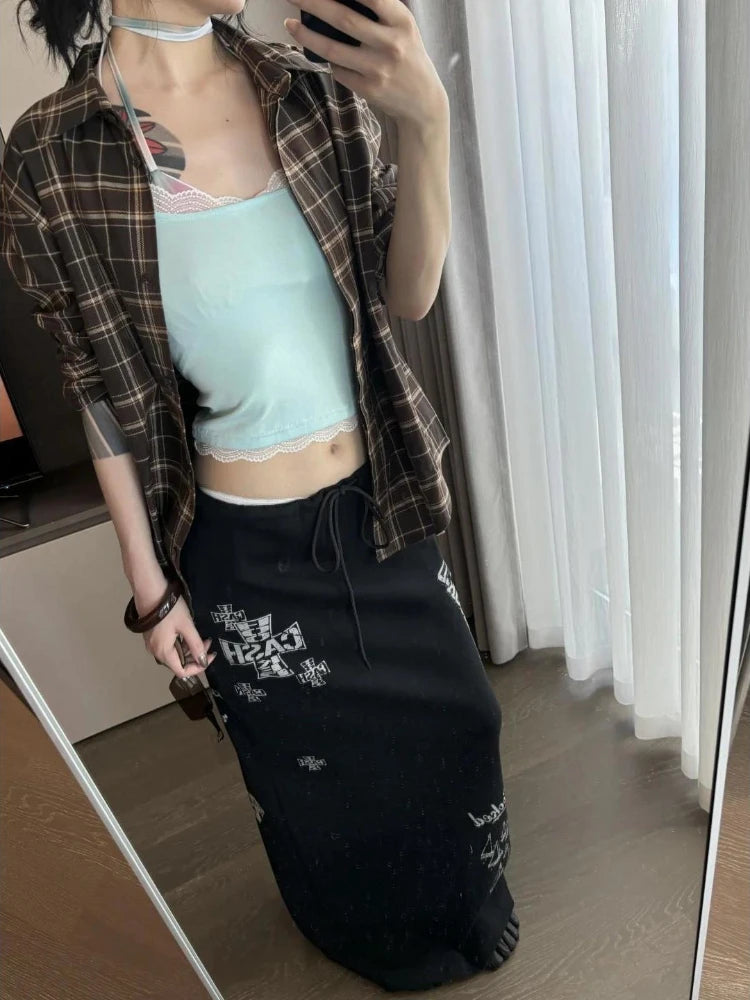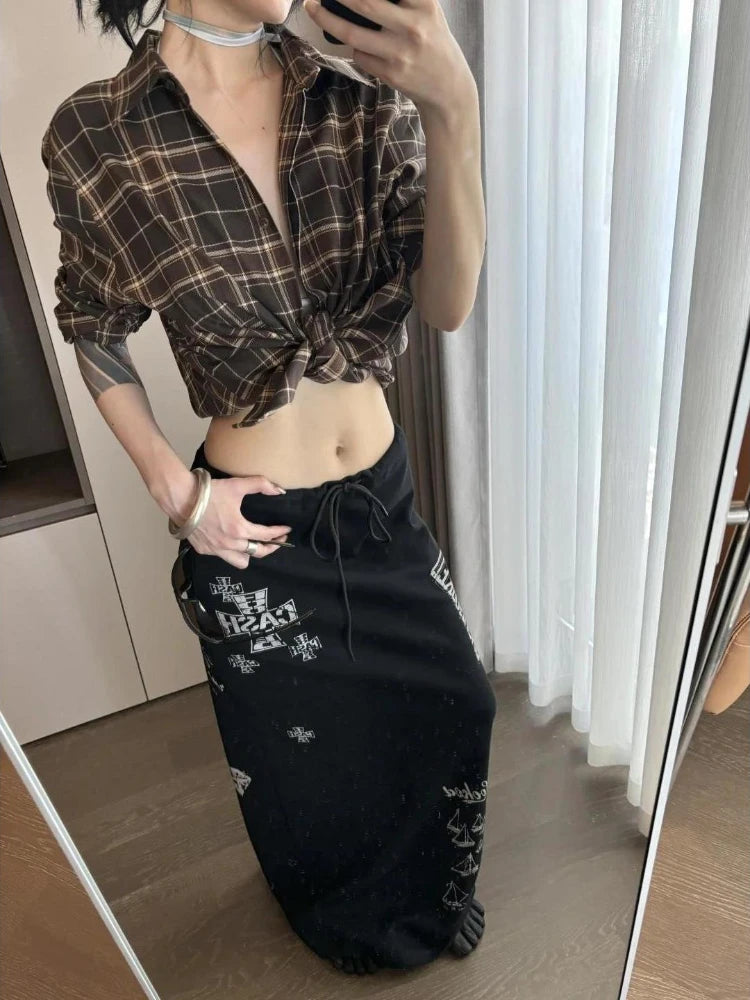 Bxoxo Black Gothic Long Skirt Women Japanese Style Harajuku Y2k Print Skirts Vintage 2000s Streetwear A-line Skirts Aesthetic