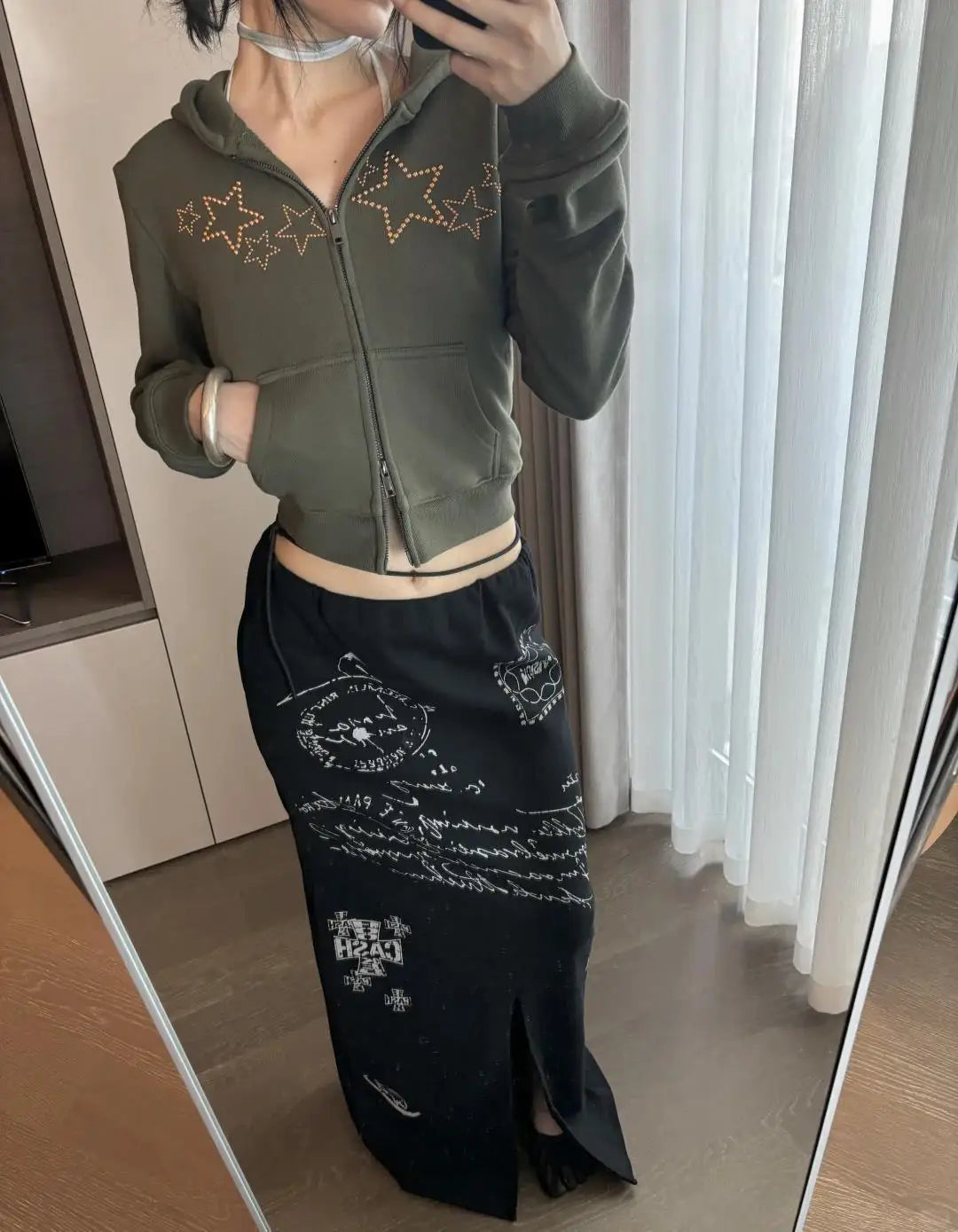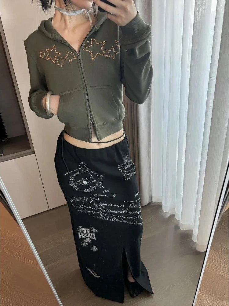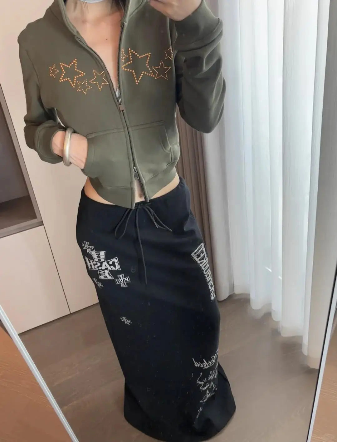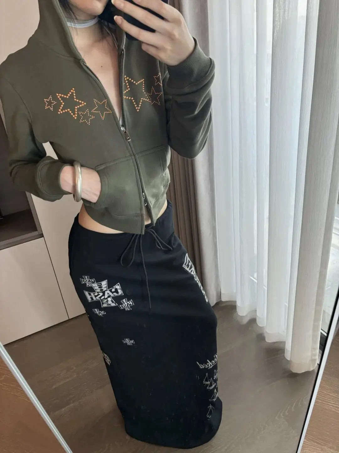 Bxoxo Black Gothic Long Skirt Women Japanese Style Harajuku Y2k Print Skirts Vintage 2000s Streetwear A-line Skirts Aesthetic