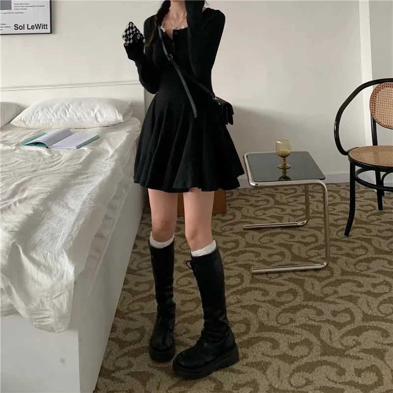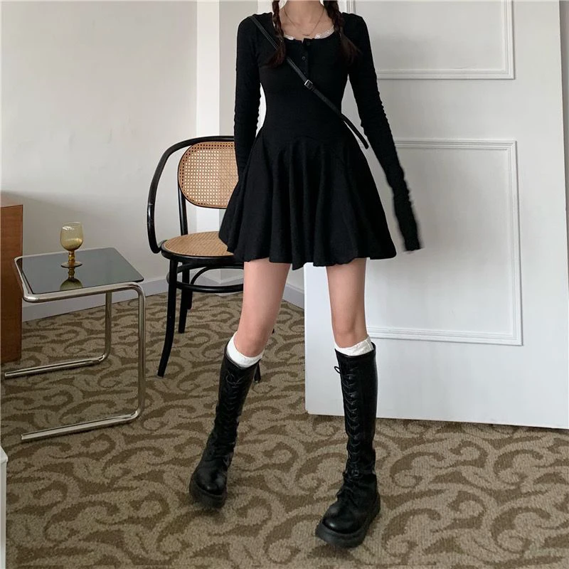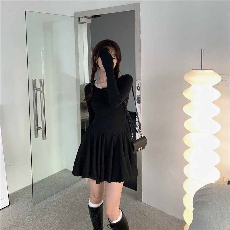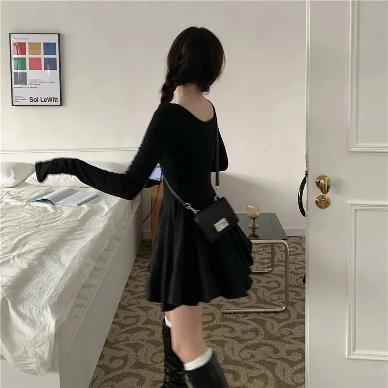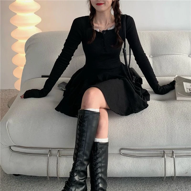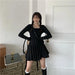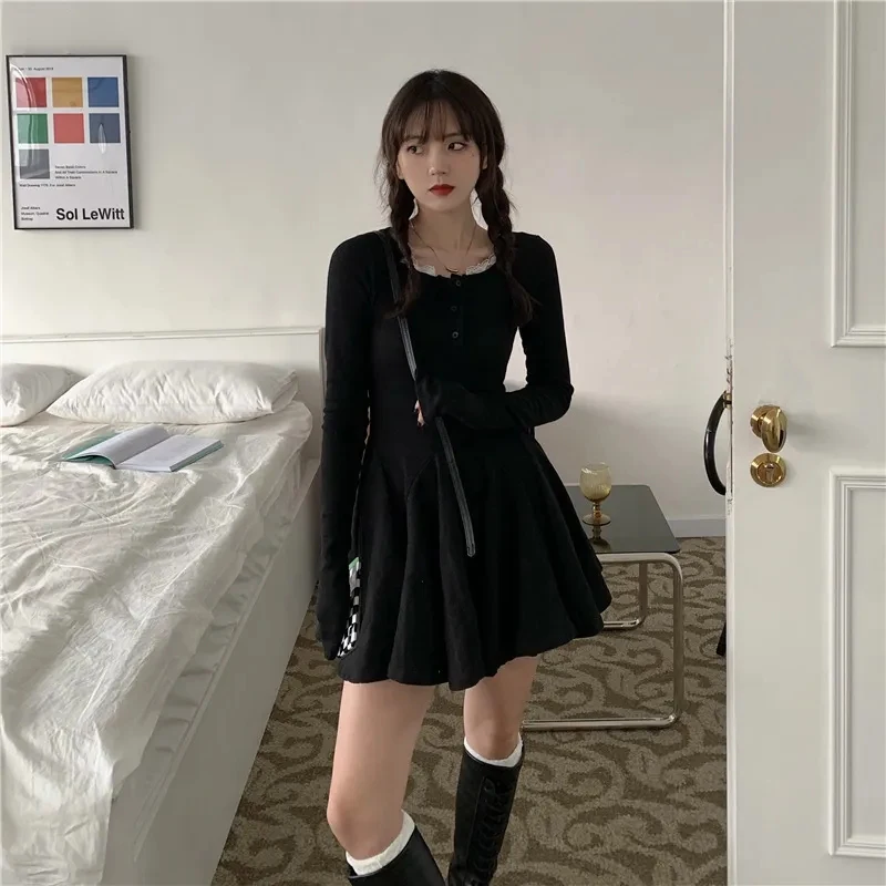 Bxoxo Black Lace Patchwork Dress Women Korean Chic Square Collar Long Sleeve Mini Dress Fall Fashion Preppy All-Match Bottoming Dress