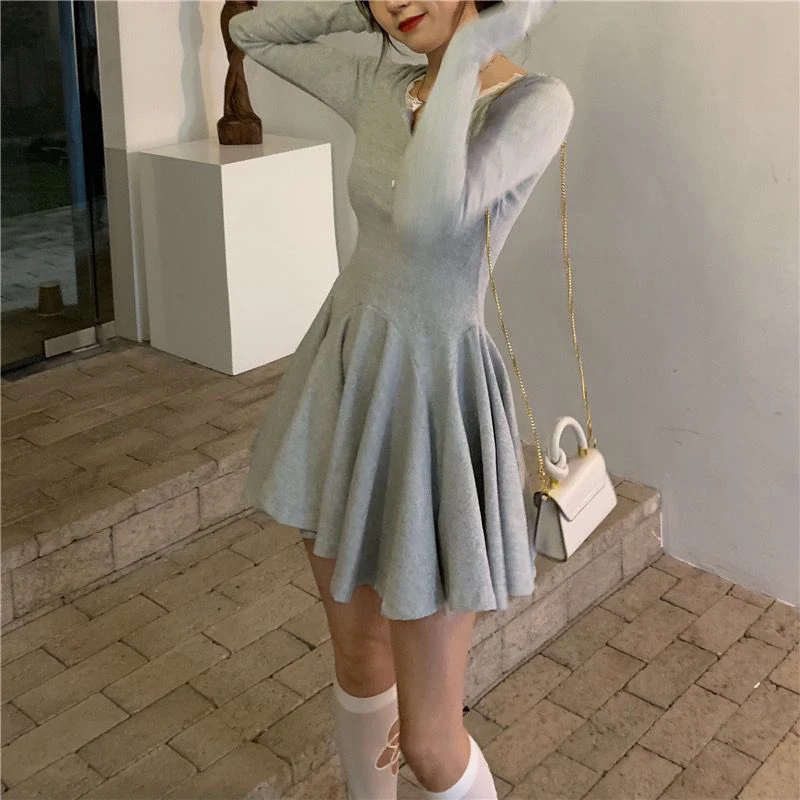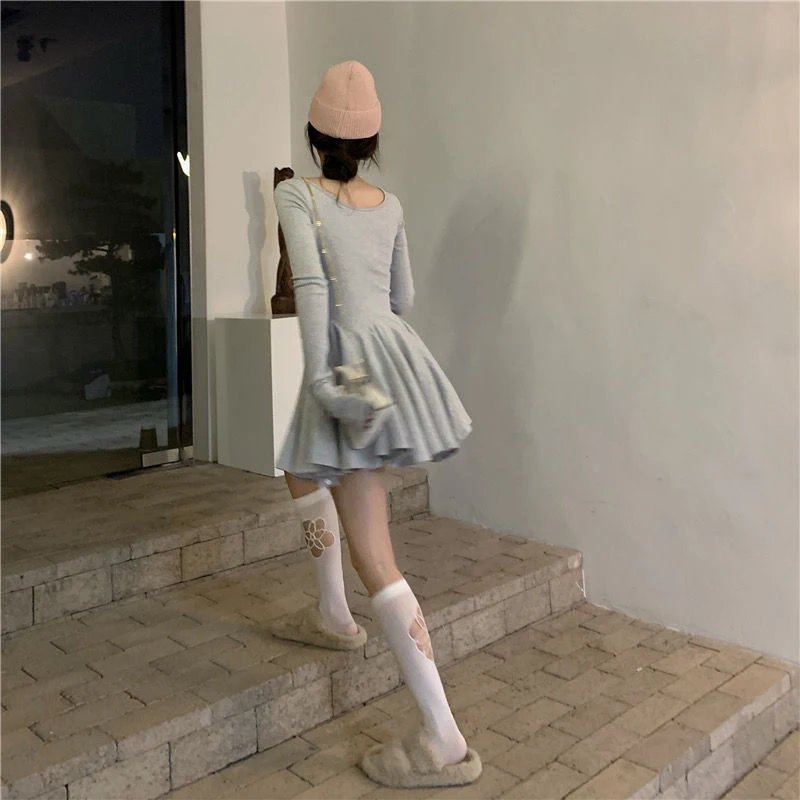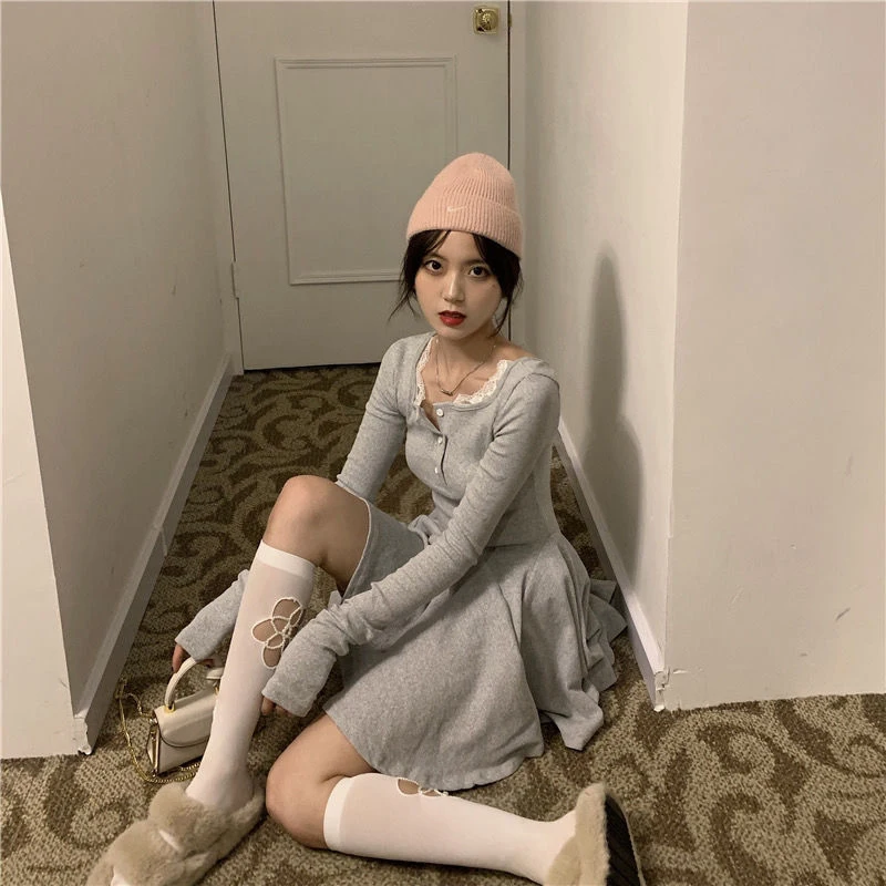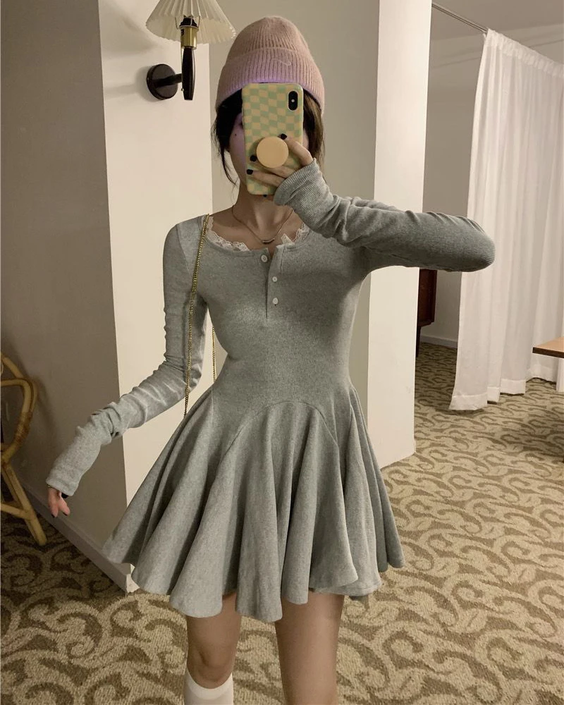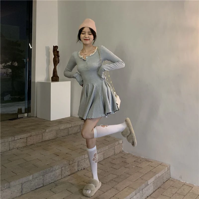 Bxoxo Black Lace Patchwork Dress Women Korean Chic Square Collar Long Sleeve Mini Dress Fall Fashion Preppy All-Match Bottoming Dress