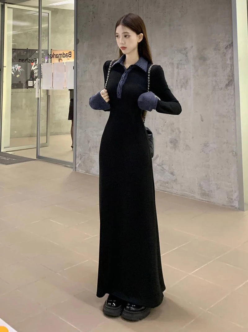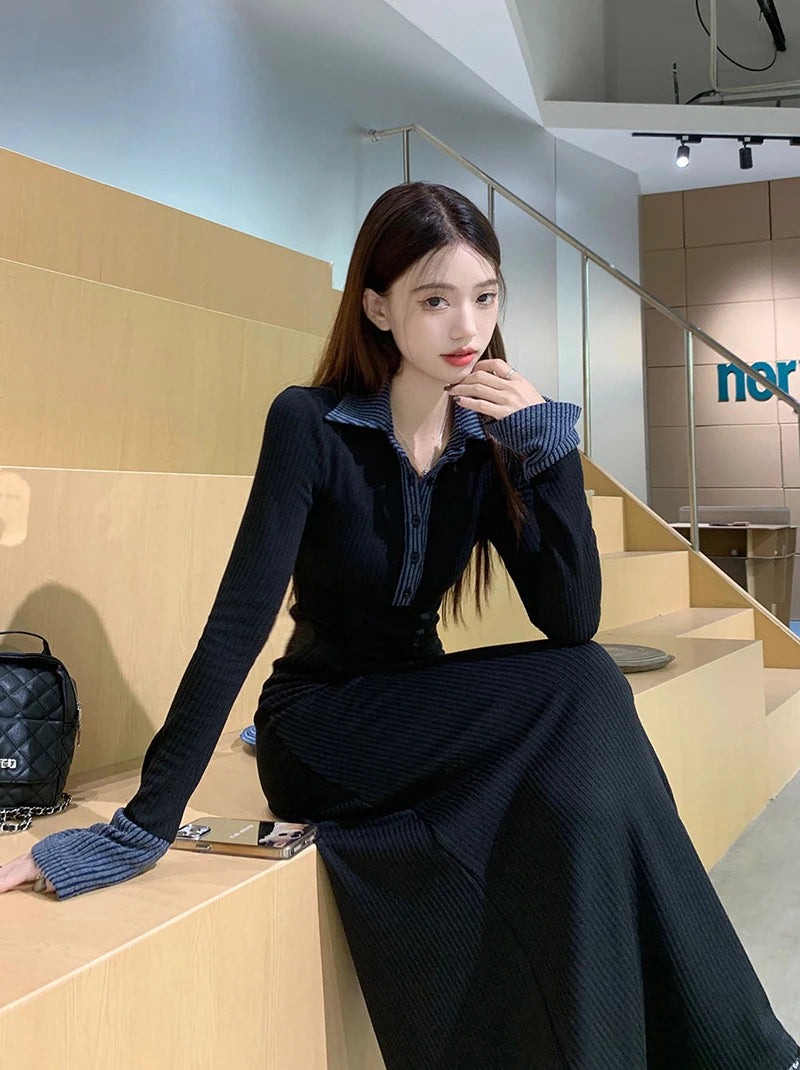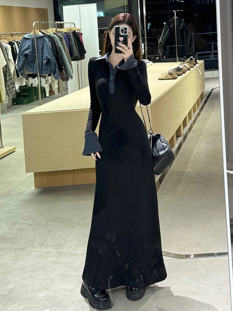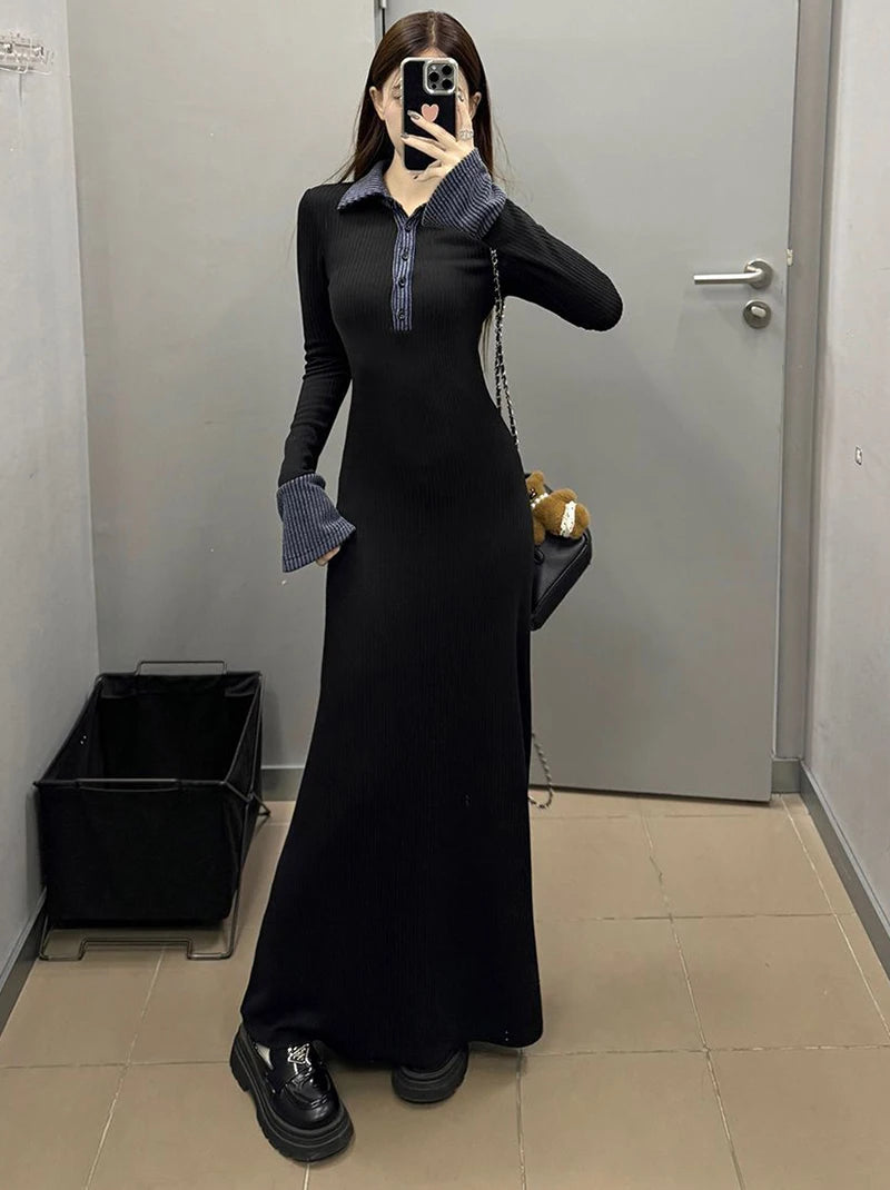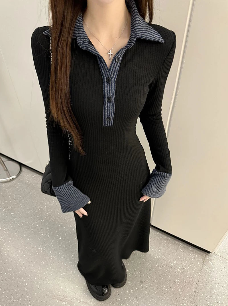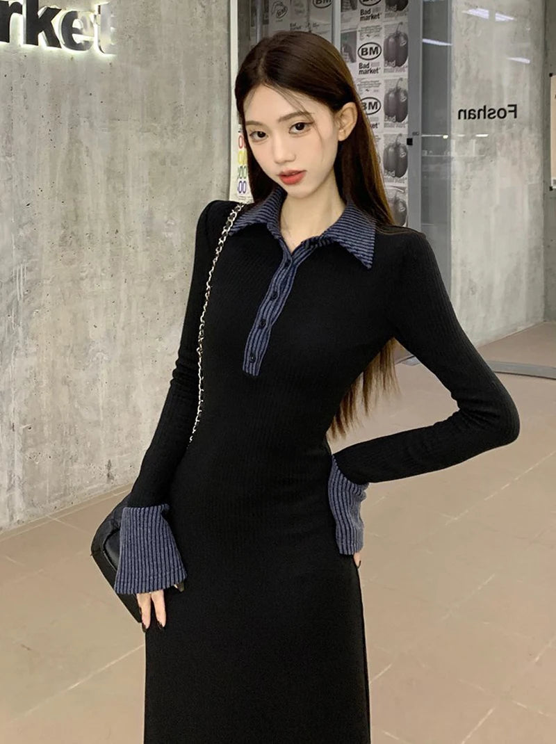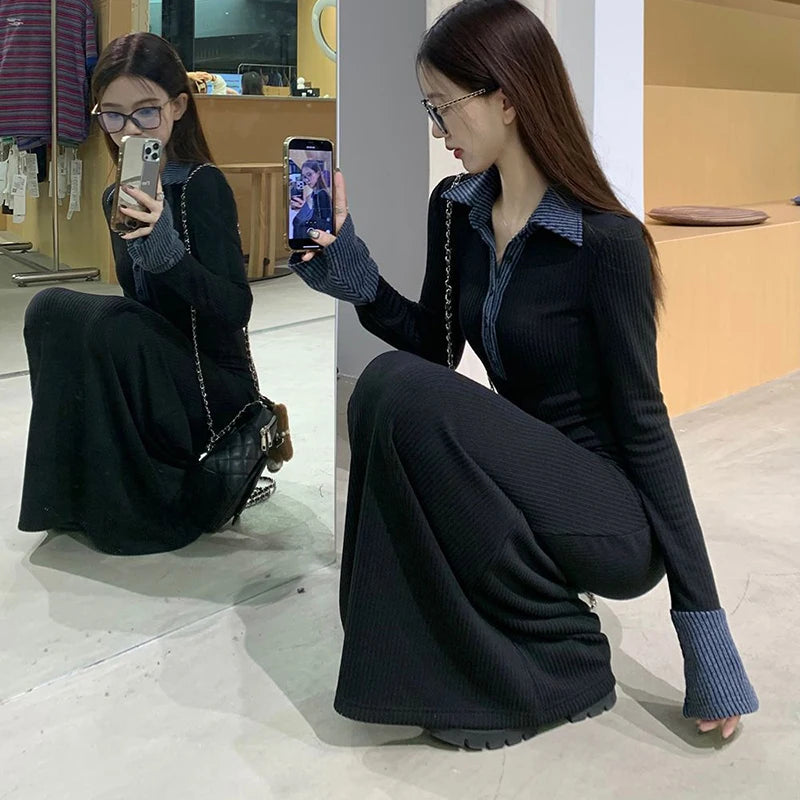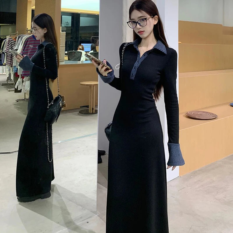 Bxoxo Black Patchwork Long Sleeve Knit Dress Women Autumn Korean Lapel Midi Dress Y2K Elegant Office Lady All Match Party Vestidos