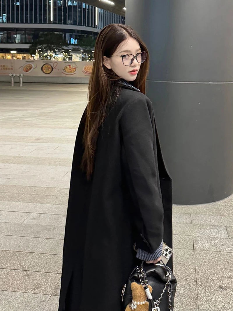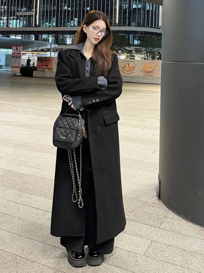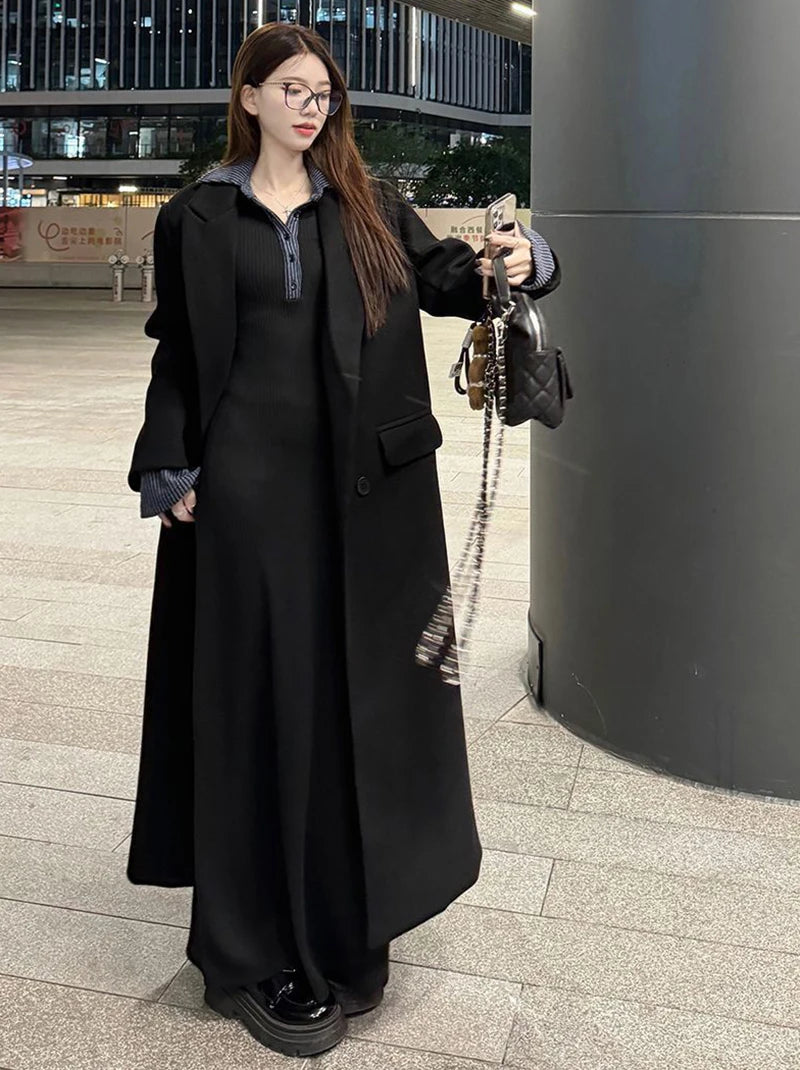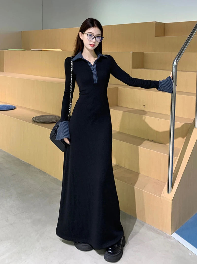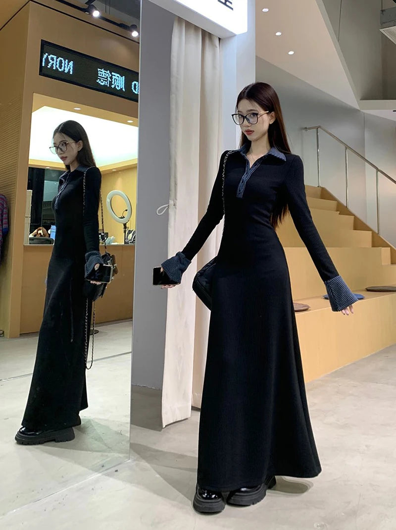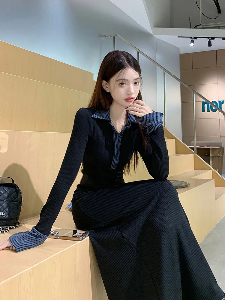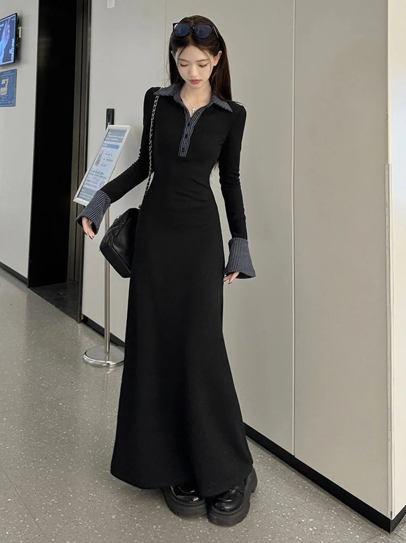 Bxoxo Black Patchwork Long Sleeve Knit Dress Women Autumn Korean Lapel Midi Dress Y2K Elegant Office Lady All Match Party Vestidos