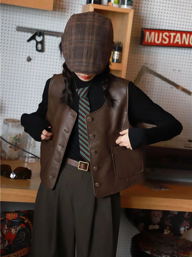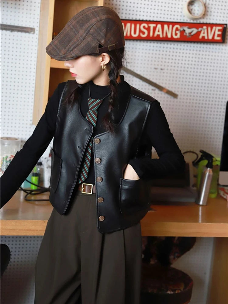 Bxoxo Black Pu Leather Vest for Women Autumn Casual Single Breasted O Neck Crop Jacket Y2K Vintage Loose Streetwear Sleeveless Outwear