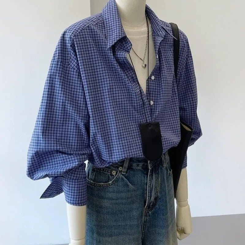 Bxoxo Blue Basic Vintage Plaid Women's Shirts Harajuku Long Sleeve Korean Fashion Blouses Loose Casual Commuting Youthful