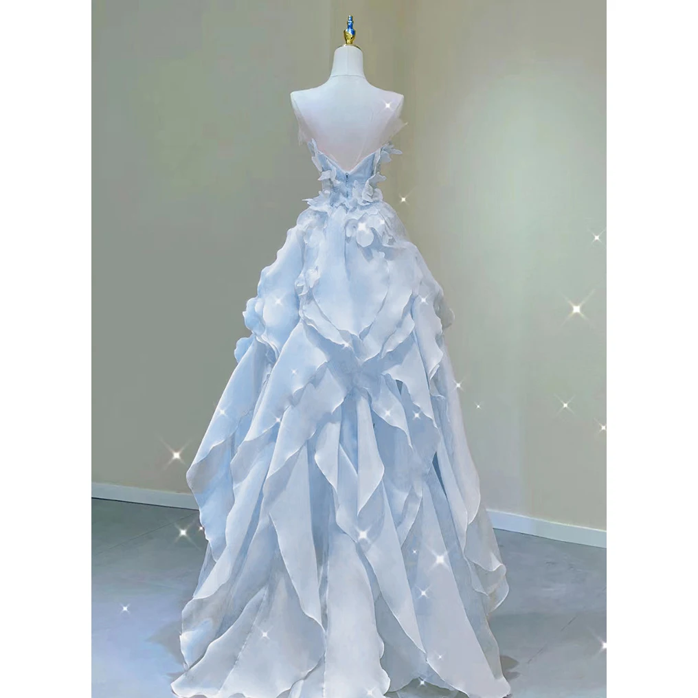 BXOXO Blue Evening Dress Women Luxury Elegant Ruffles Fairy Birthday Prom Gown Exquisite Sleeveless Bride Banquet High-end Host Dress