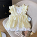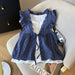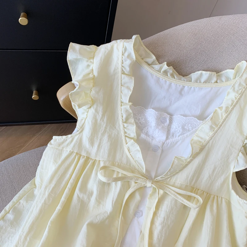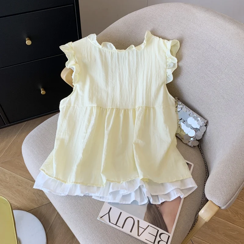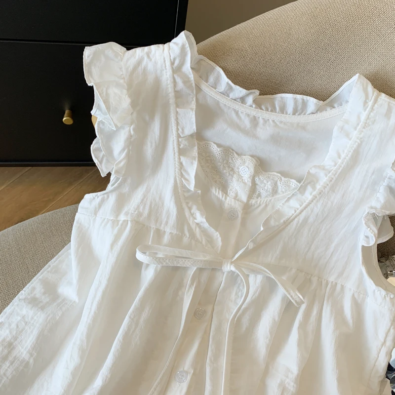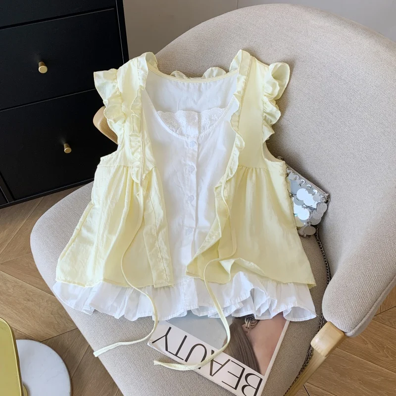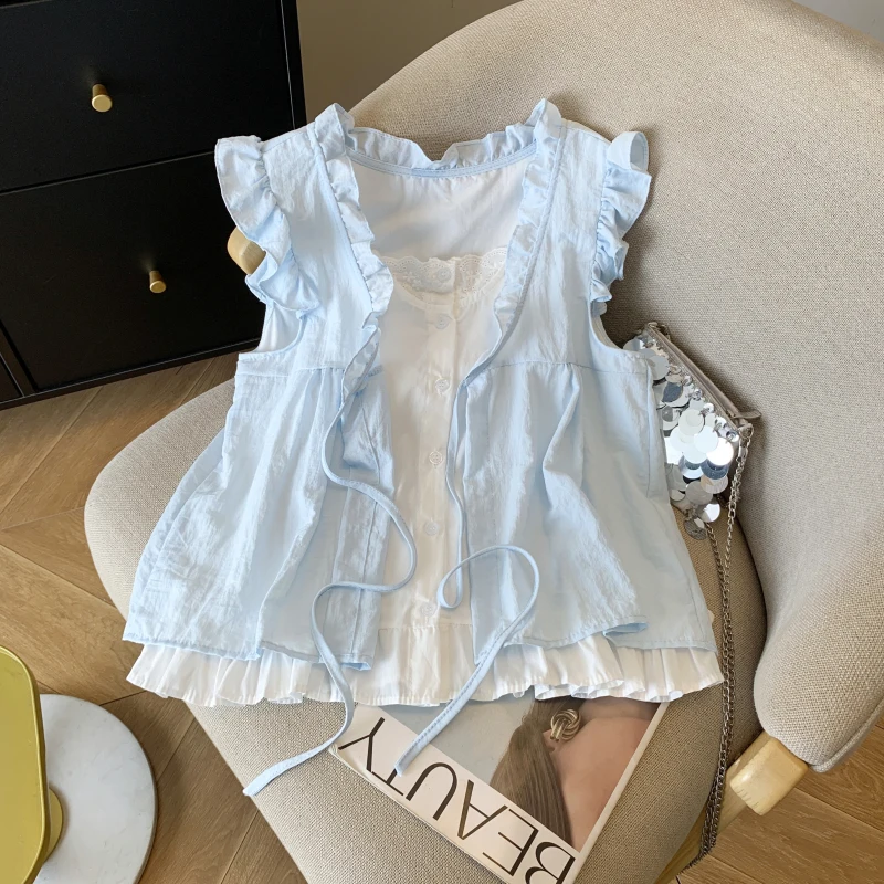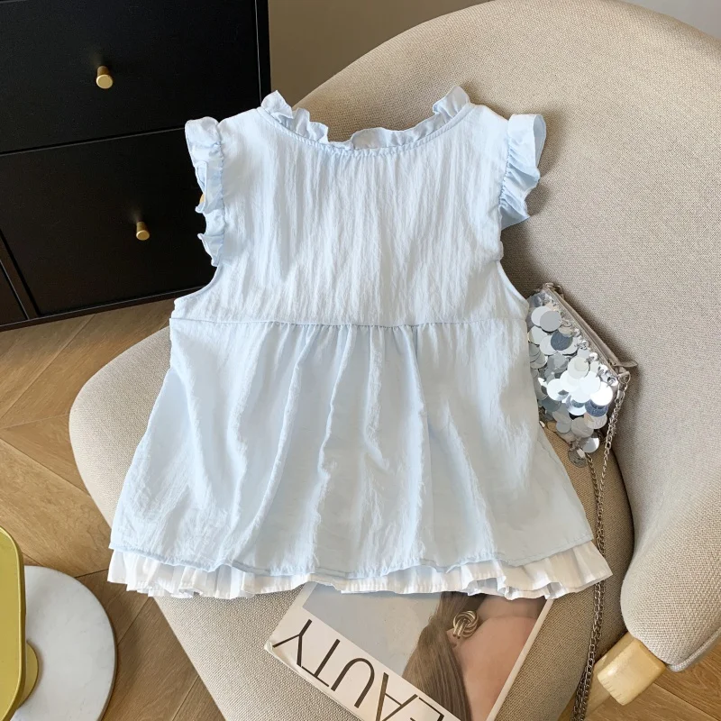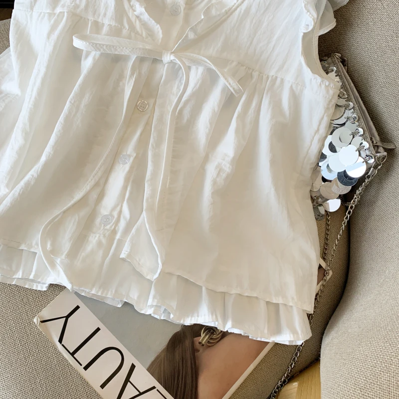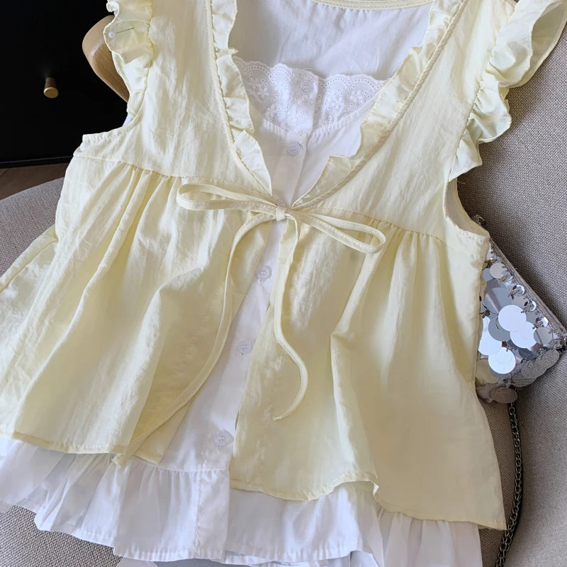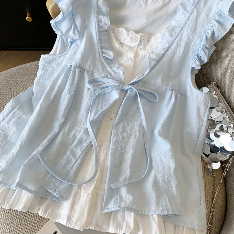 The bustier design with a tie belt adds a playful touch, enhancing the overall charm of the shirt.