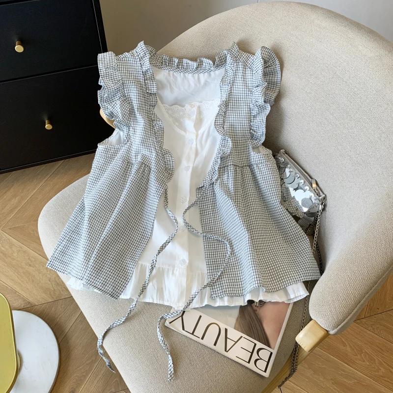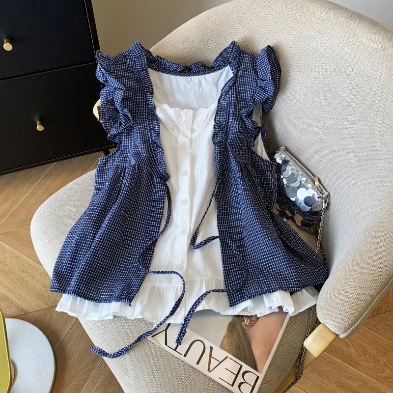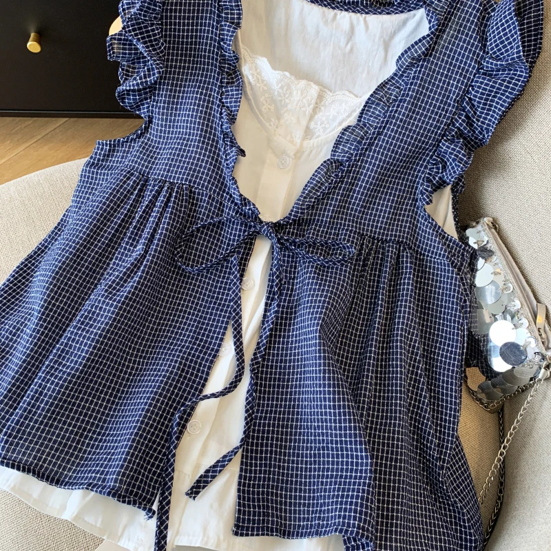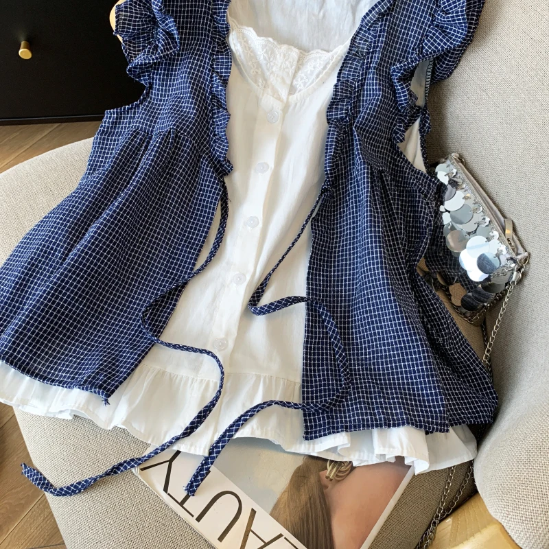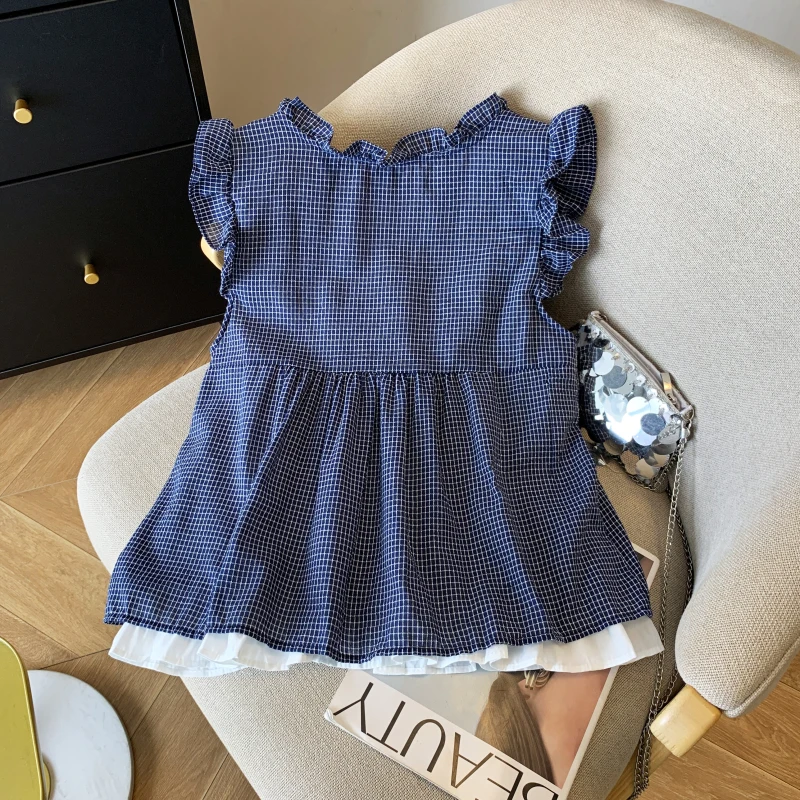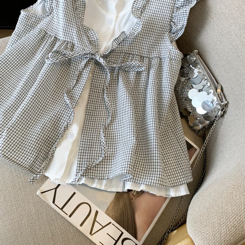 Bxoxo Blue Plaid irt-Like Two-Piece Women's Summer Thin Doll irt Beautiful Bow-Tie Fly Sve Sweet Sle Loose Fit Polyester F...