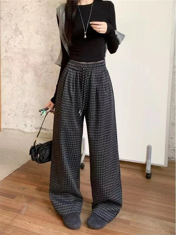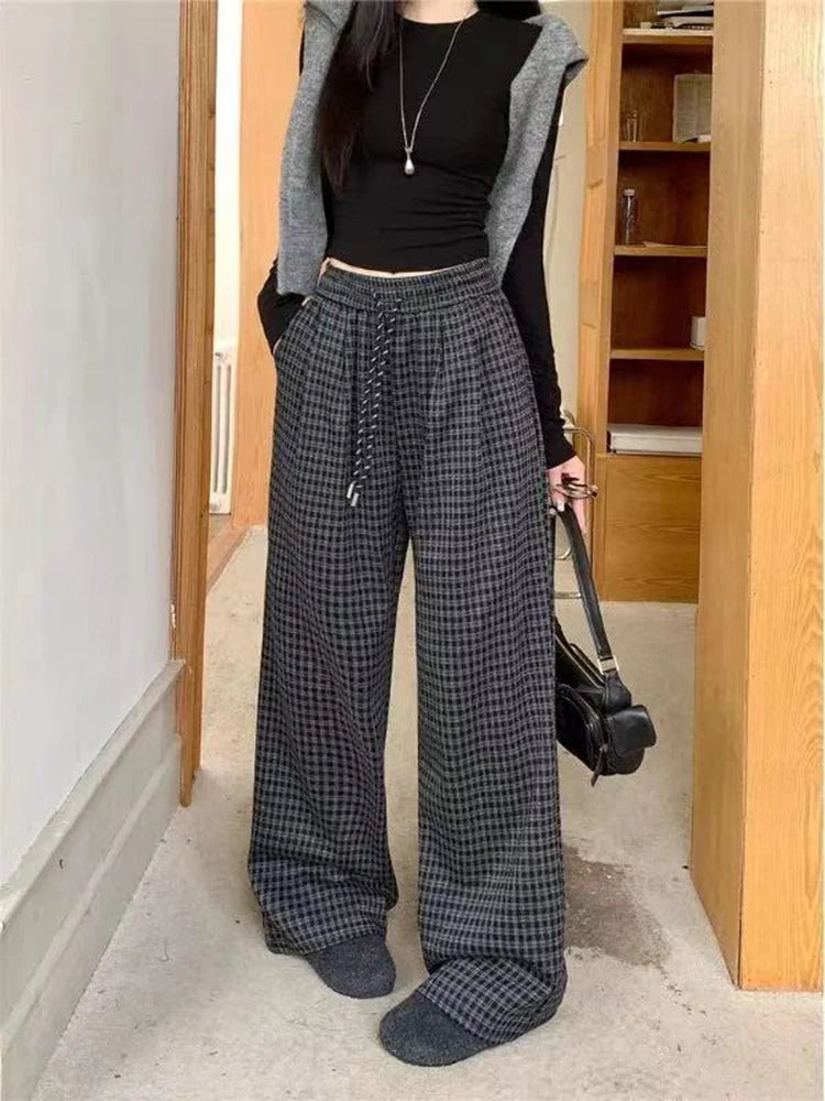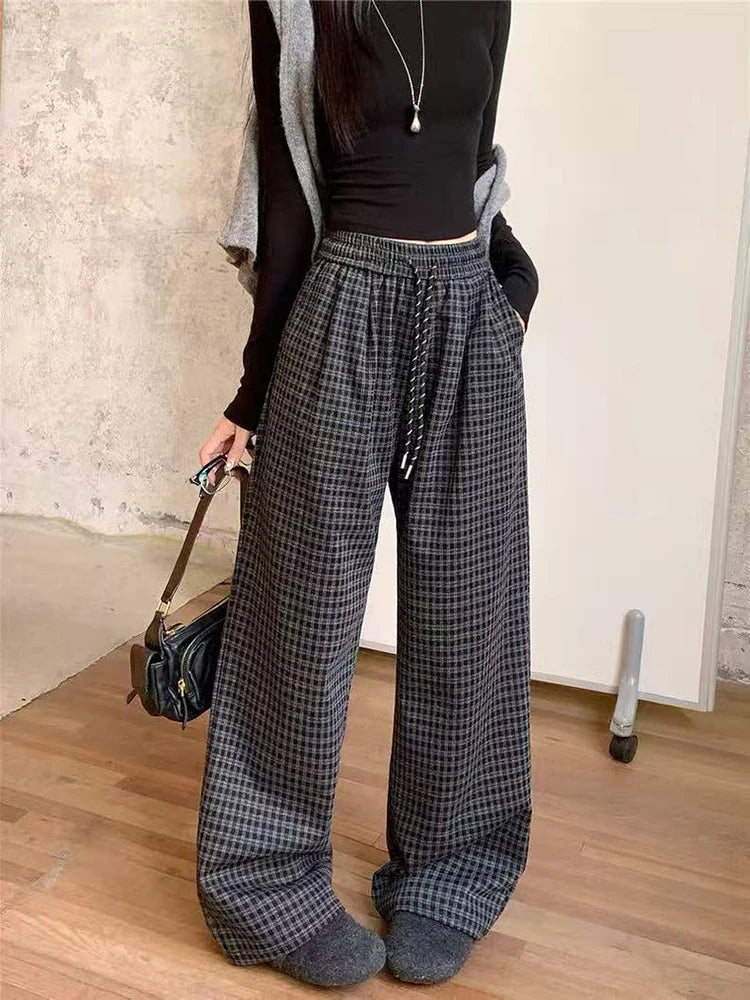 Bxoxo Blue Plaid Wide Leg Pants Women Autumn High Waist Drawstring Loose Casual Trousers Y2K Winter Thick Casual Ankle Length Pants