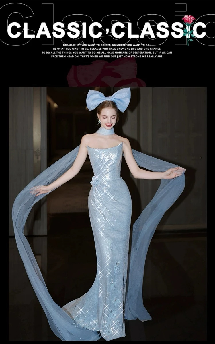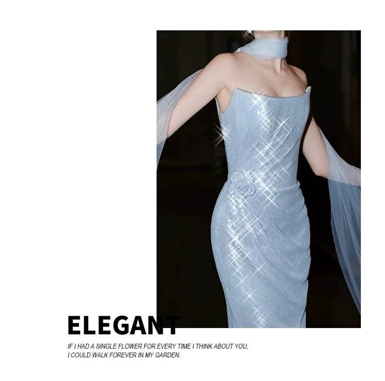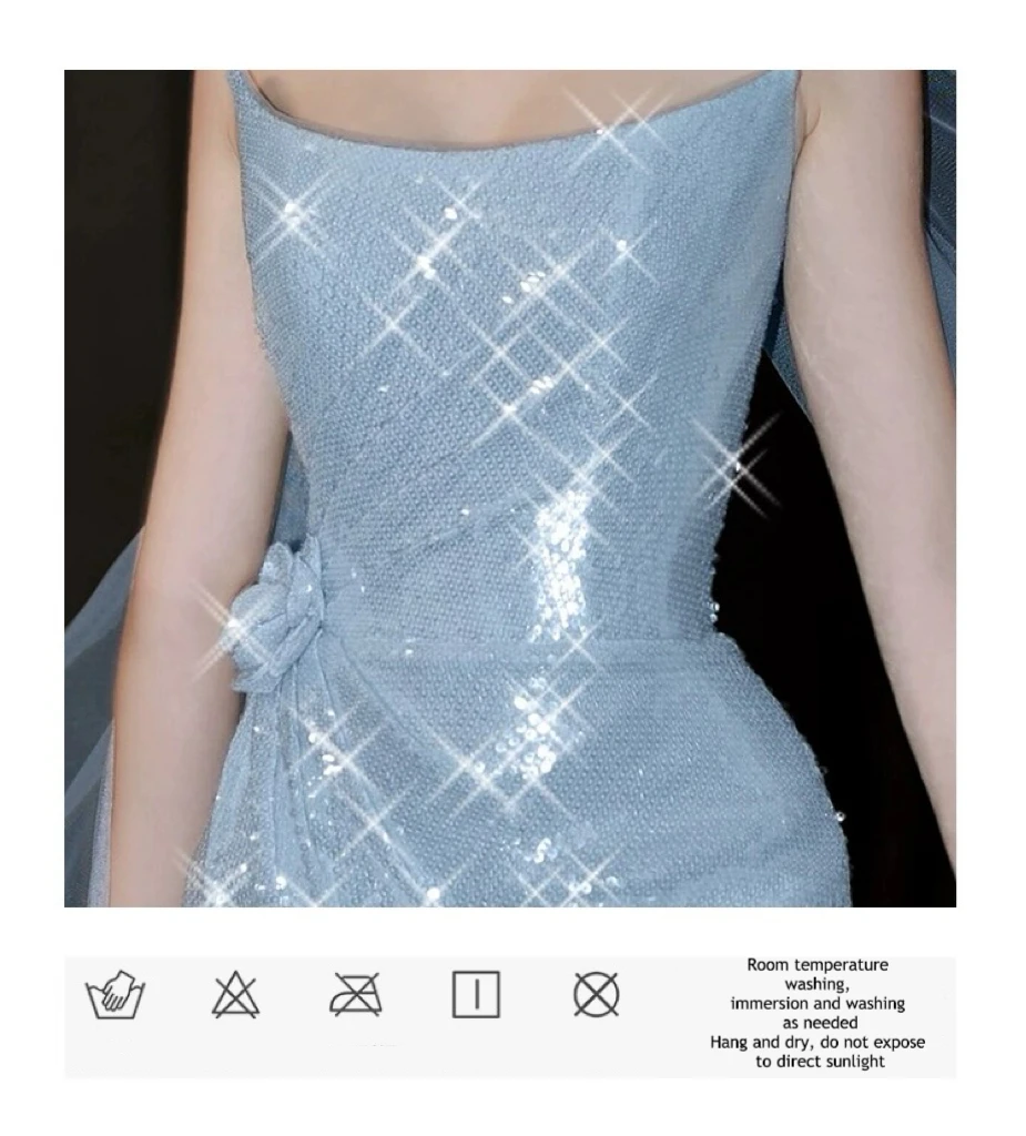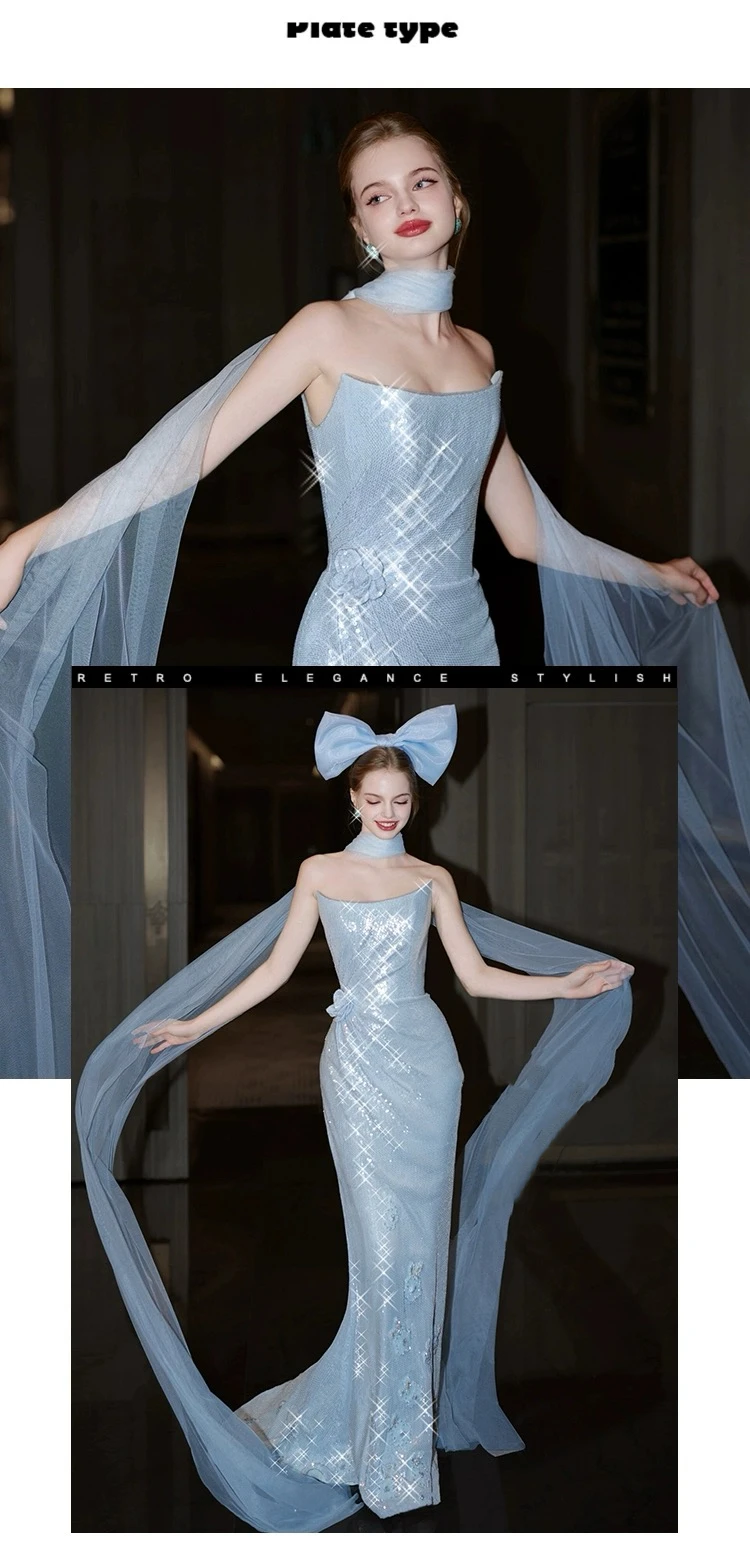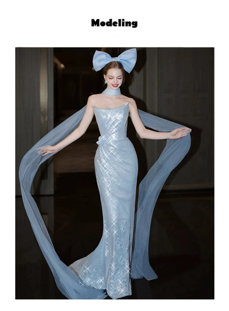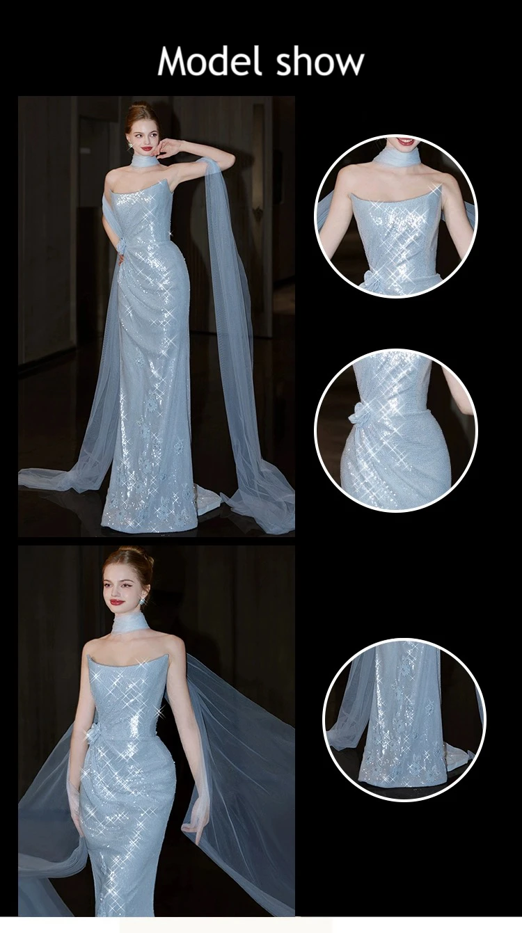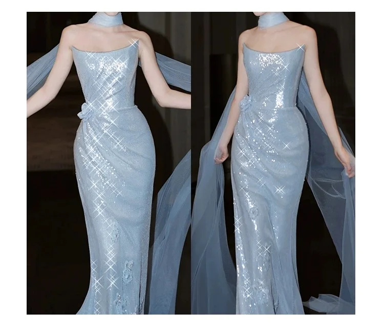 Bxoxo Blue Senior Evening Dress Shiny Sequins Off The Shoulder Sleeveless Mermaid Slim Trailing Backless Party Prom Celebrity Gown