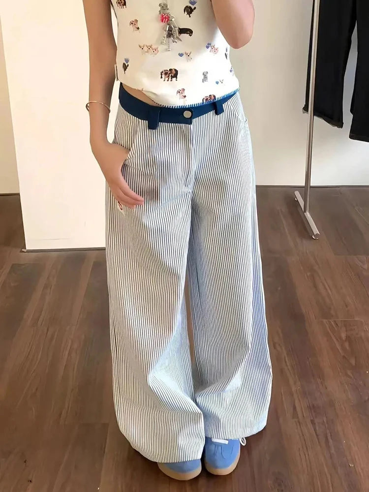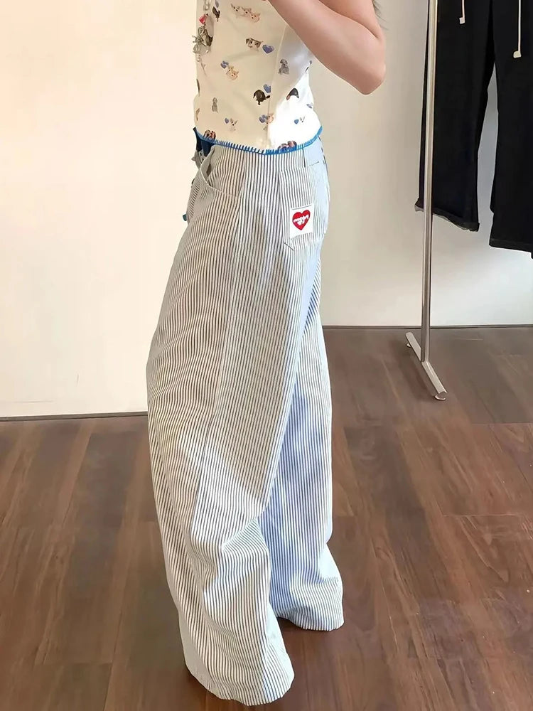Bxoxo Blue Striped Patchwork Jeans Women Y2K High Waist Streetwear Embroidery Wide Leg Trousers Bf Korean Casual Straight Cowboy Pants