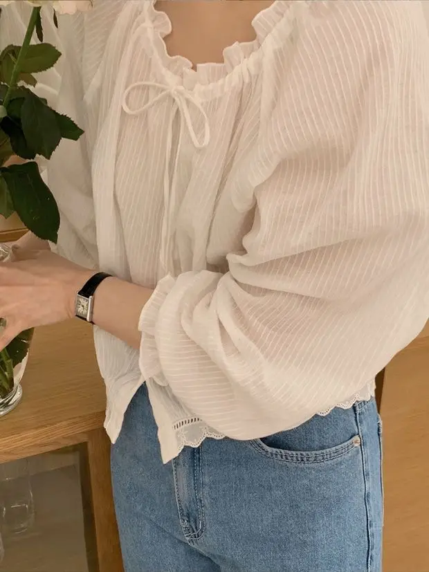 Bxoxo Chic Lace irt Women's ort Korean Sle oulder Insert Sves White Slimming Top V-Ne Long Sve Commute Faion