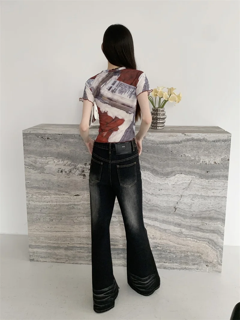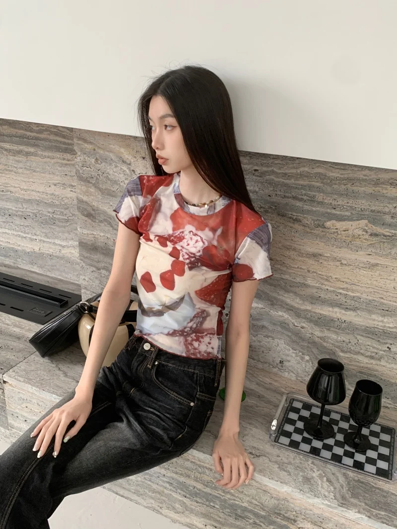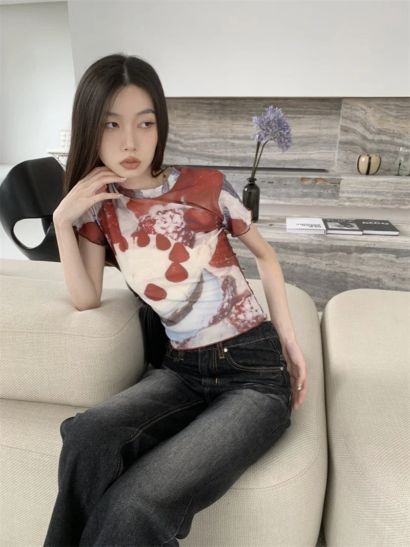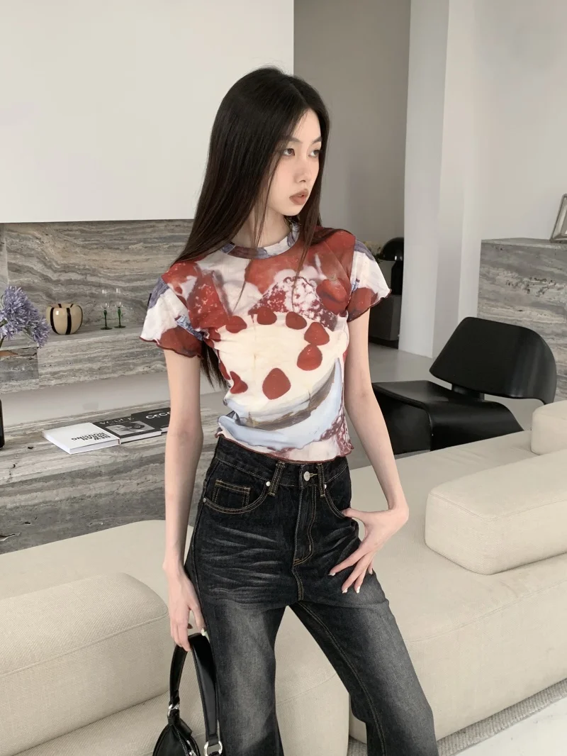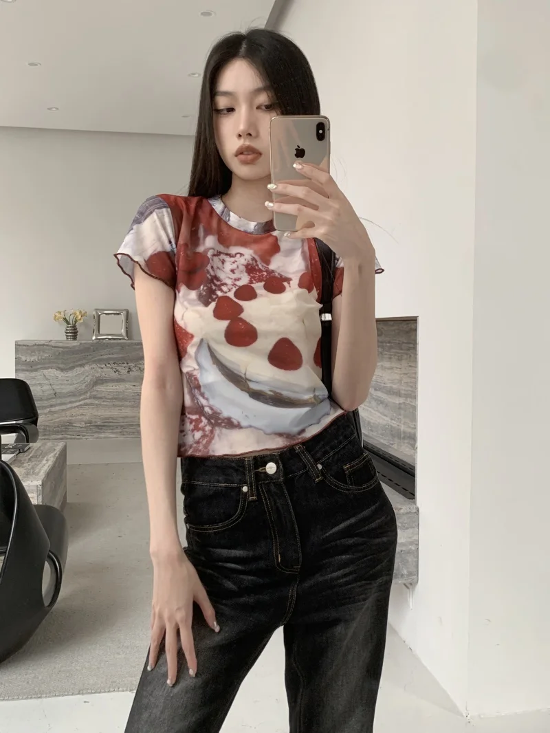 BXOXO Chic See Through Mesh Tops Short Sleeve Crop Top T Shirt Print Cake Graphic Tees Women Clothes Korean Style E Girl Y2k