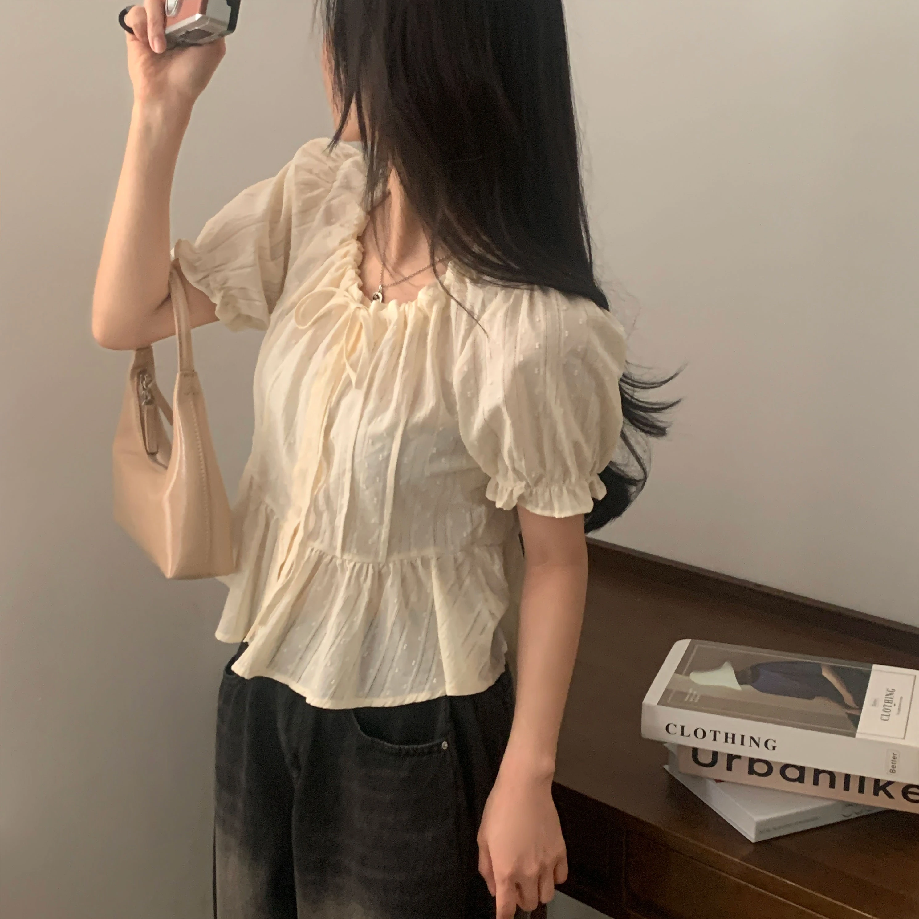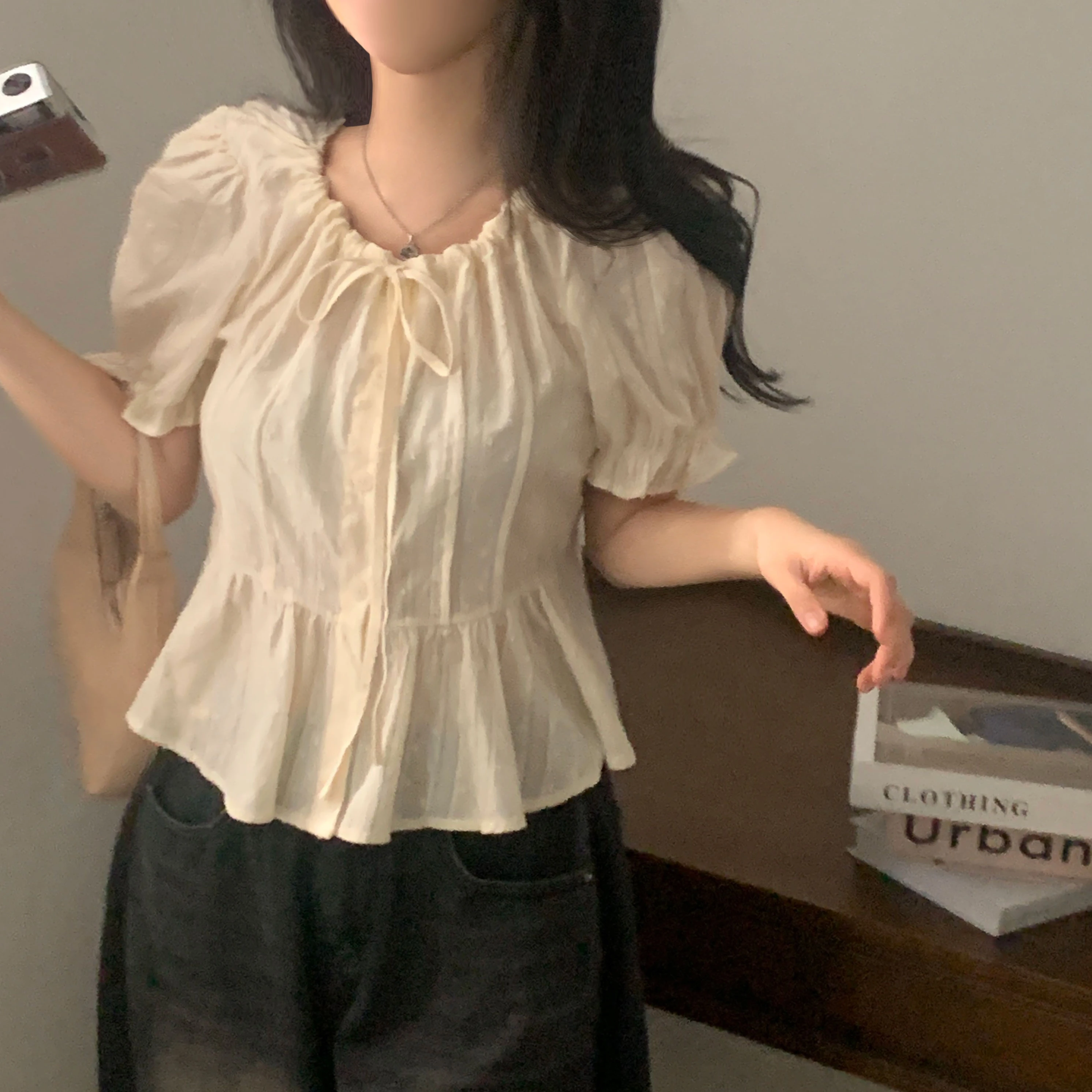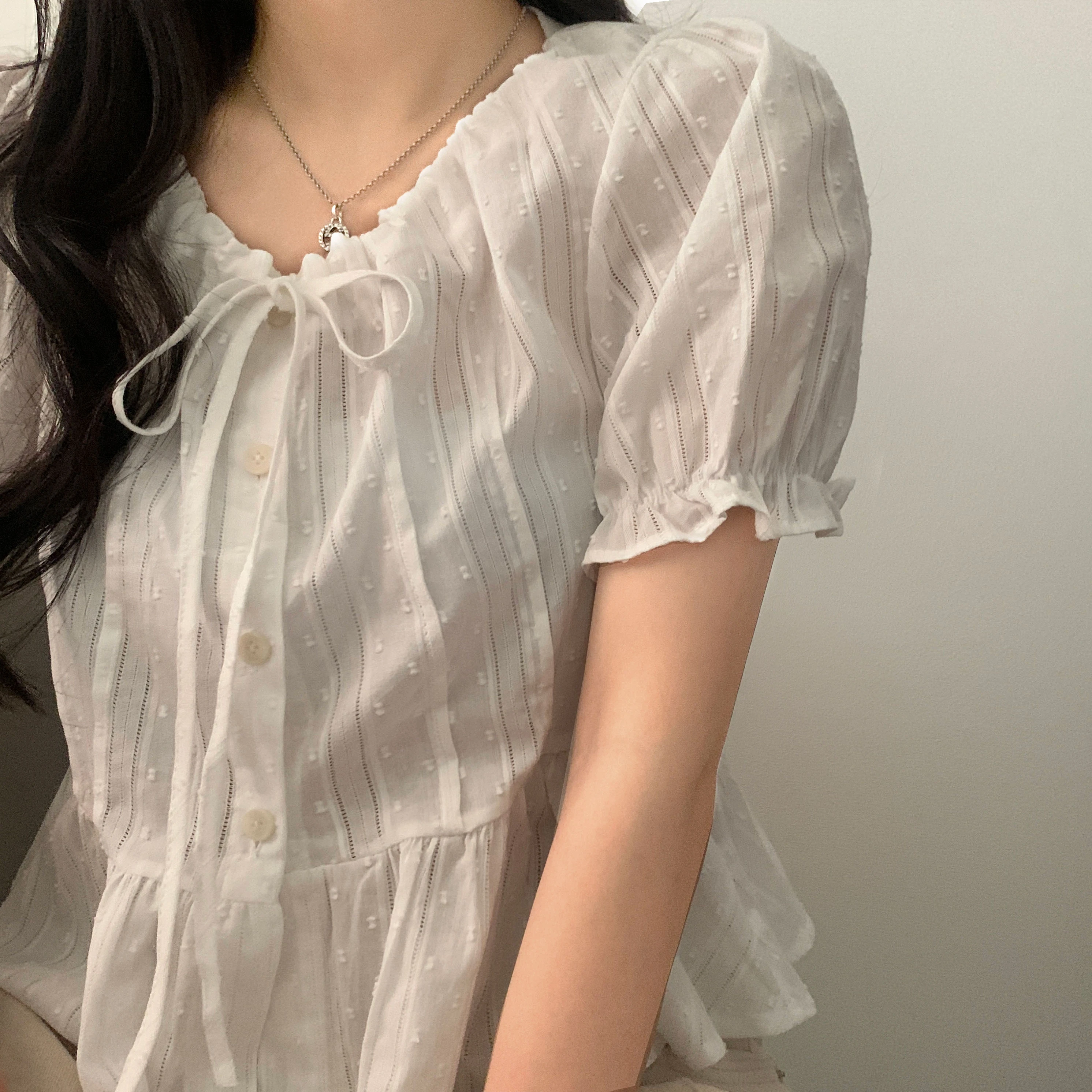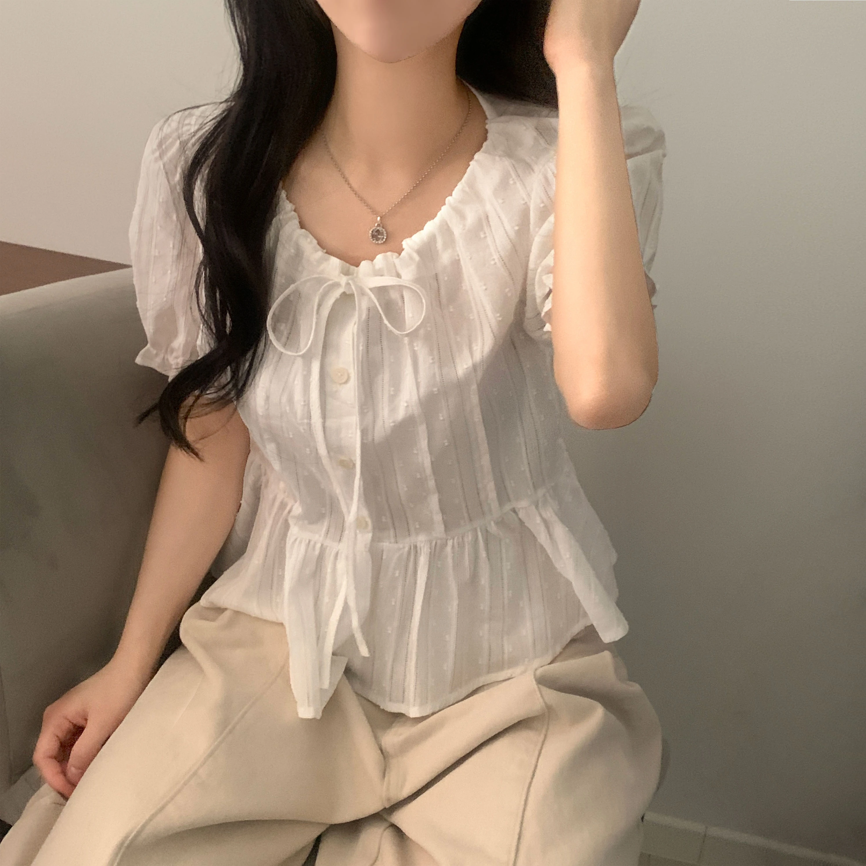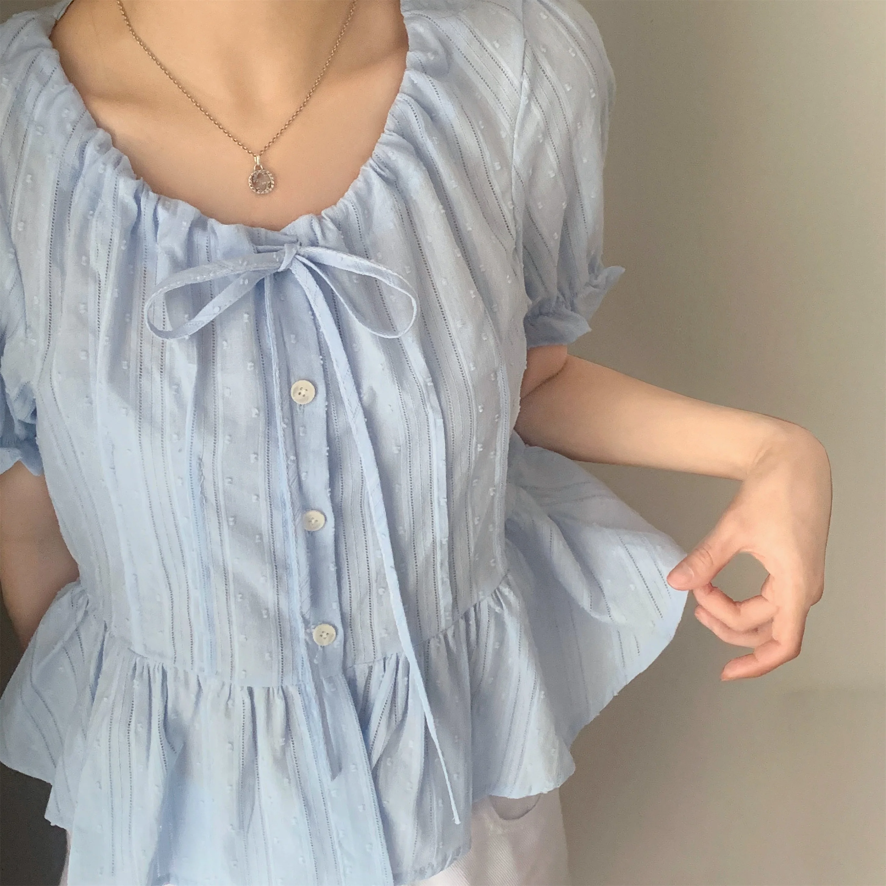 Bxoxo Chic Summer New Sweet Design Sense Bow Tie Flower Embroidery Bubble Sve Top Women's irt Fre Sle round Ne ort Sve