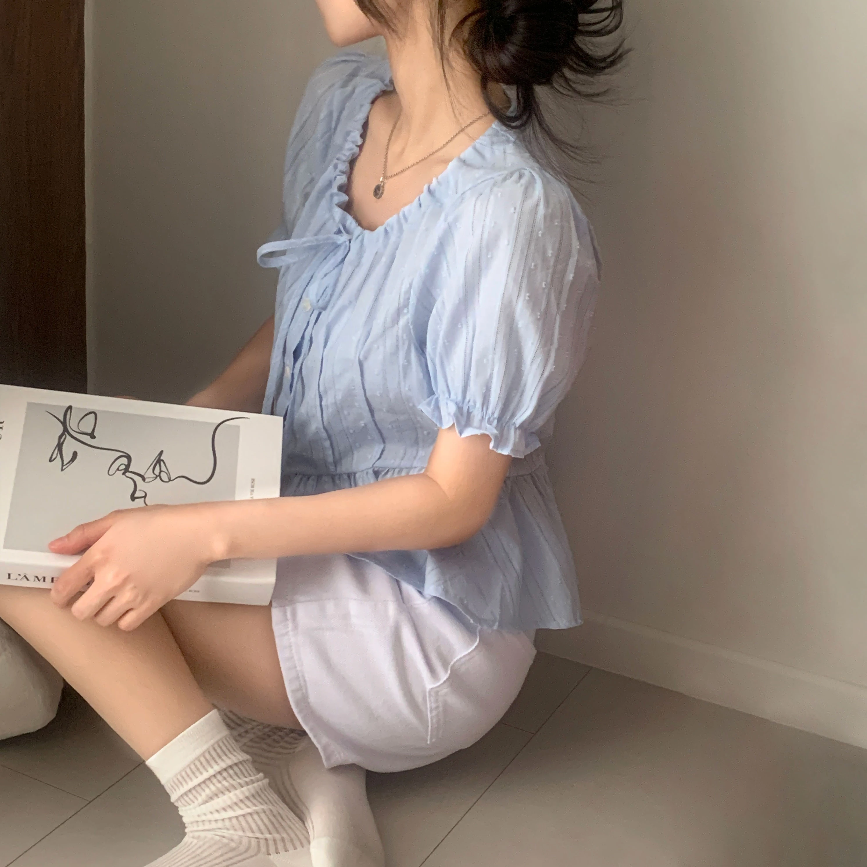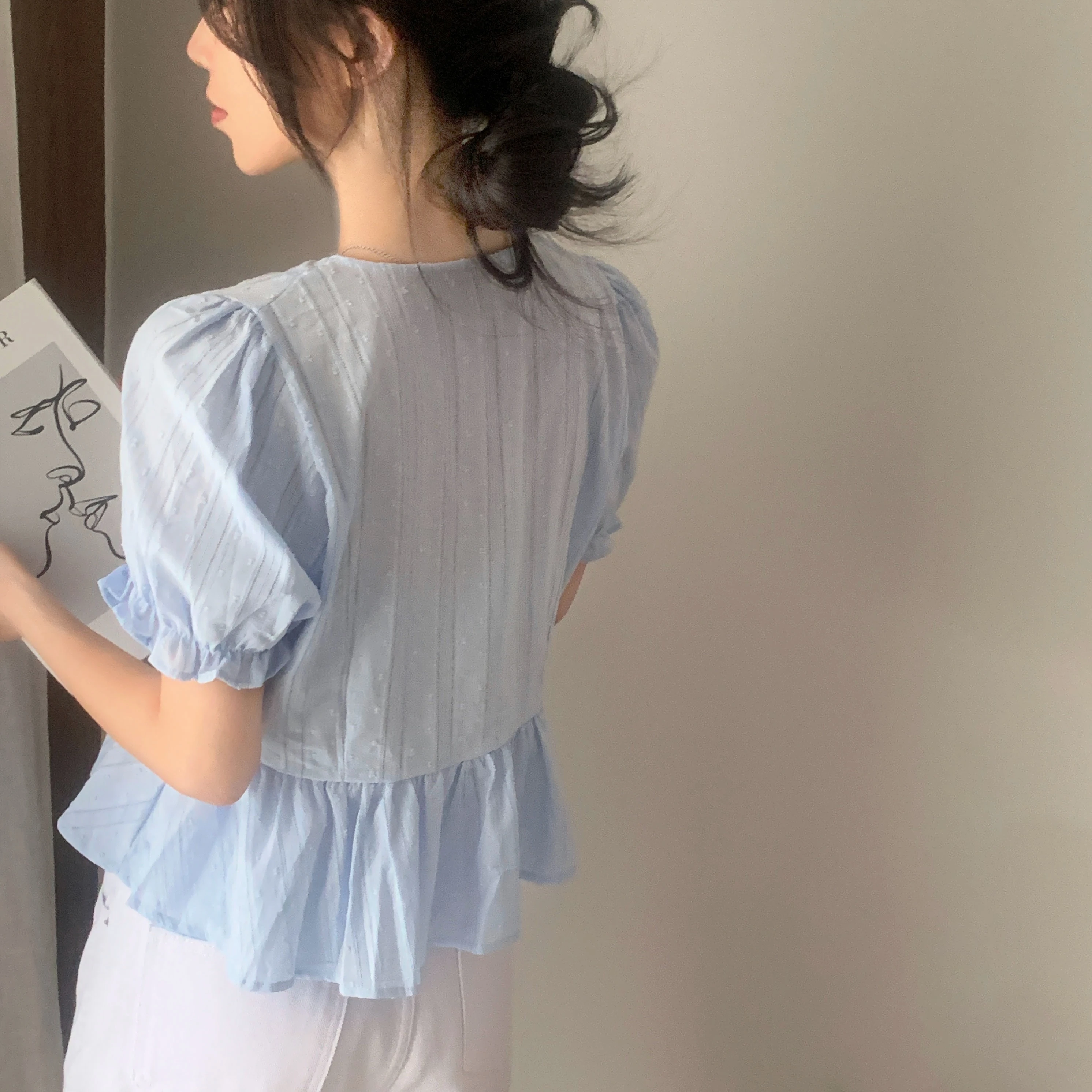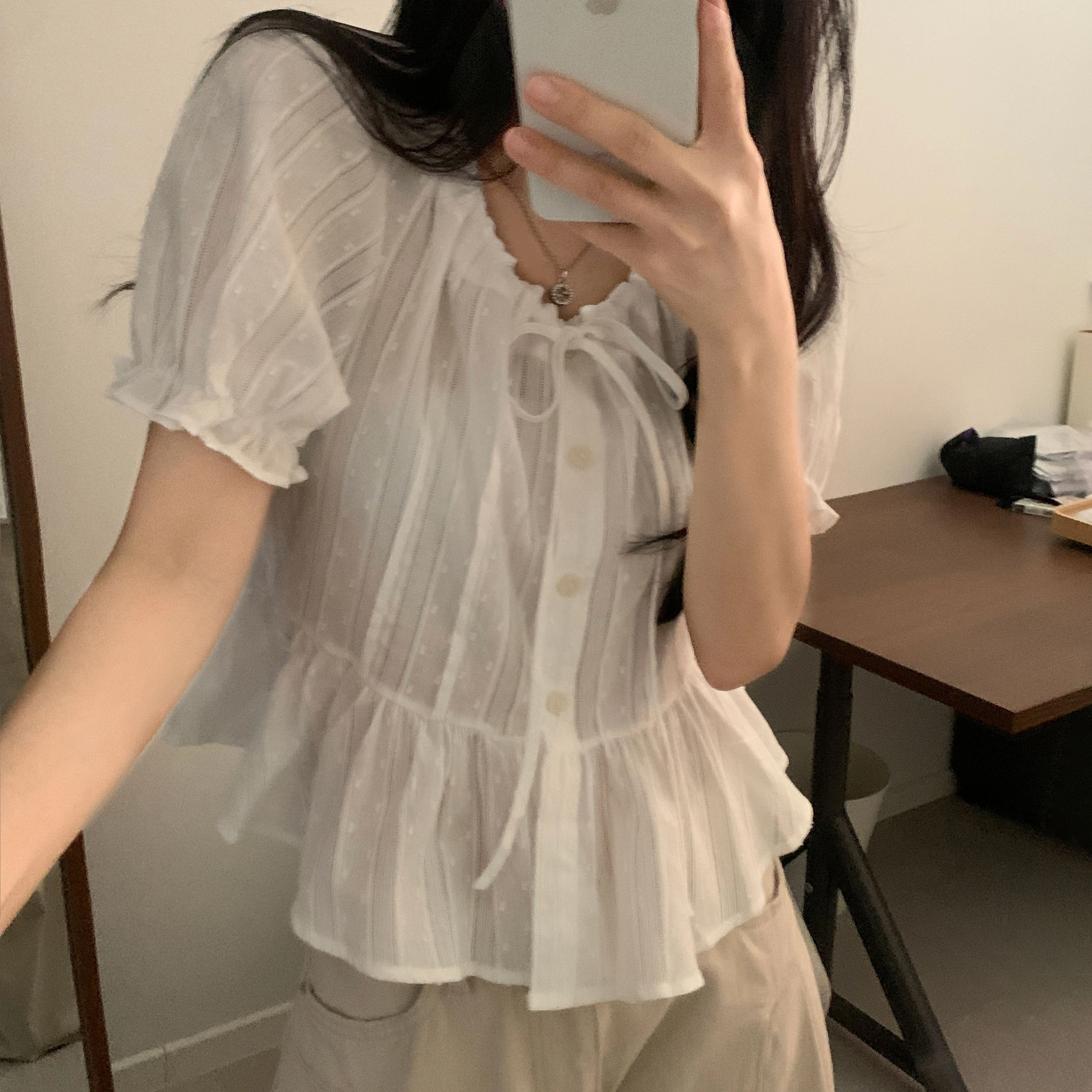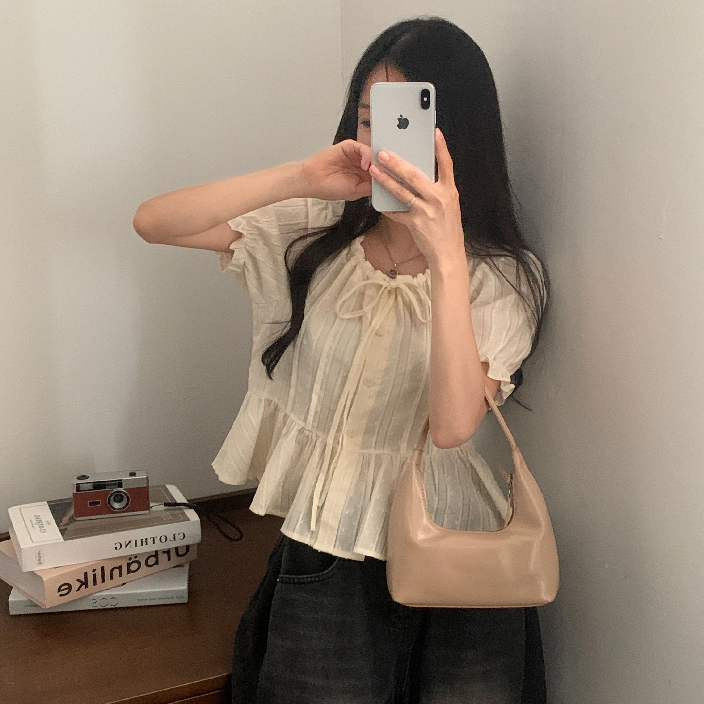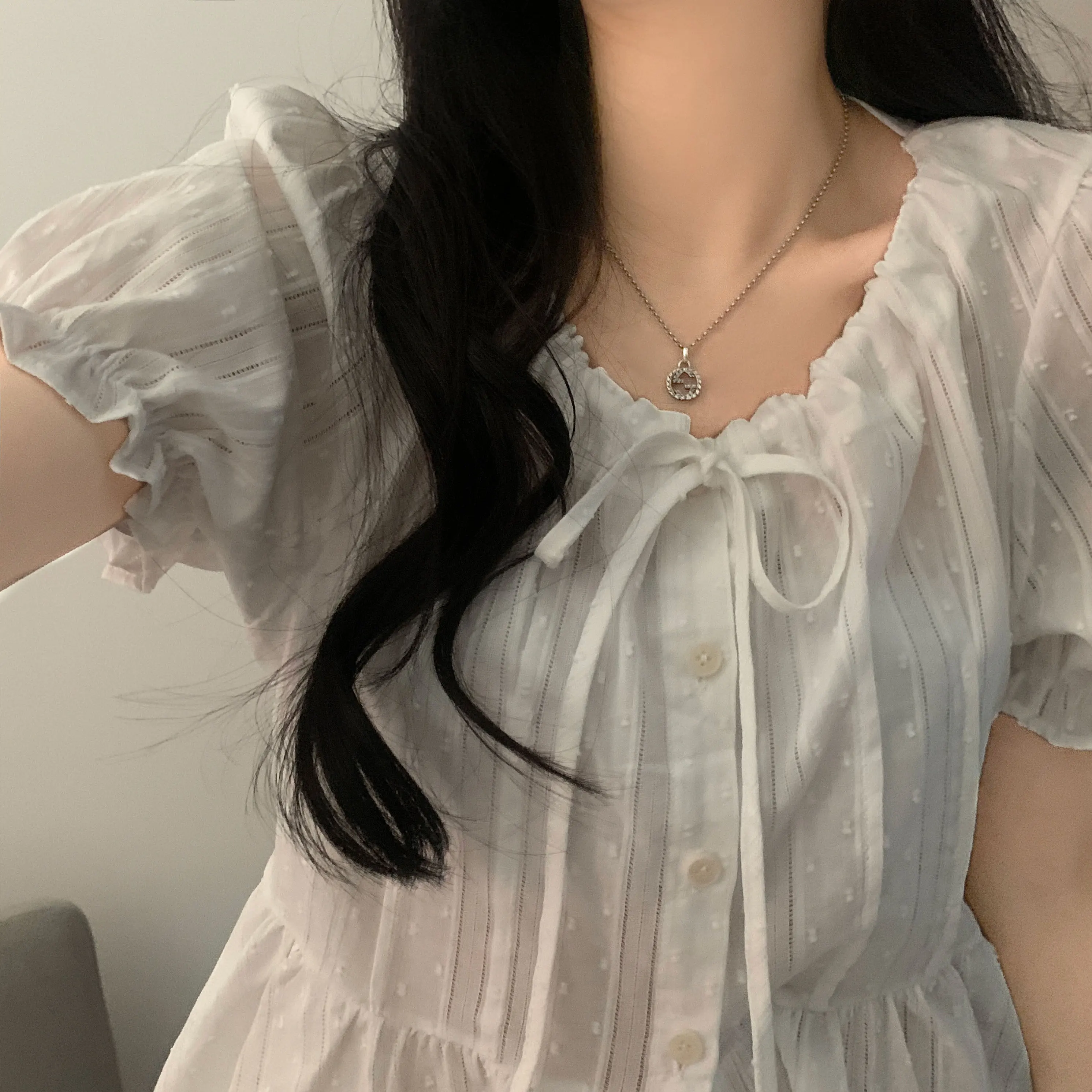 Bxoxo Chic Summer New Sweet Design Sense Bow Tie Flower Embroidery Bubble Sve Top Women's irt Fre Sle round Ne ort Sve
