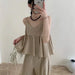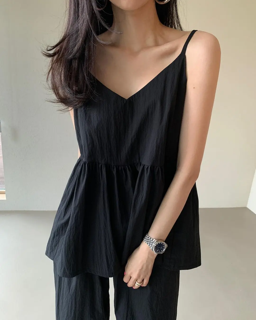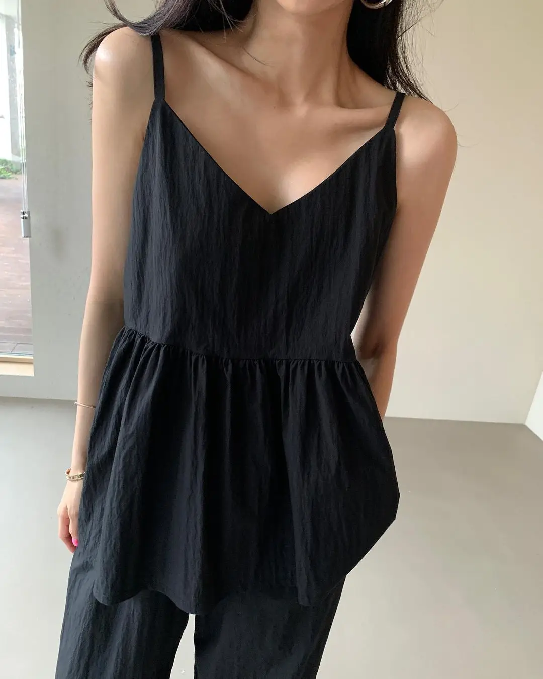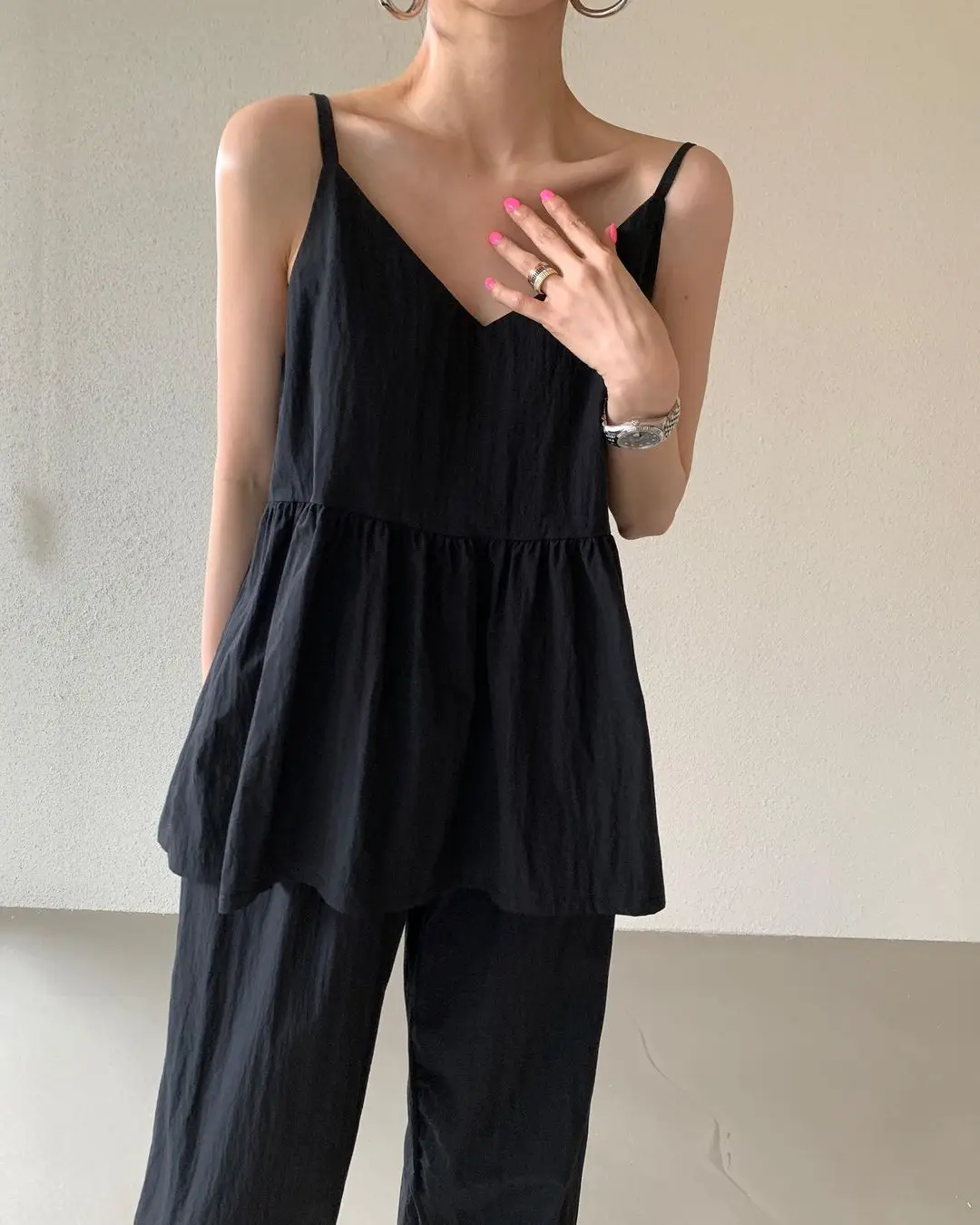 Bxoxo Chic Summer V-ne Casual Wide-leg Pants Set with Pleated Top + High-waist Faionable Women's Ensemble