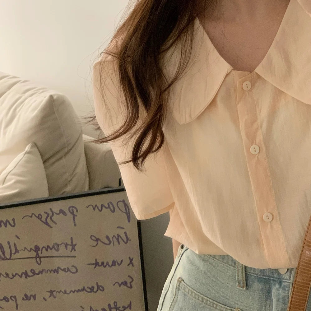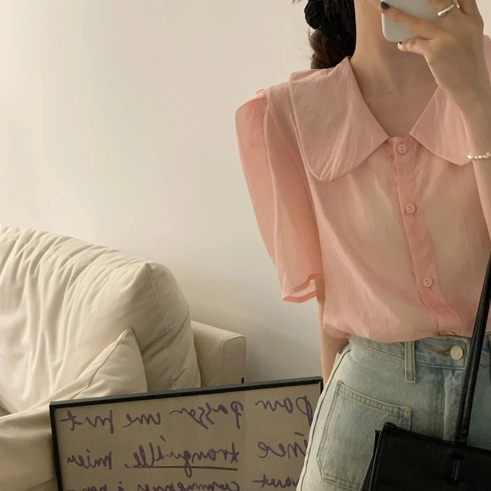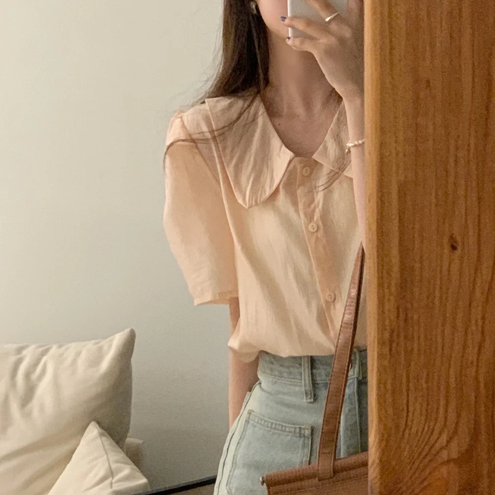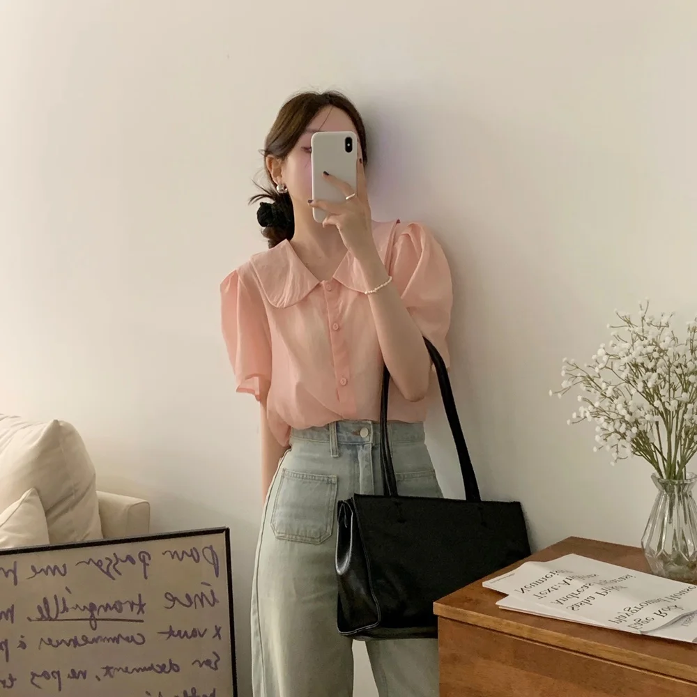Bxoxo Chic Summer Versatile Simple Doll Collar Bubble Sve Single Button Loose ort Sve irt Women's Faion Casual Polyeste...