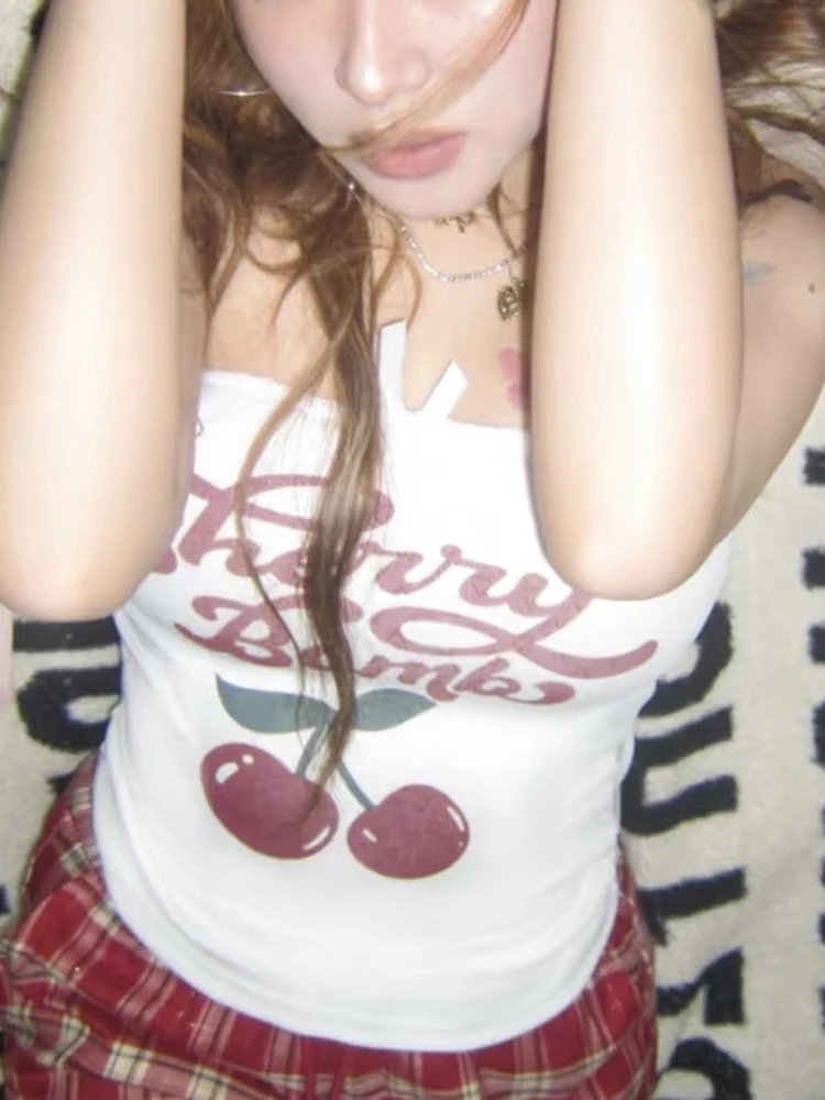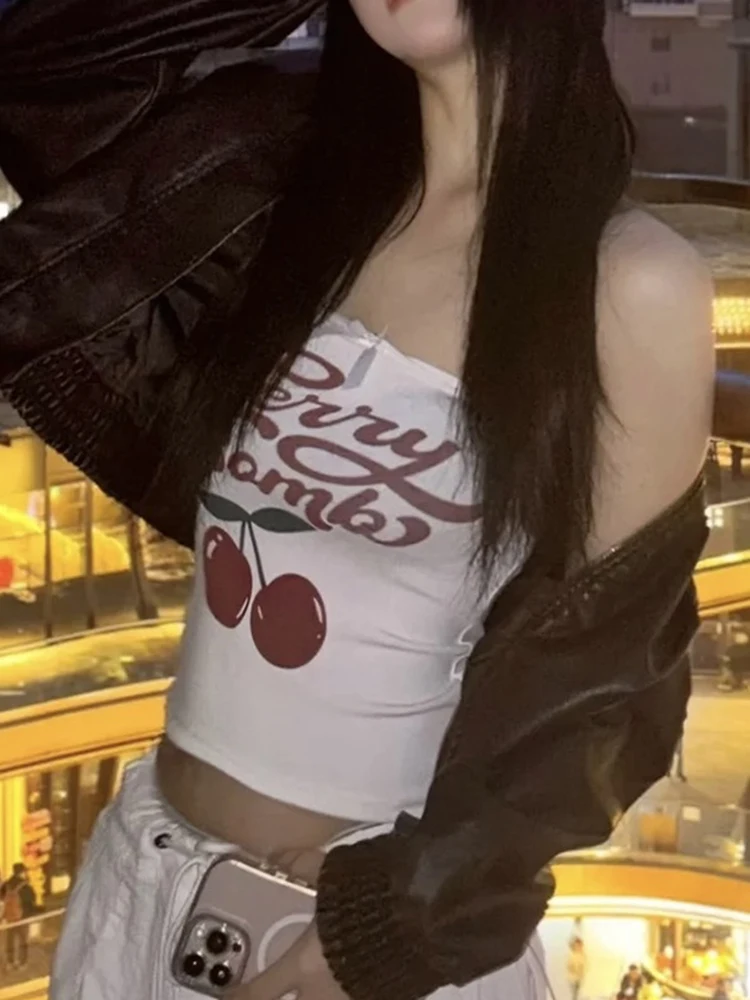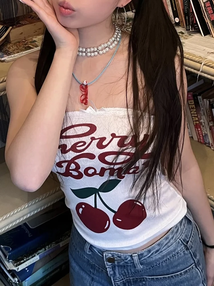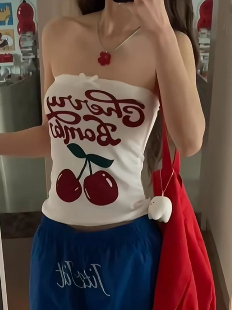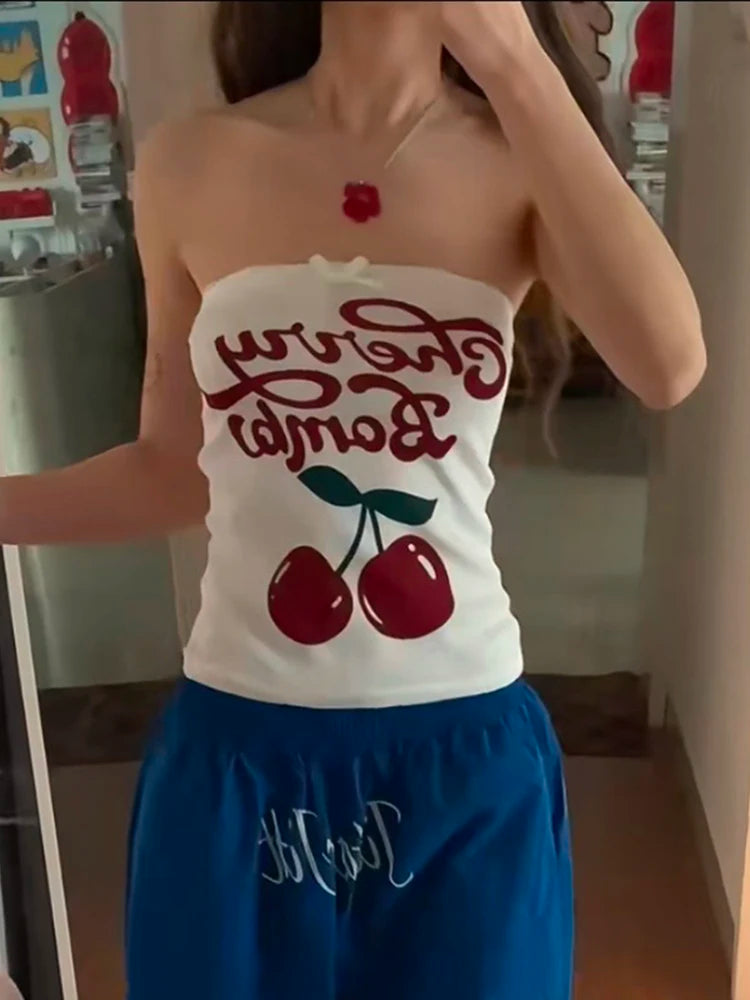 BXOXO Classic Cherry Letter Print Tube Tops Women Bow High Elasticity Skinny Summer Trend Simple Versatile Daily Girly Clothes