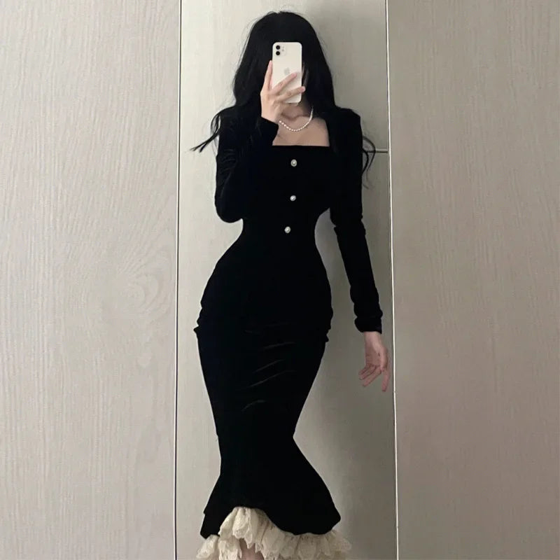 • Elegant Black Velvet :This dress is crafted from luxurious black velvet, offering a sophisticated and stylish look for any occasion.