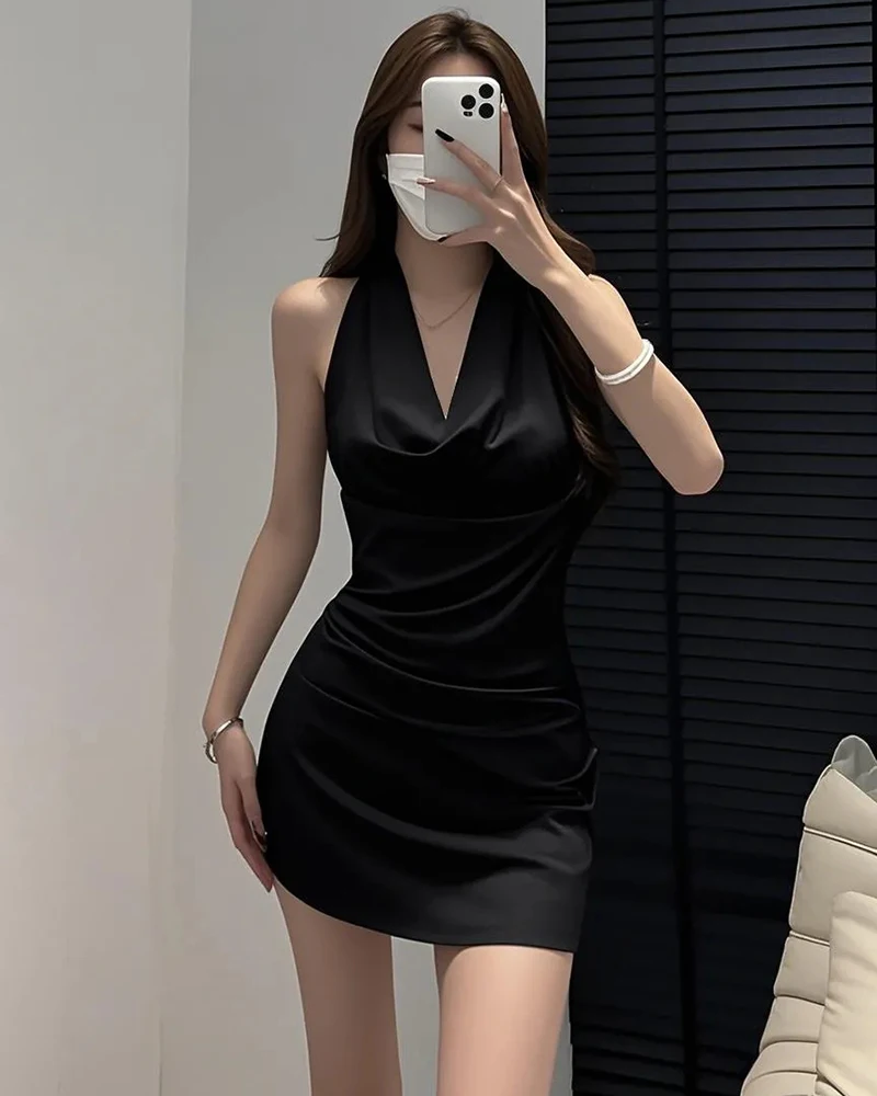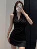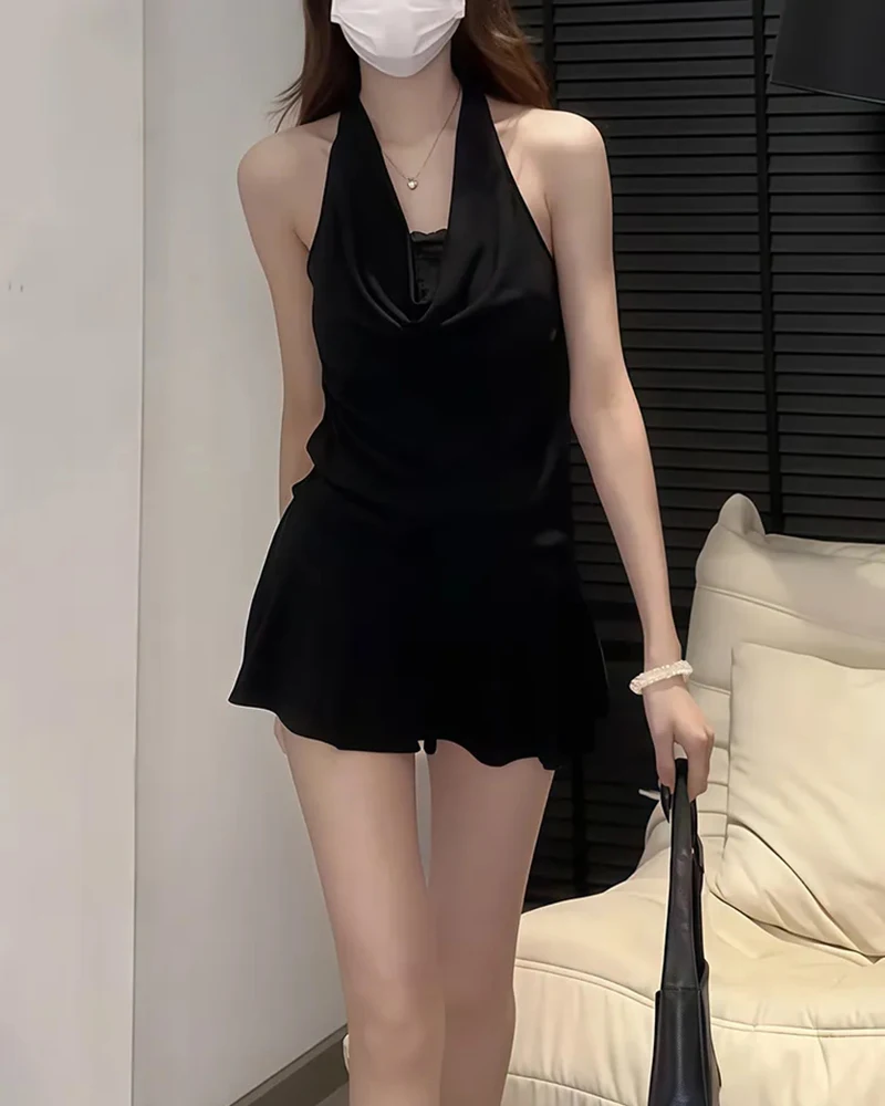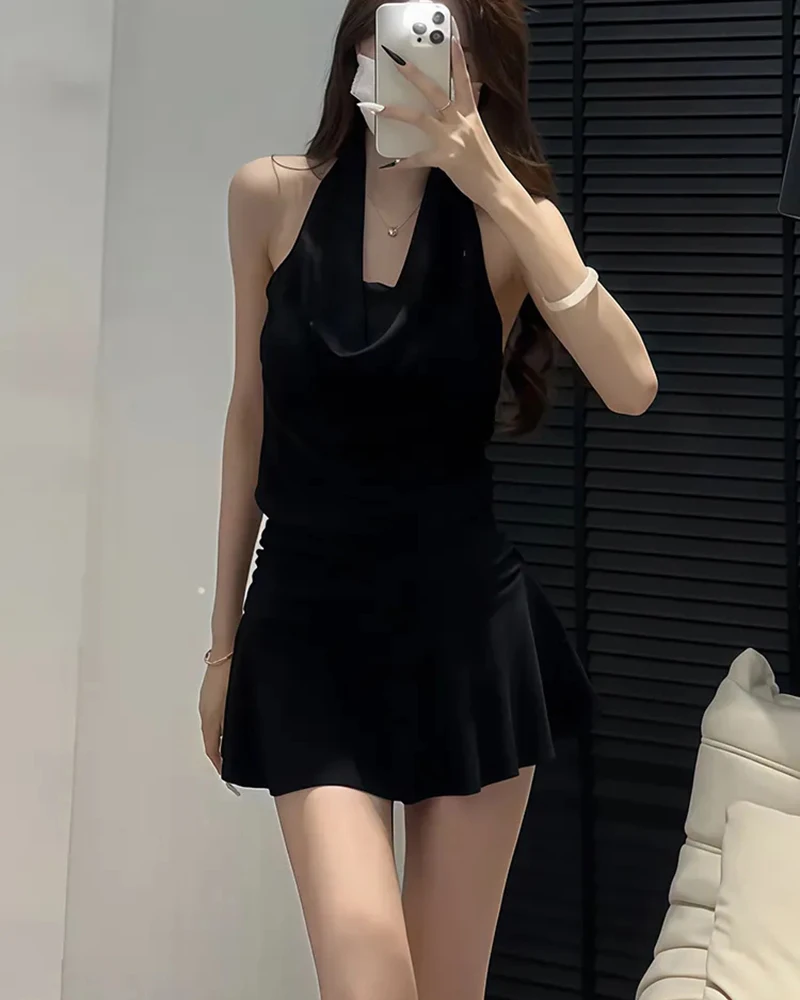 Bxoxo Elegant Halter Neck Black Mini Skirt Women Summer Fashion Lace Patchwork Slim Dress Y2K Sexy Off Shoulder Sleeveless Vestidos
