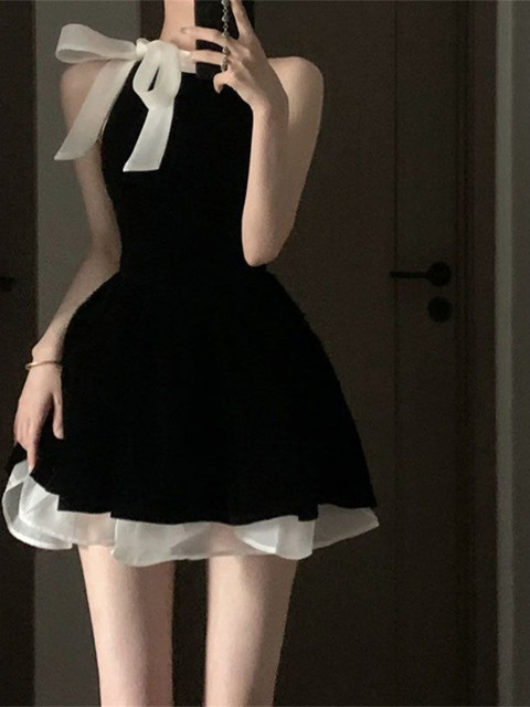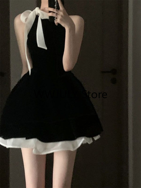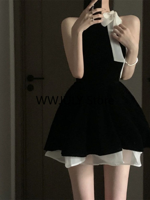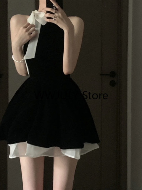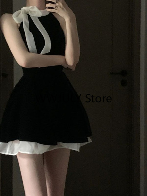 Bxoxo Elegant Halter Neck Dress Woman Y2K Black Hepburn Style Bow Bandage Sleeveless Mini Dress Summer Slim Patchwork Party Vestidos