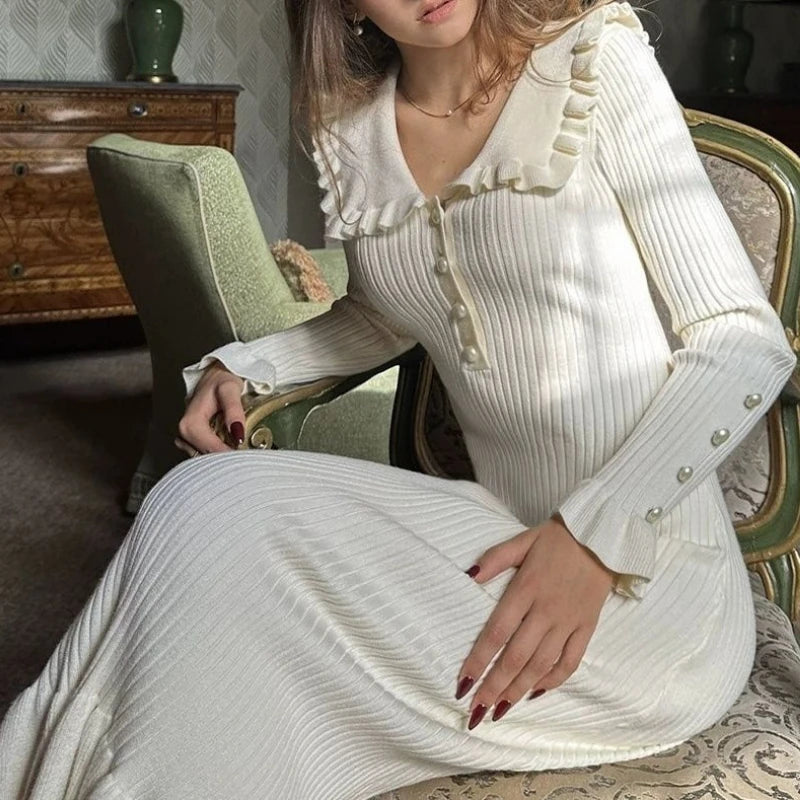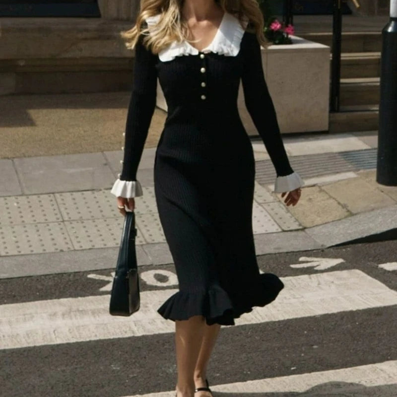 Bxoxo Elegant Knitted Long Skirt Women Black Vintage Long Sleeve Party Dresses Sweet Ruffle Patchwork Sweater Maxi Dress Slim