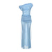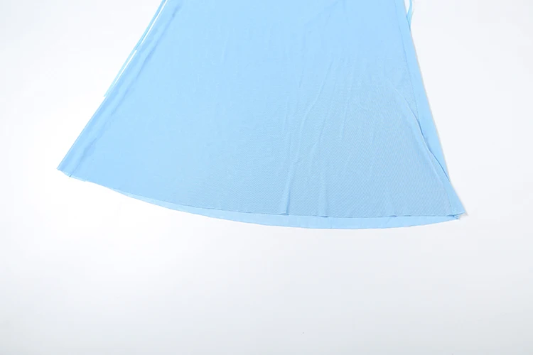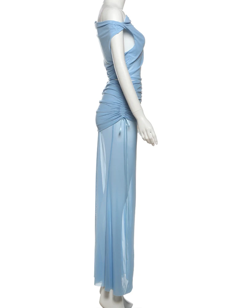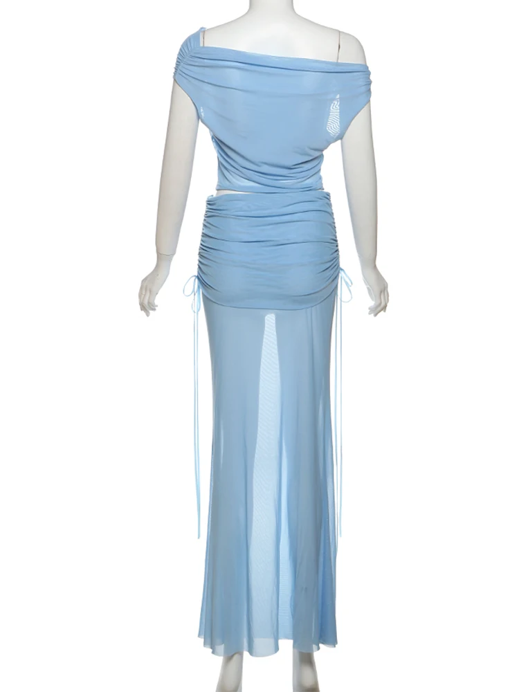 BXOXO Elegant Mesh See Through 2 Piece Set Women Skew Collar Backless Crop Tops+Ruched Ribbon Long Skirts Vacation Outfits