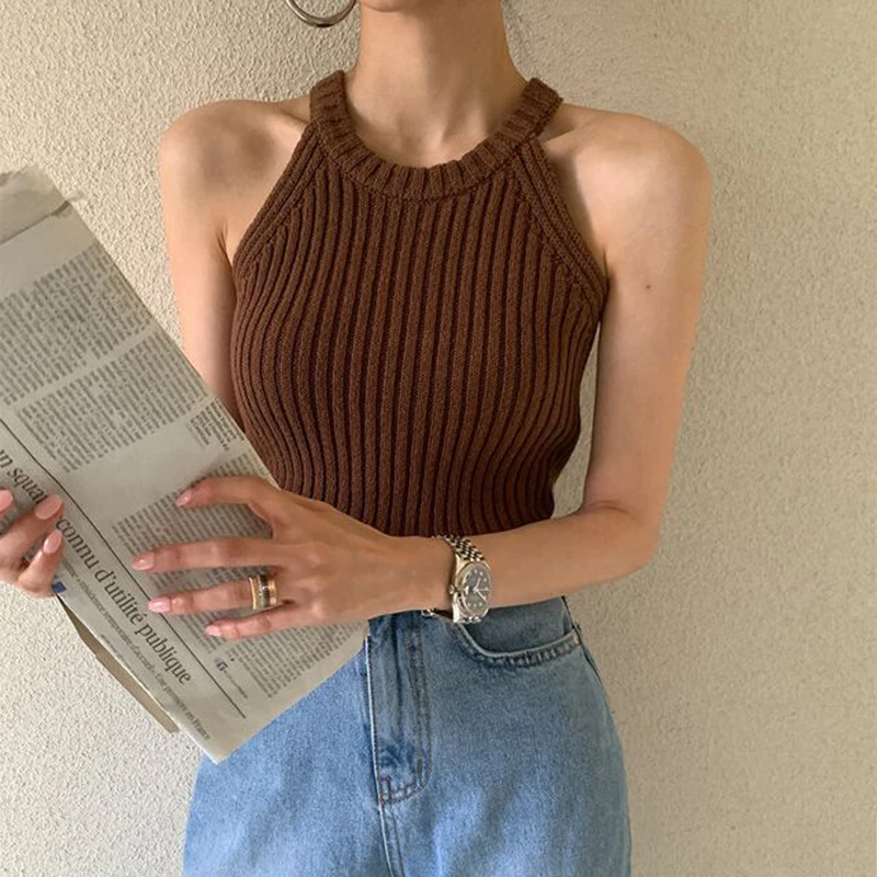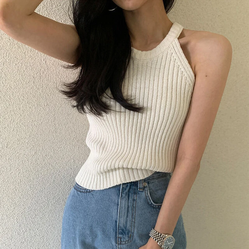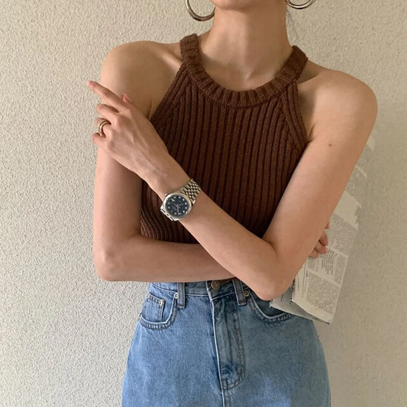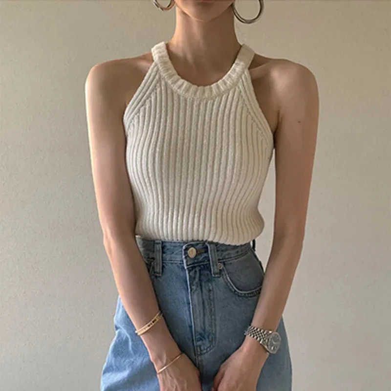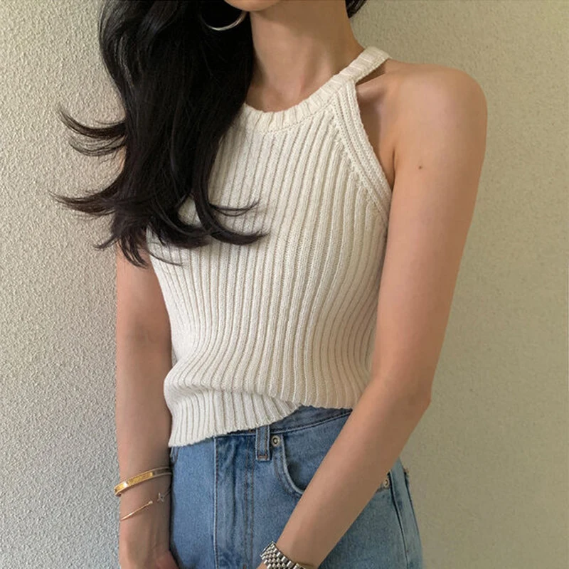 Bxoxo Elegant Slim Knitted Camis for Women Summer Korean Chic O Neck Sleeveless Tank Y2K Solid Simple Basic All Match Vest Mujer