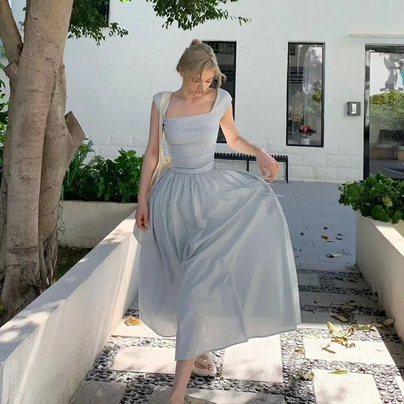 Bxoxo Elegant Stitching Dress Female Korean Chic Square Collar Short Sleeve Beach Party Dress Ladies High Waist All-Match A Line Dress