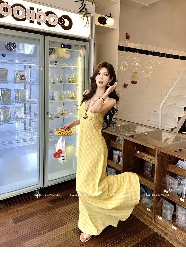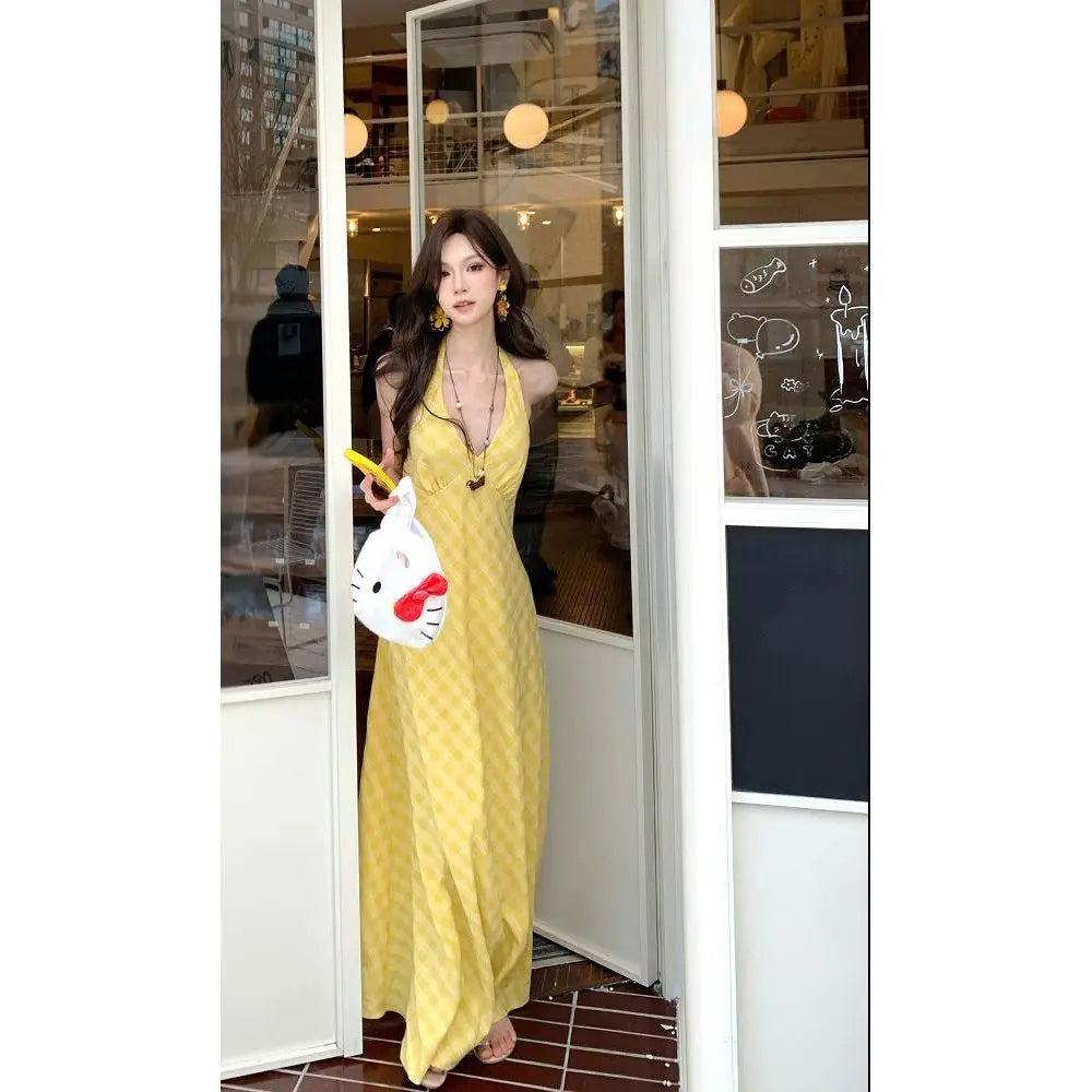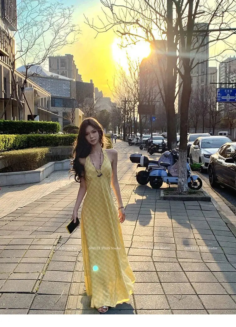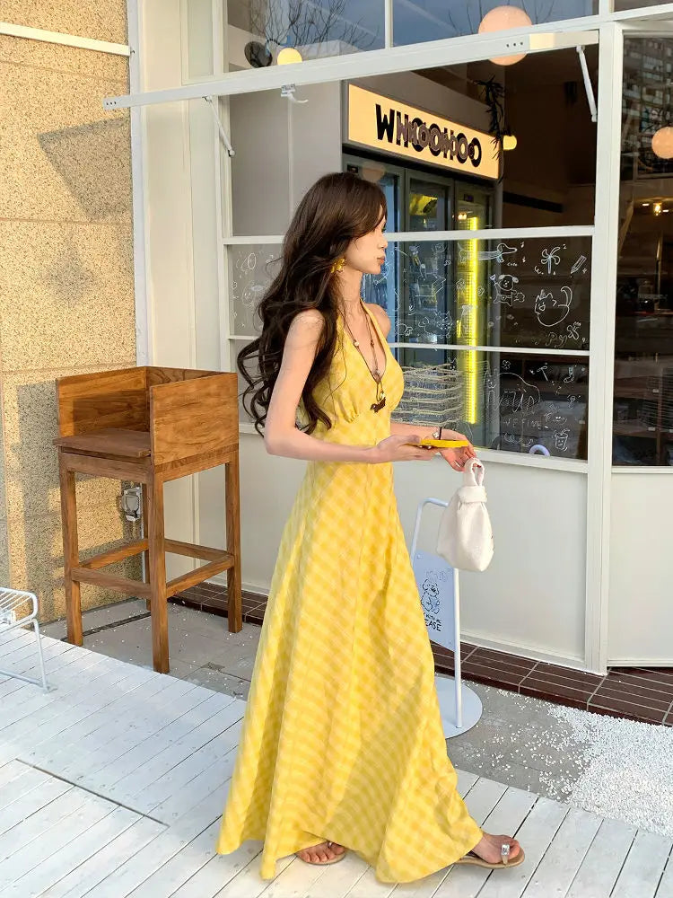Bxoxo Elegant Sweet V-neck Long Dress Women Butter Yellow Casual Sexy Beach Midi Dresses Korean Style Lace Up Dress Backless