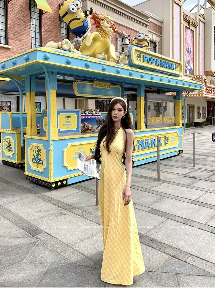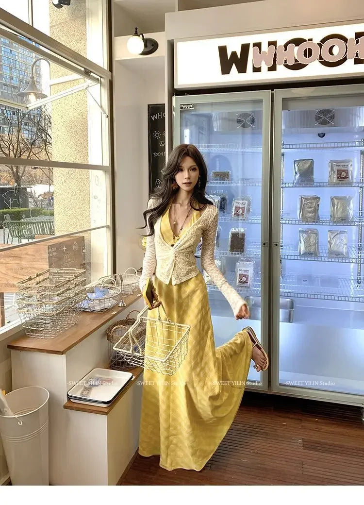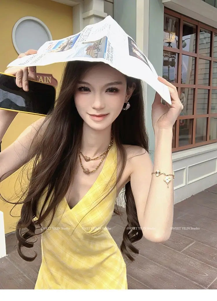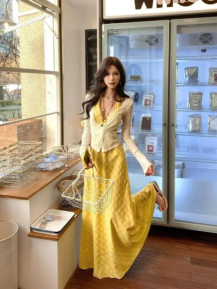 Bxoxo Elegant Sweet V-neck Long Dress Women Butter Yellow Casual Sexy Beach Midi Dresses Korean Style Lace Up Dress Backless