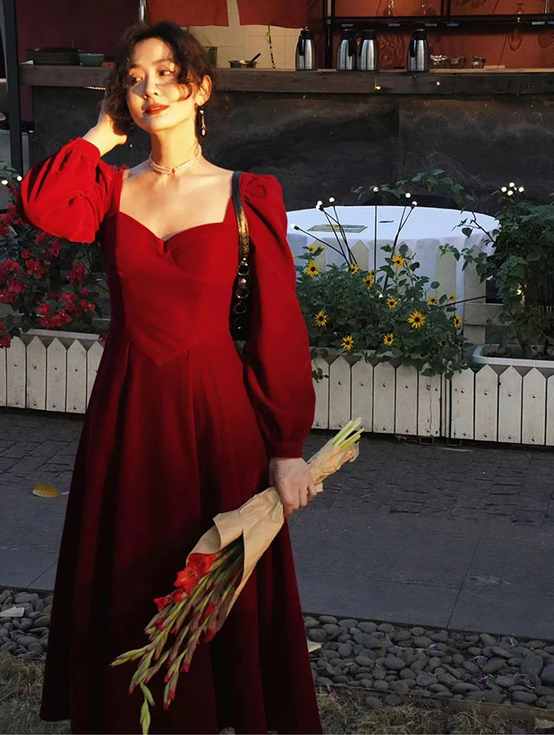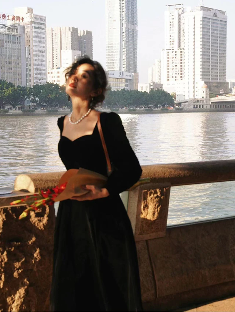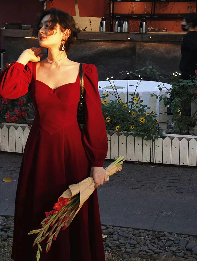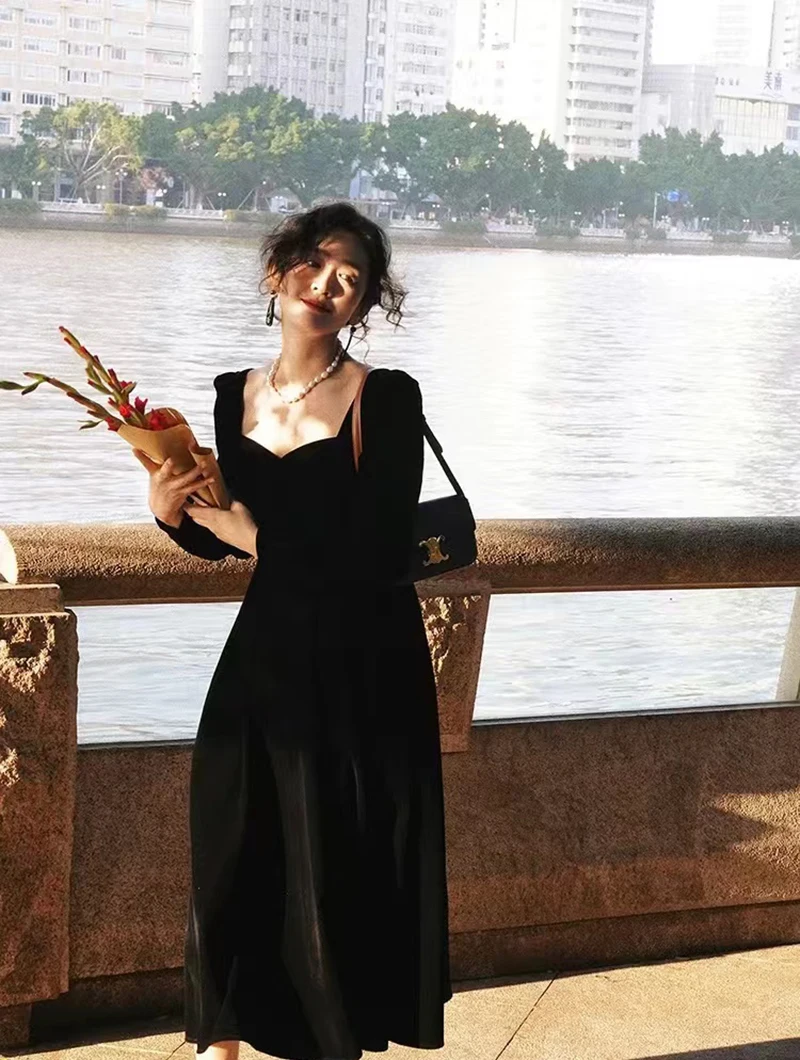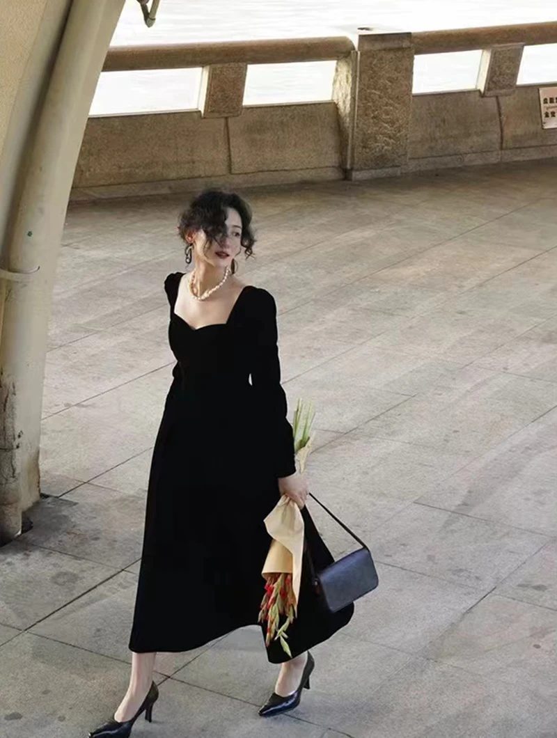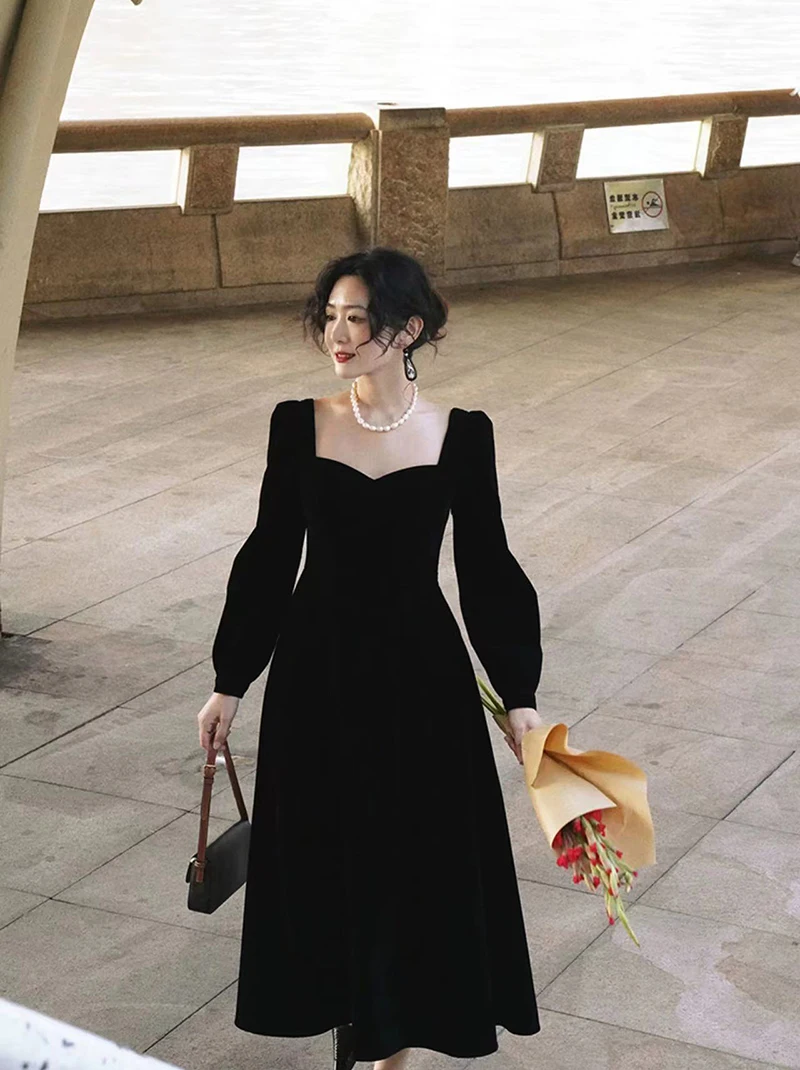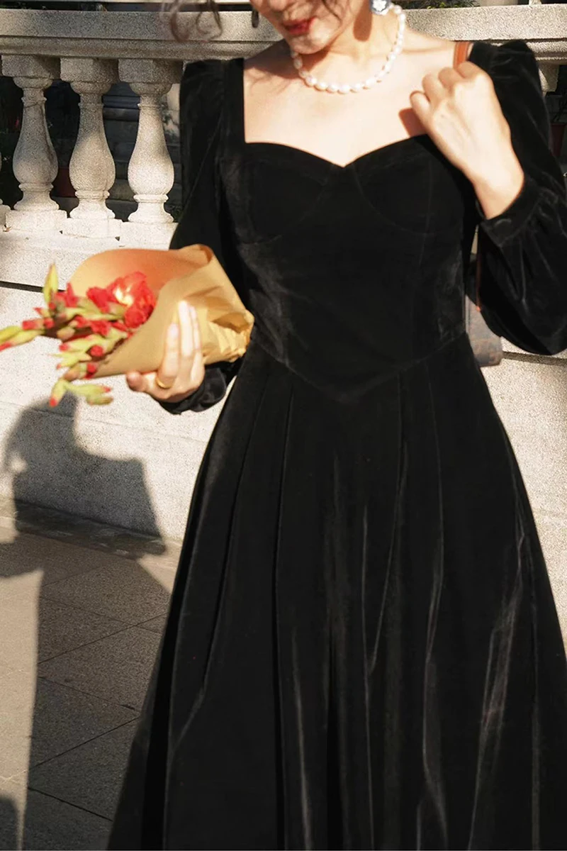 Bxoxo Elegant Velvet Midi Dress Women Vintage Korean Slim V Neck A Line Fairy Dress Female Autumn Long Sleeve All-Match Party Vestidos