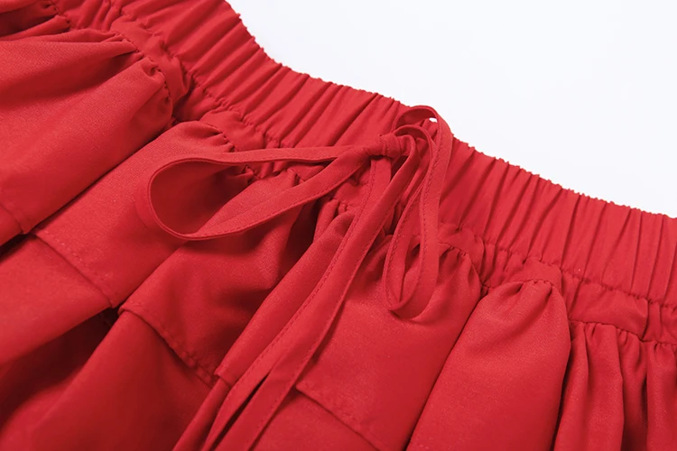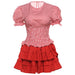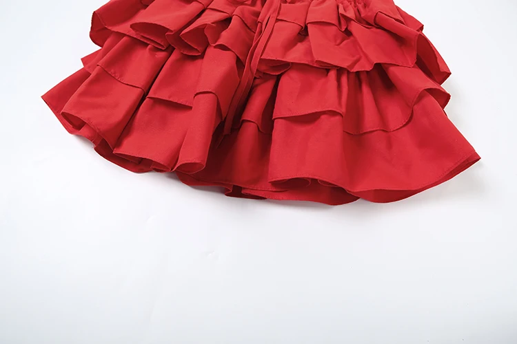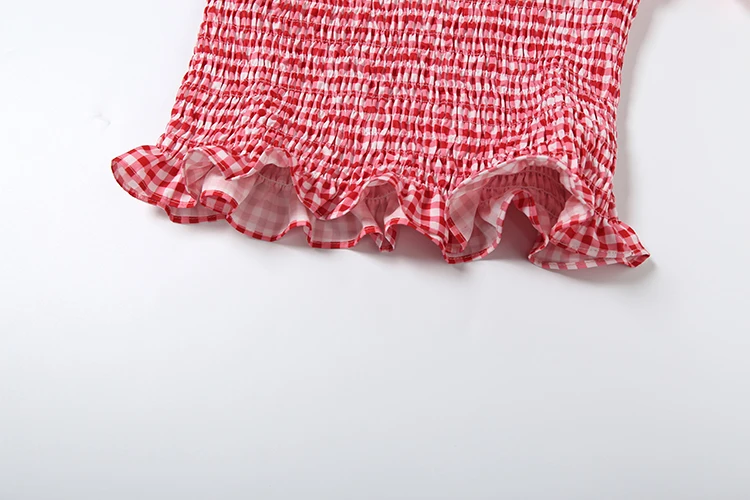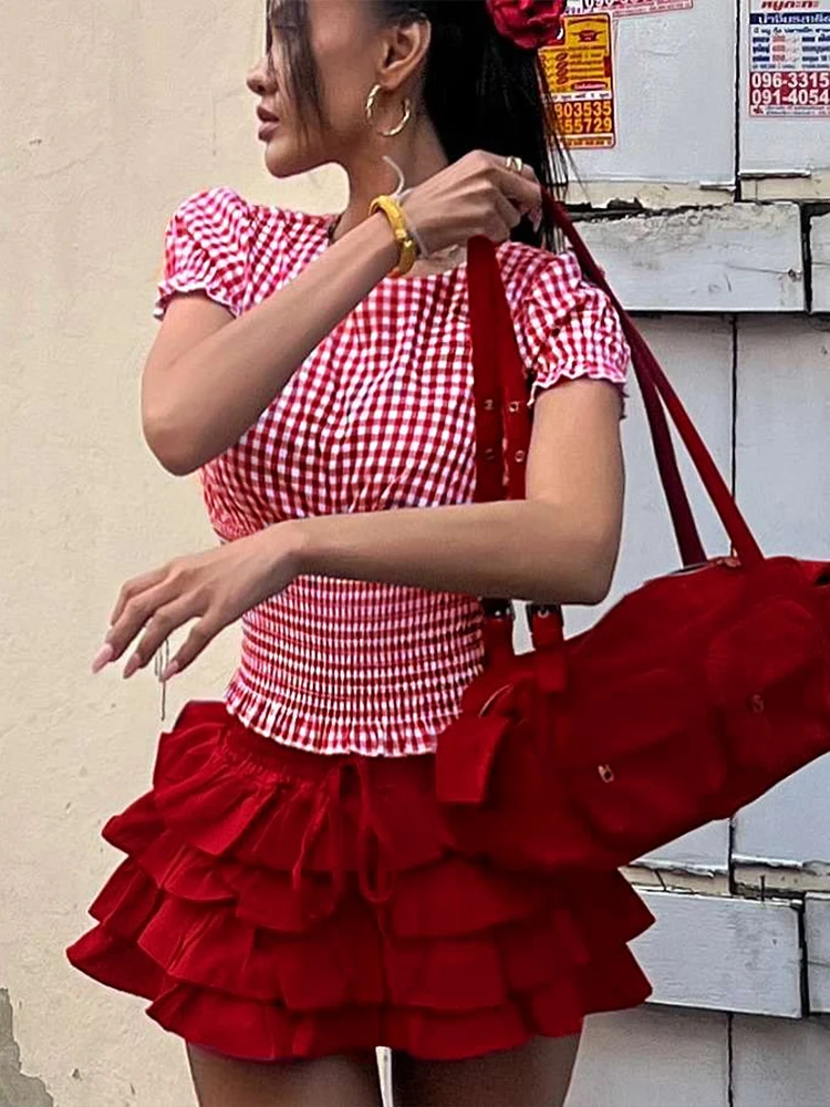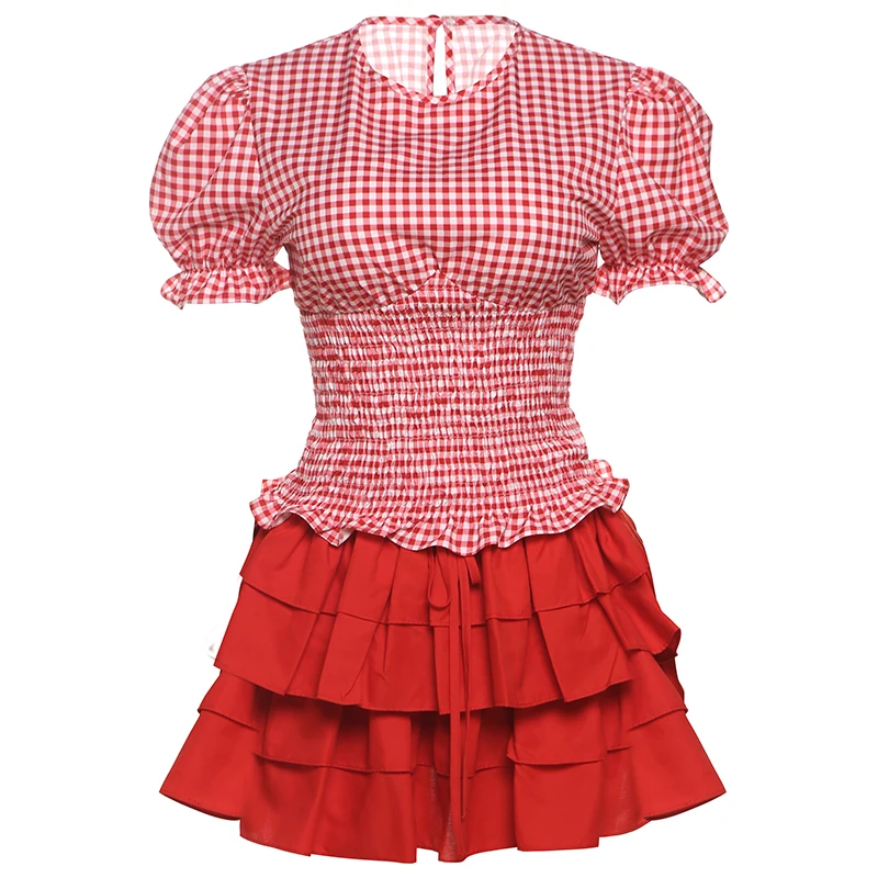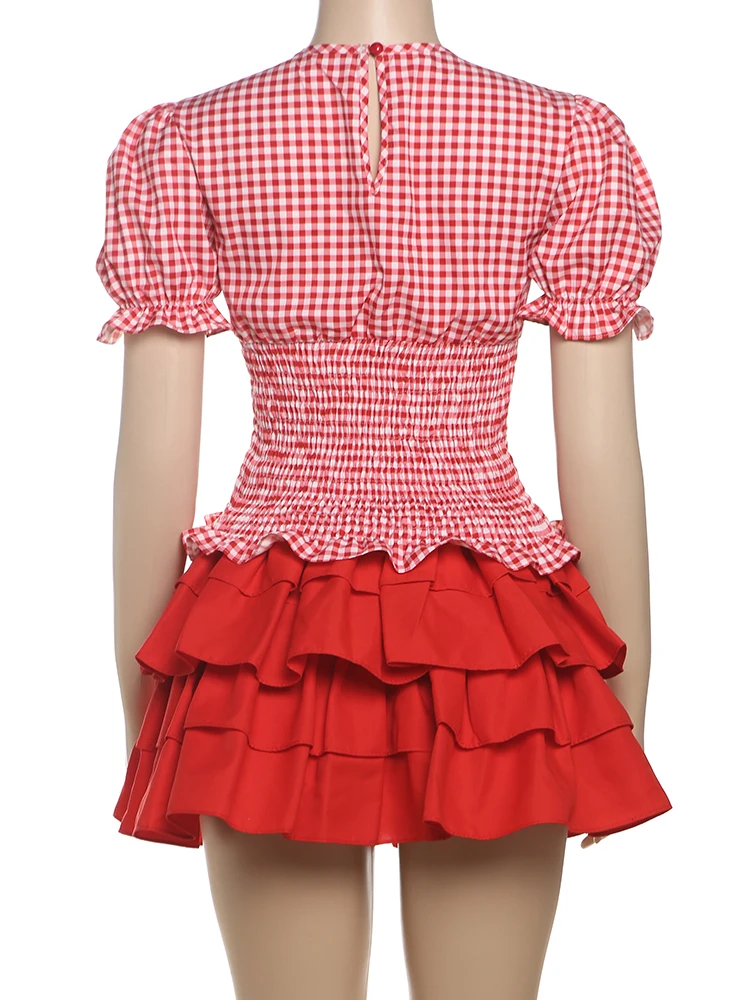 BXOXO Fashion 2-Piece Set Women Plaid Folds Puff Sleeves o-Neck Tops+Multi-Layered Bandage Ruffles Puffy Skirt Matching Suit
