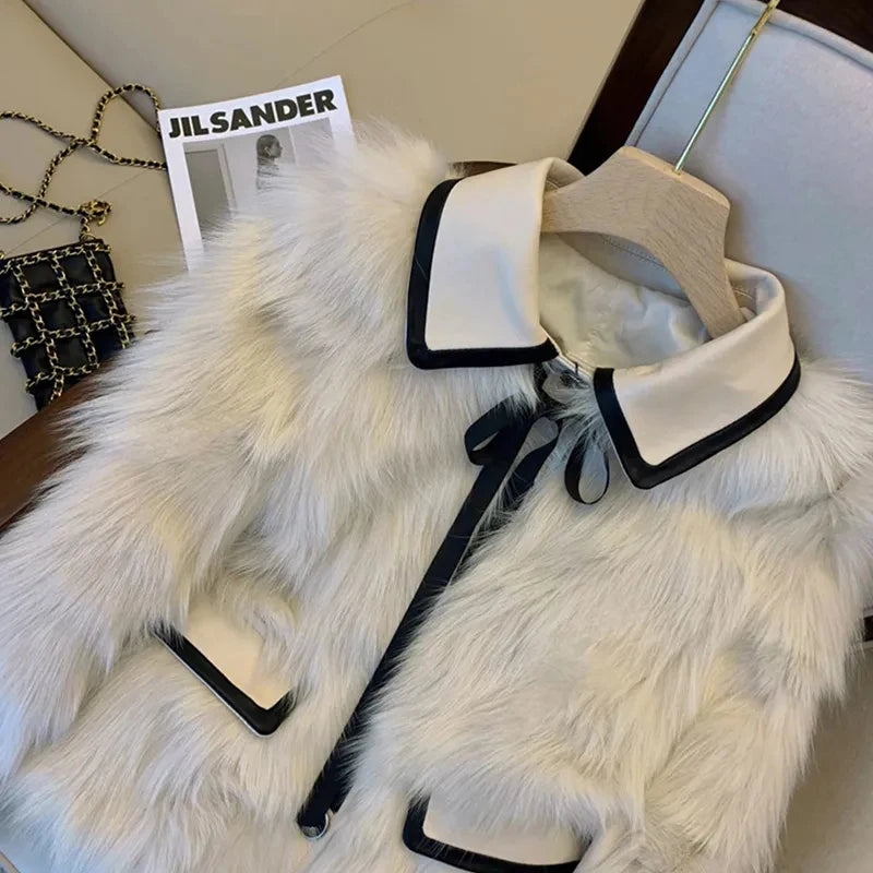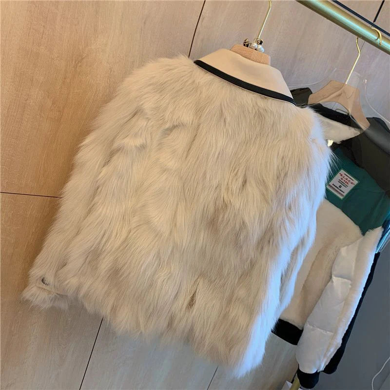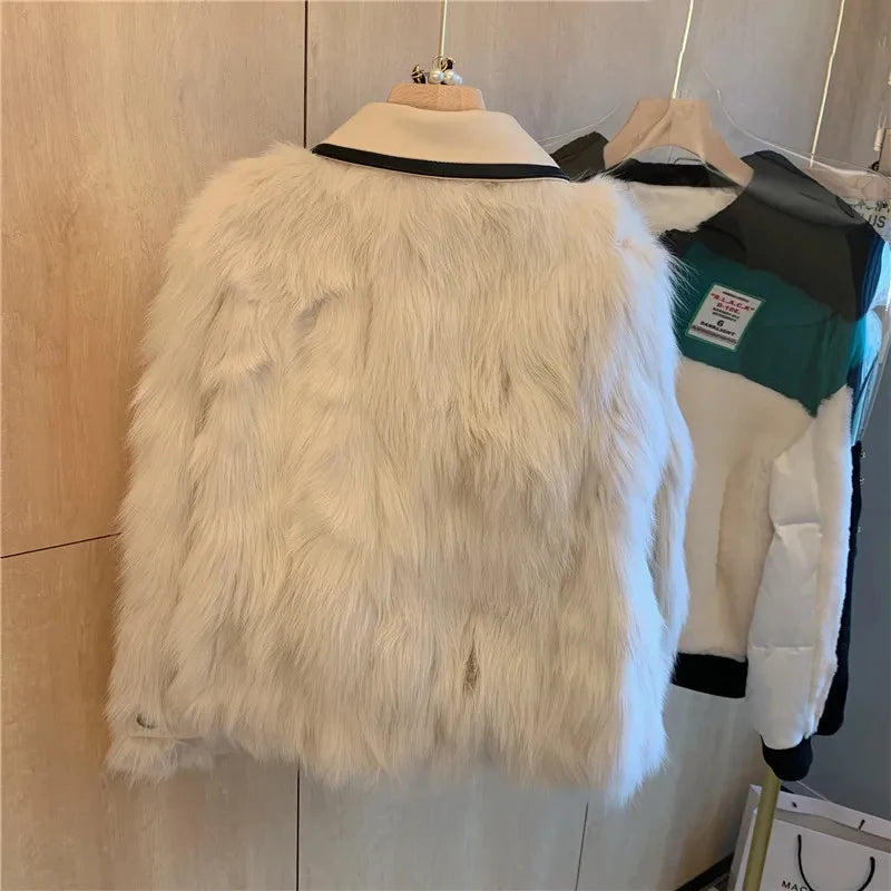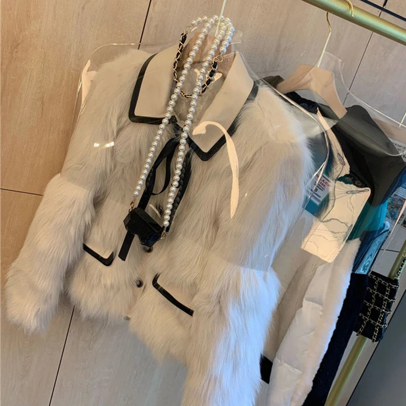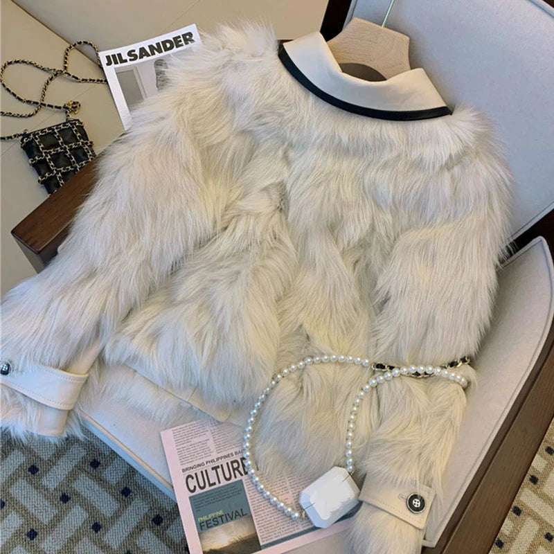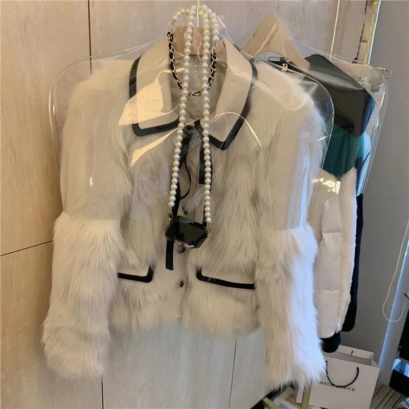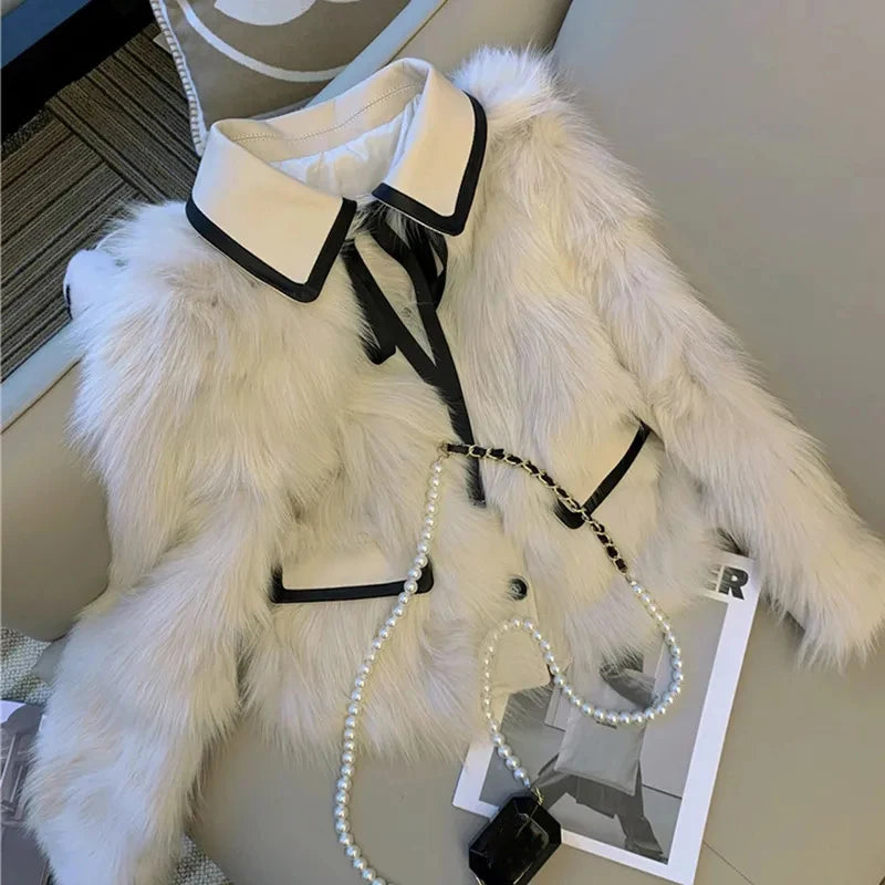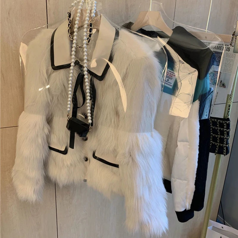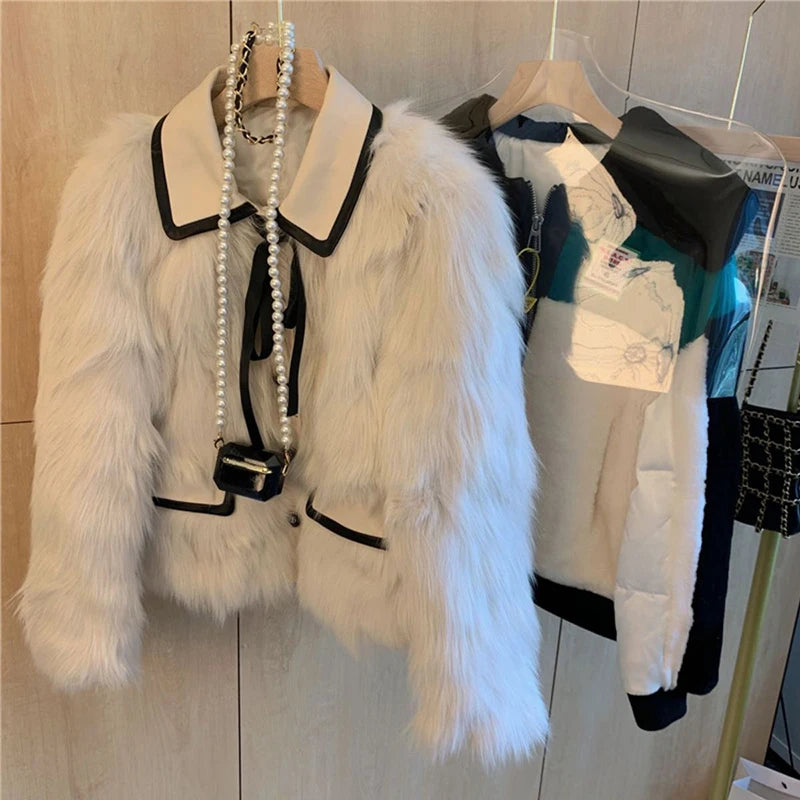 Bxoxo Fashion Faux Fox Fur Women Coat Y2K Korean Chic Patchwork Single Breasted Crop Jacket Winter Warm Elegant Bow Fluffy Outerwear