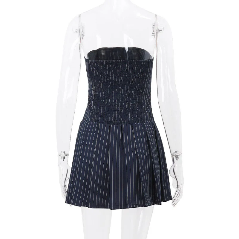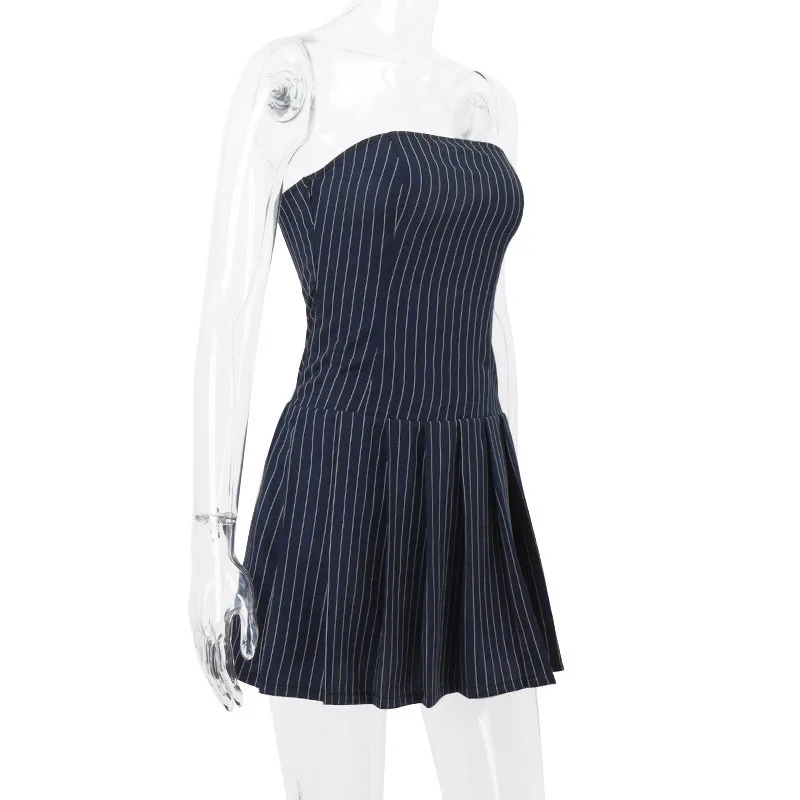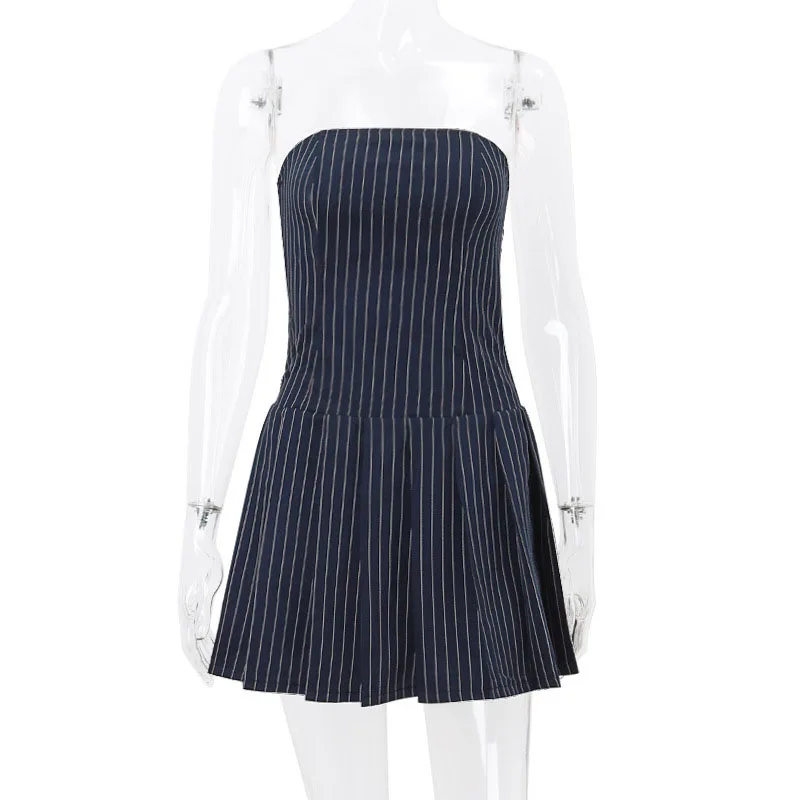 Bxoxo Fashion Stripe Slash Neck Dress Women Y2K Sleeveless Slim Splicing Pleated Dress Sexy Chest Wrap Off Shoulder Mini Vestidos New