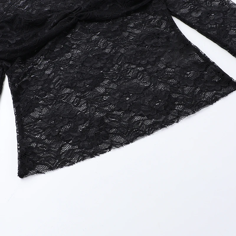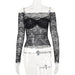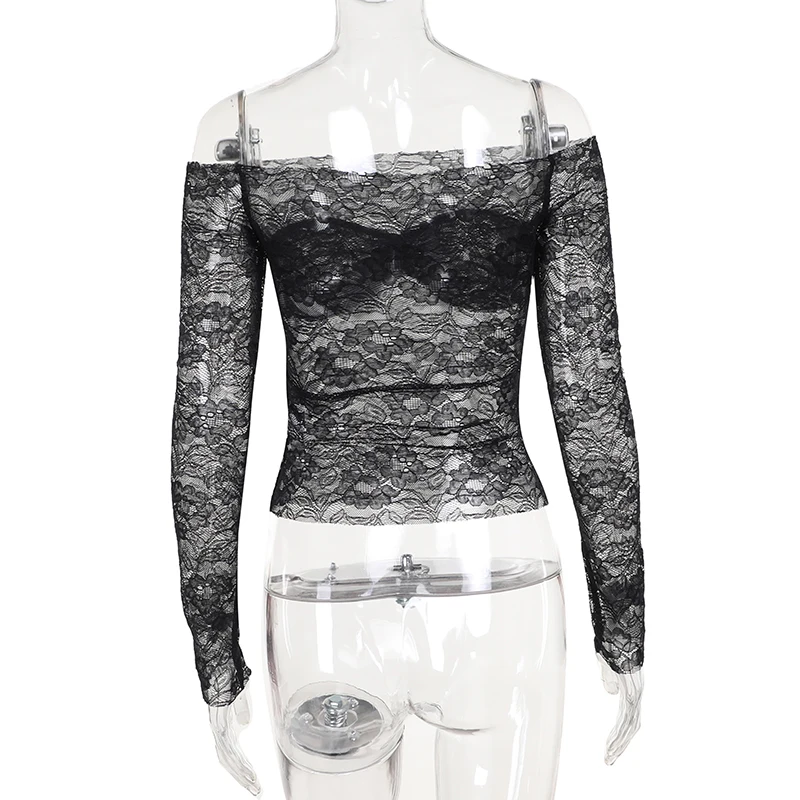BXOXO Floral Lace Sheer Off-Shoulder Crop Tops Women Trendy Ruched Sheer Long Sleeves T-shirts Fall Blouses Tees Streetwear
